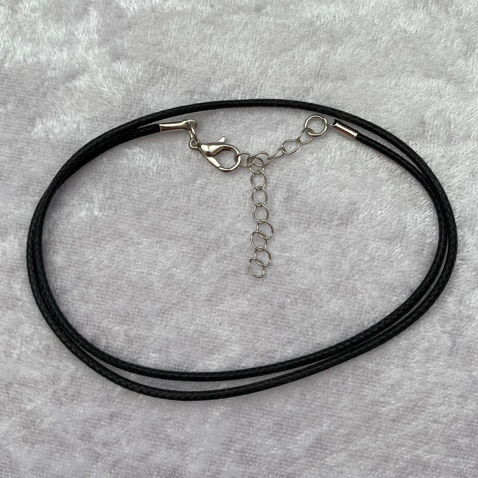 A simple black faux leather fabric cord measuring 18 inches and closing with a chain link lobster clasp. Perfect for pendants.