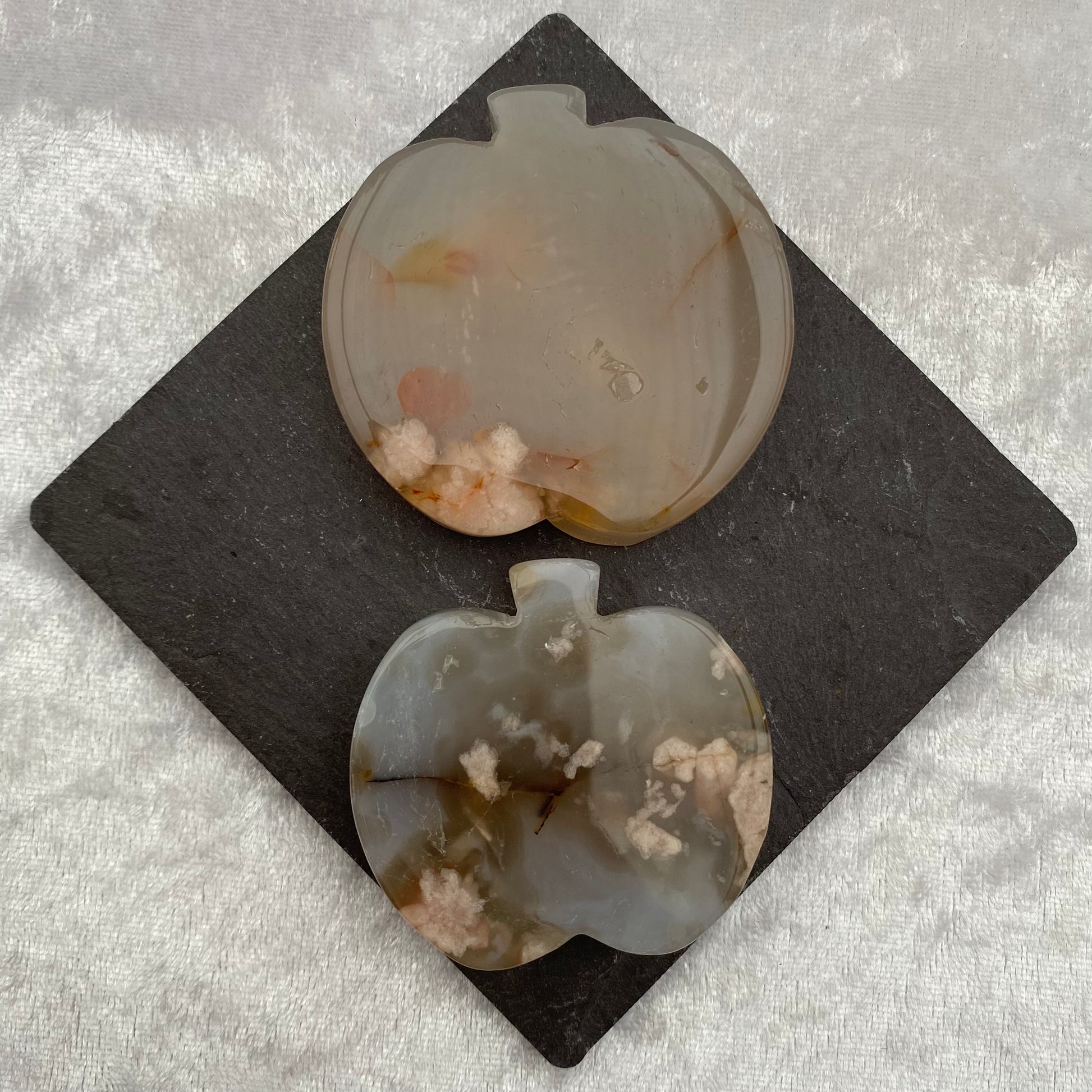 Flower agate is a formation of agate that contains plumes of white-pink, opaque chalcedony formations that are scattered throughout.