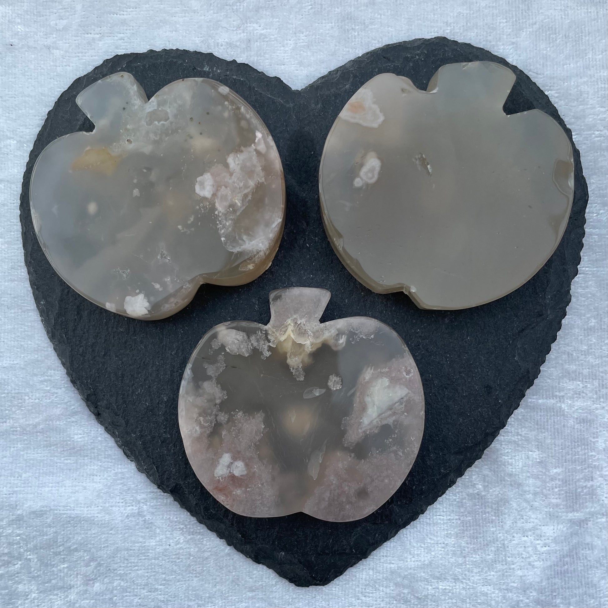 Flower agate is a formation of agate that contains plumes of white-pink, opaque chalcedony formations that are scattered throughout.