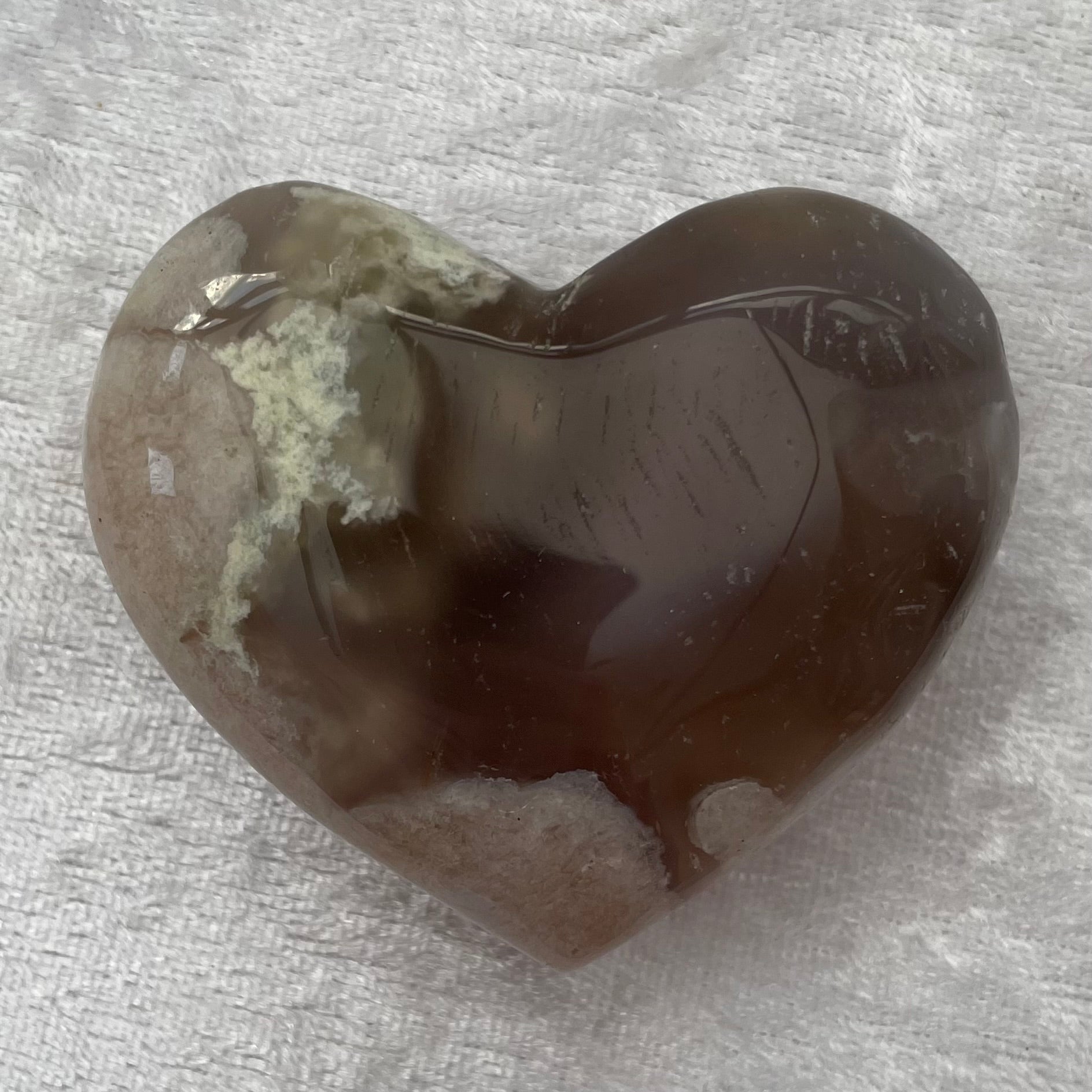Flower agate is a formation of agate that contains plumes of white-pink, opaque chalcedony formations that are scattered throughout.