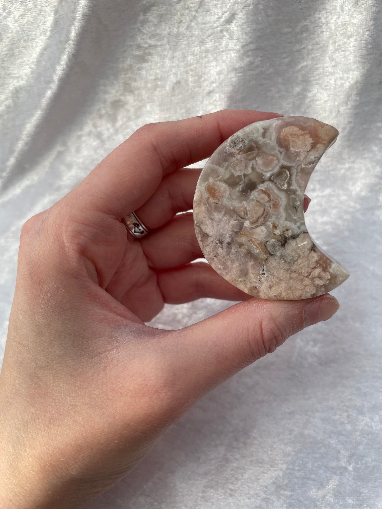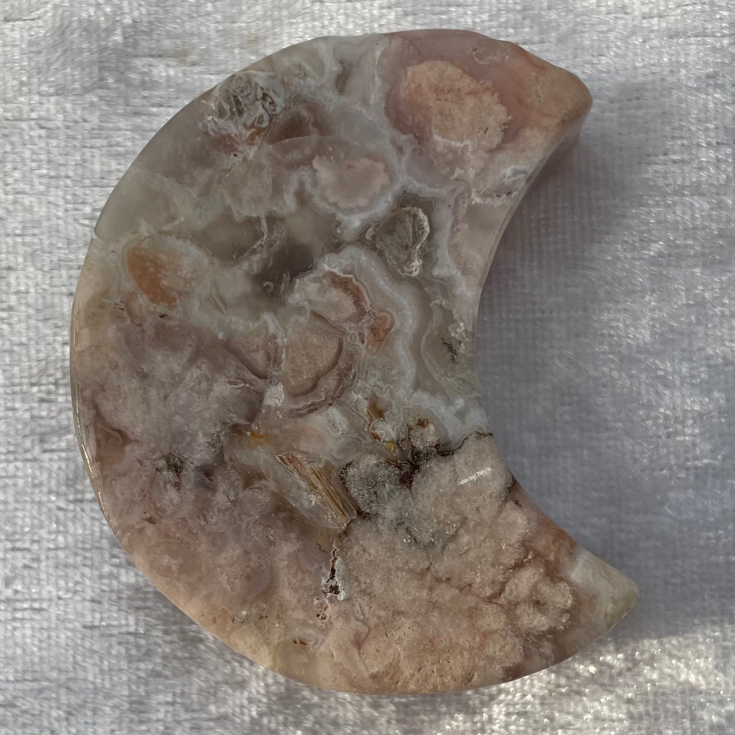 Flower agate is a formation of agate that contains plumes of white-pink, opaque chalcedony formations that are scattered throughout.