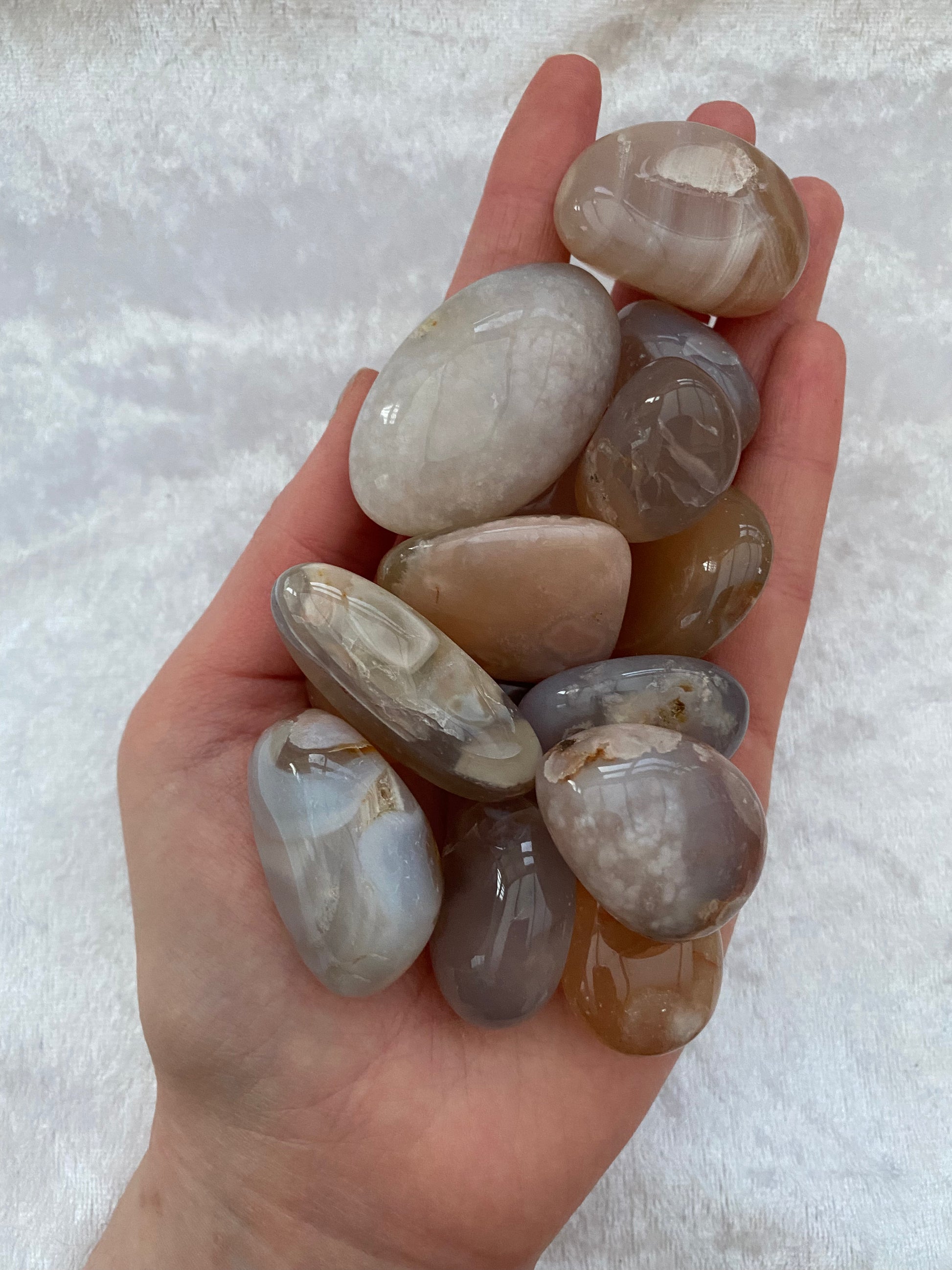 Flower agate is a formation of agate that contains plumes of white-pink, opaque chalcedony formations that are scattered throughout.