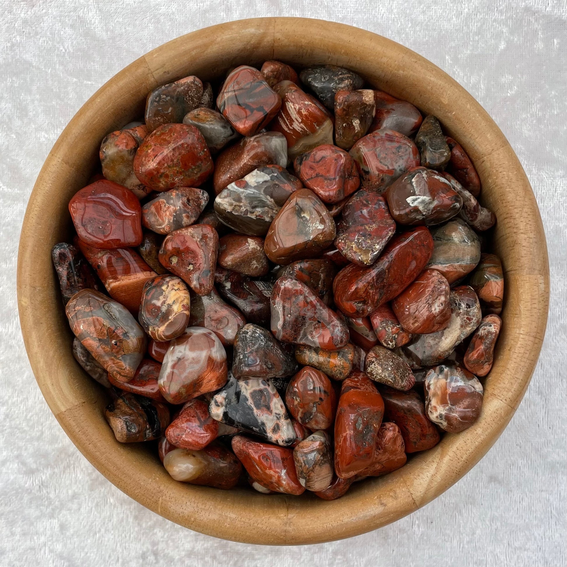 Brecciated jasper contains hematite which gives it both its red tones and the dark bands. Breccia means a rock composed of broken fragments cemented together into a fine-grained matrix.
