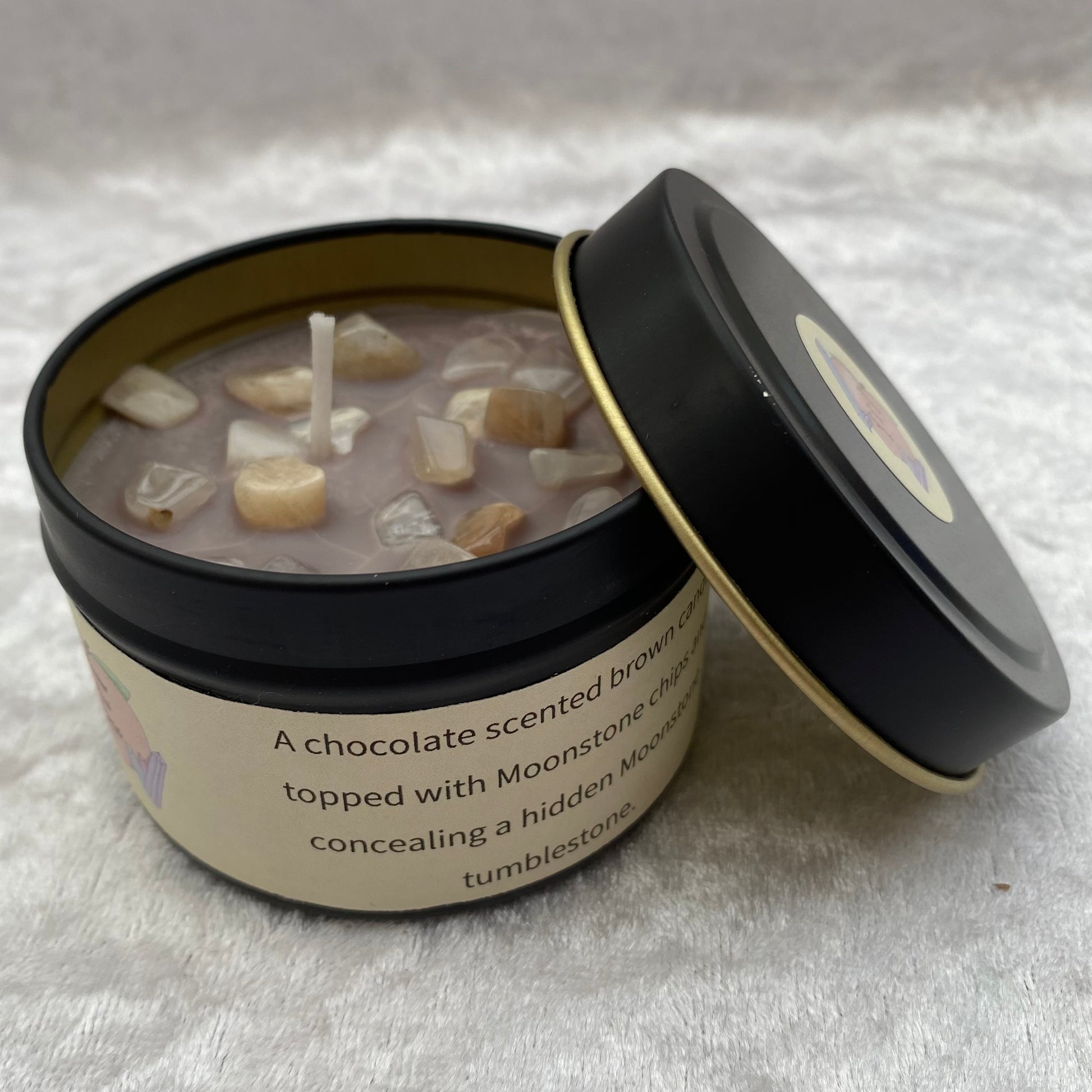 A chocolate scented brown candle topped with Moonstone chips and concealing a hidden Moonstone tumblestone to uncover as the candle burns.