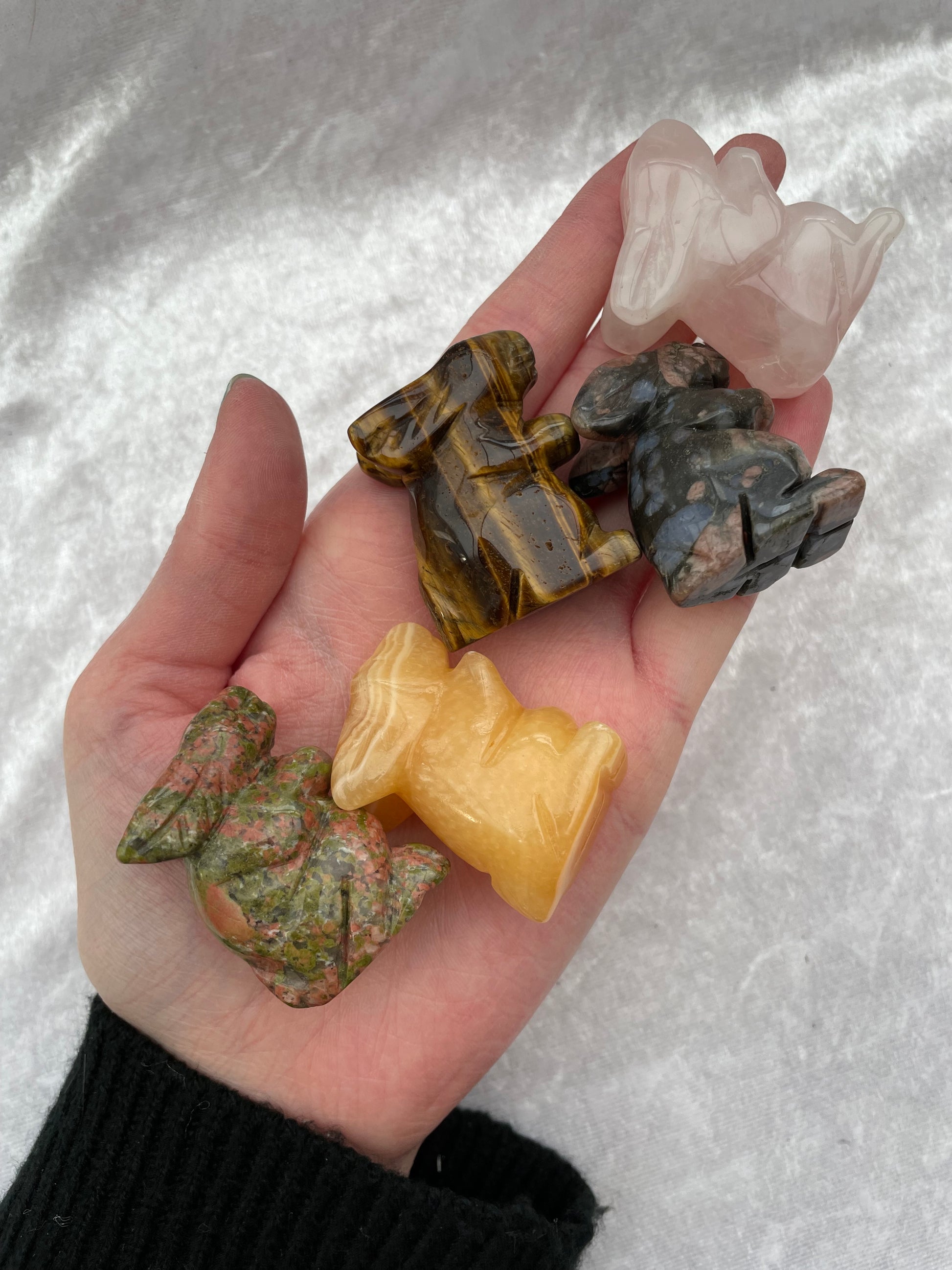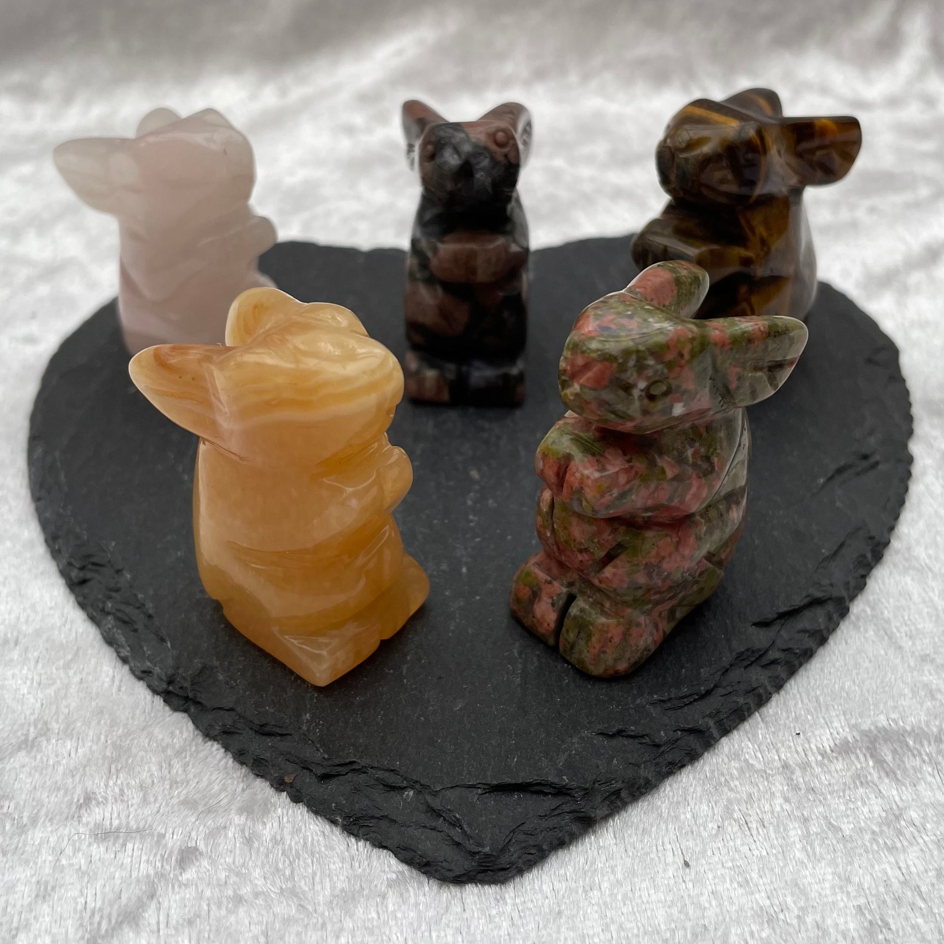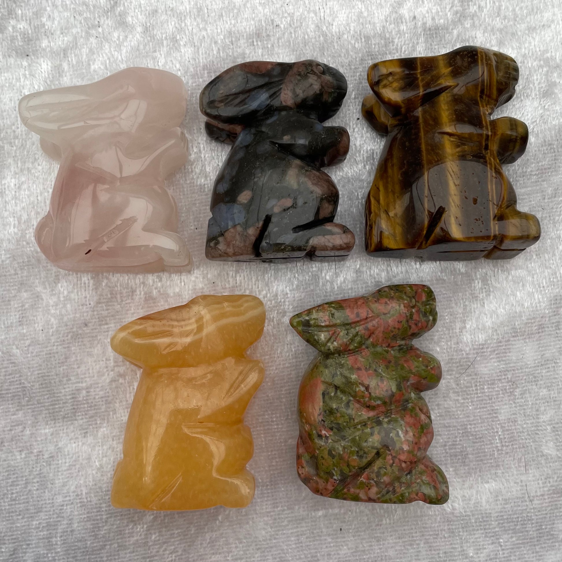 A selection of Crystal rabbit carvings including Que Sera, Unakite, Rose Quartz, Tigers Eye and Yellow Calcite.