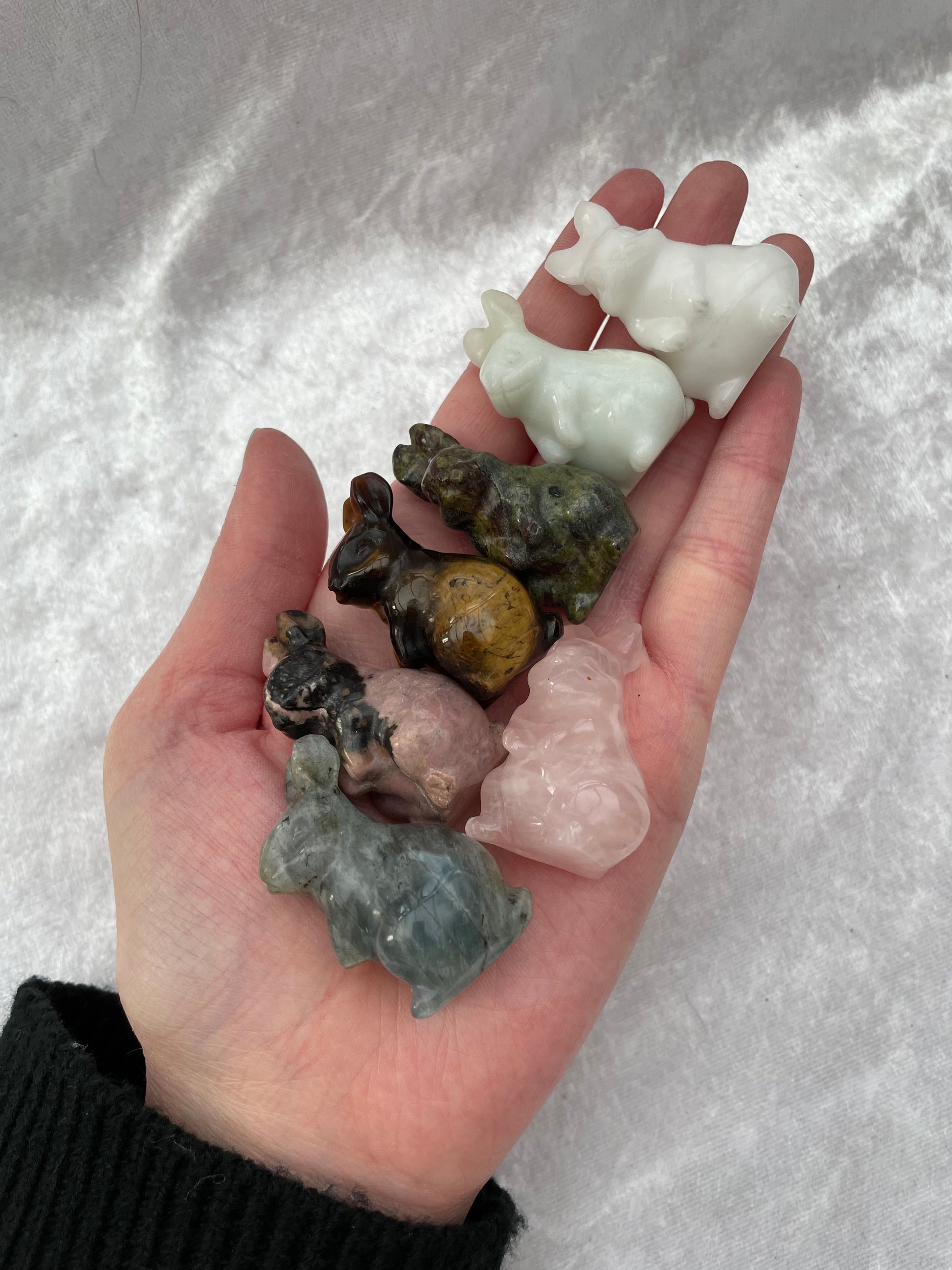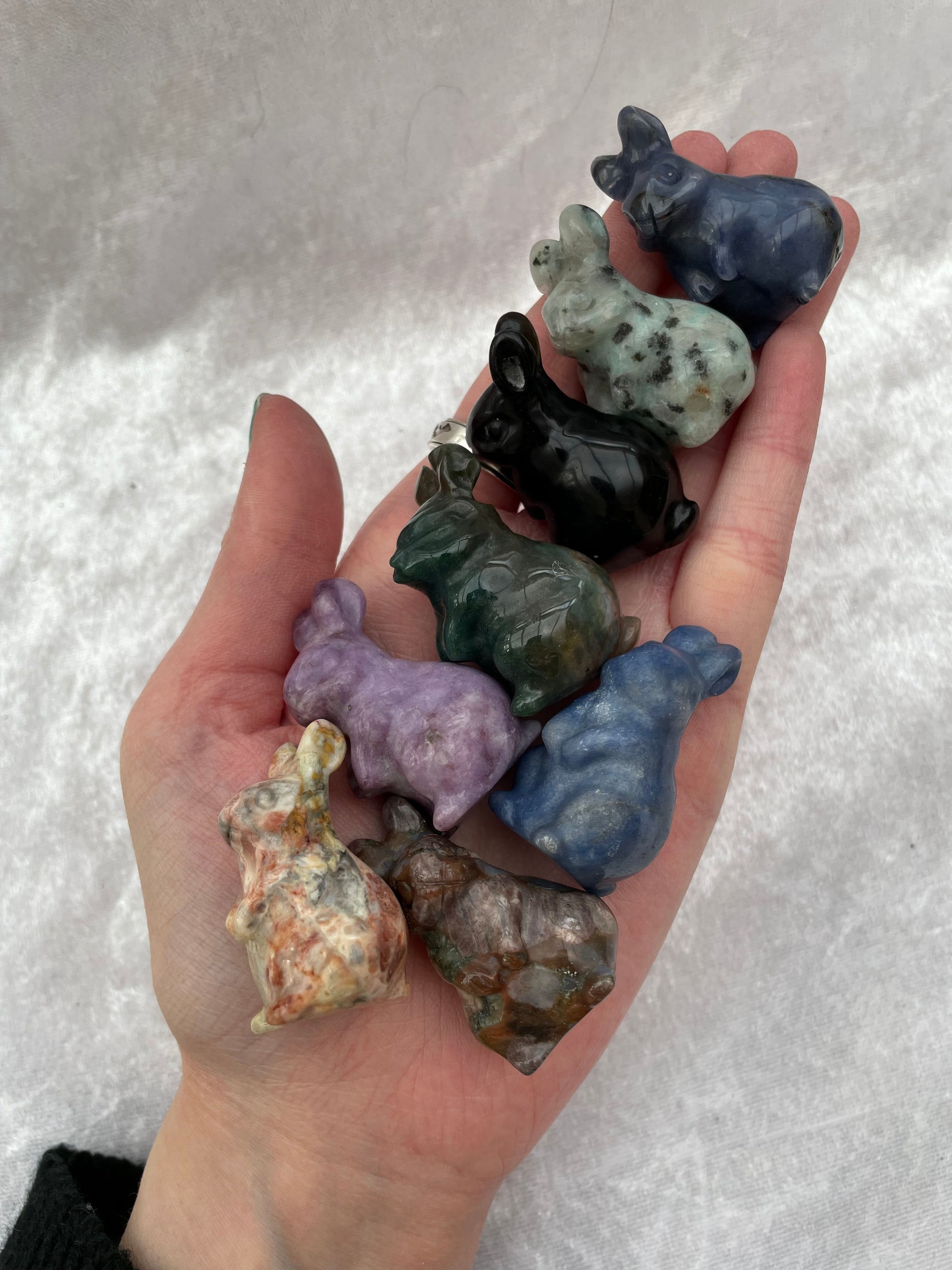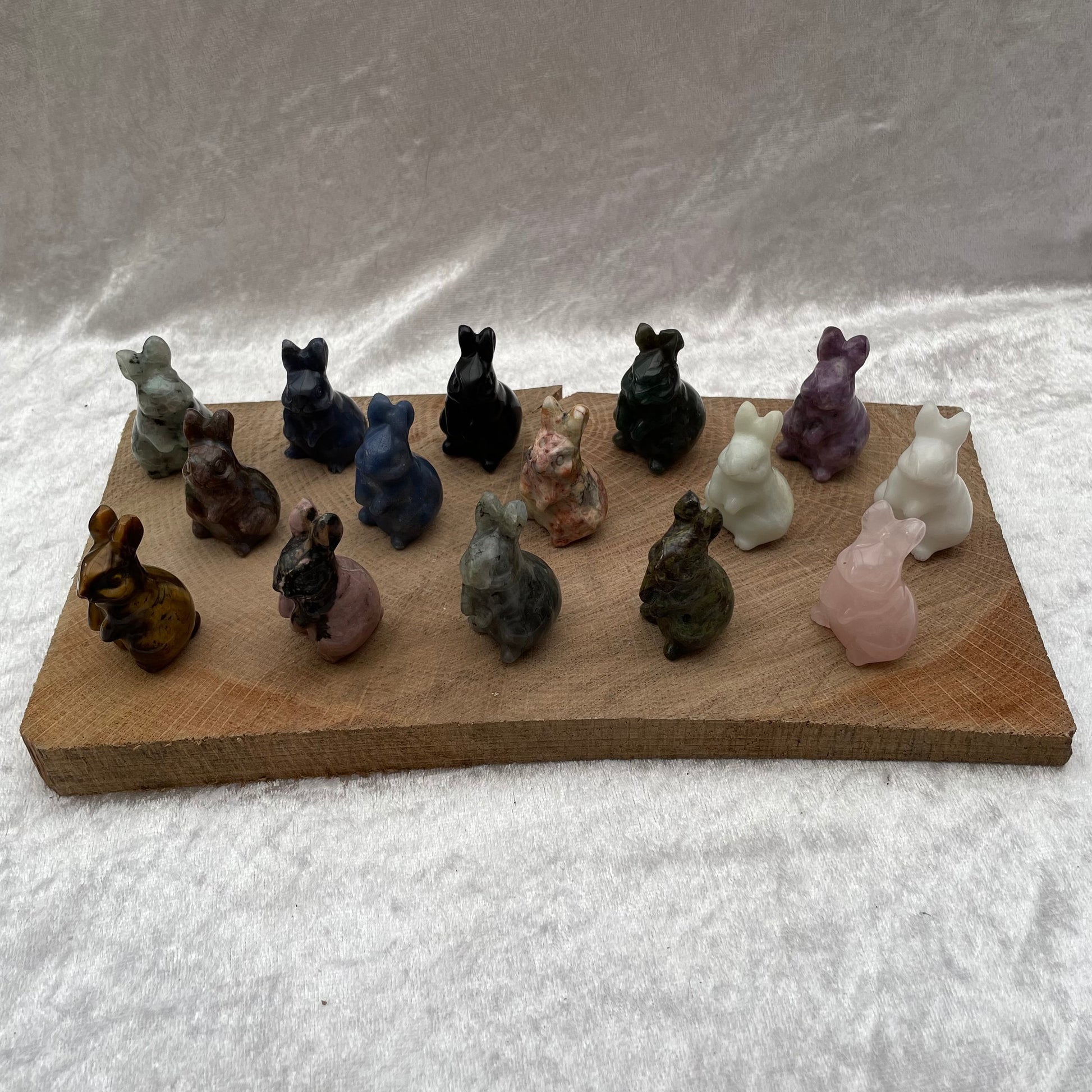 A selection of Crystal bunny rabbits including Tigers Eye, Kiwi Jasper, Lepidolite, Black Obsidian, Milky Quartz, Blue Quartz, Que Sera, New Jade, Rose Quartz, Dragons Blood Jasper, Moss Agate, Rhodonite and Crazy Lace Agate.