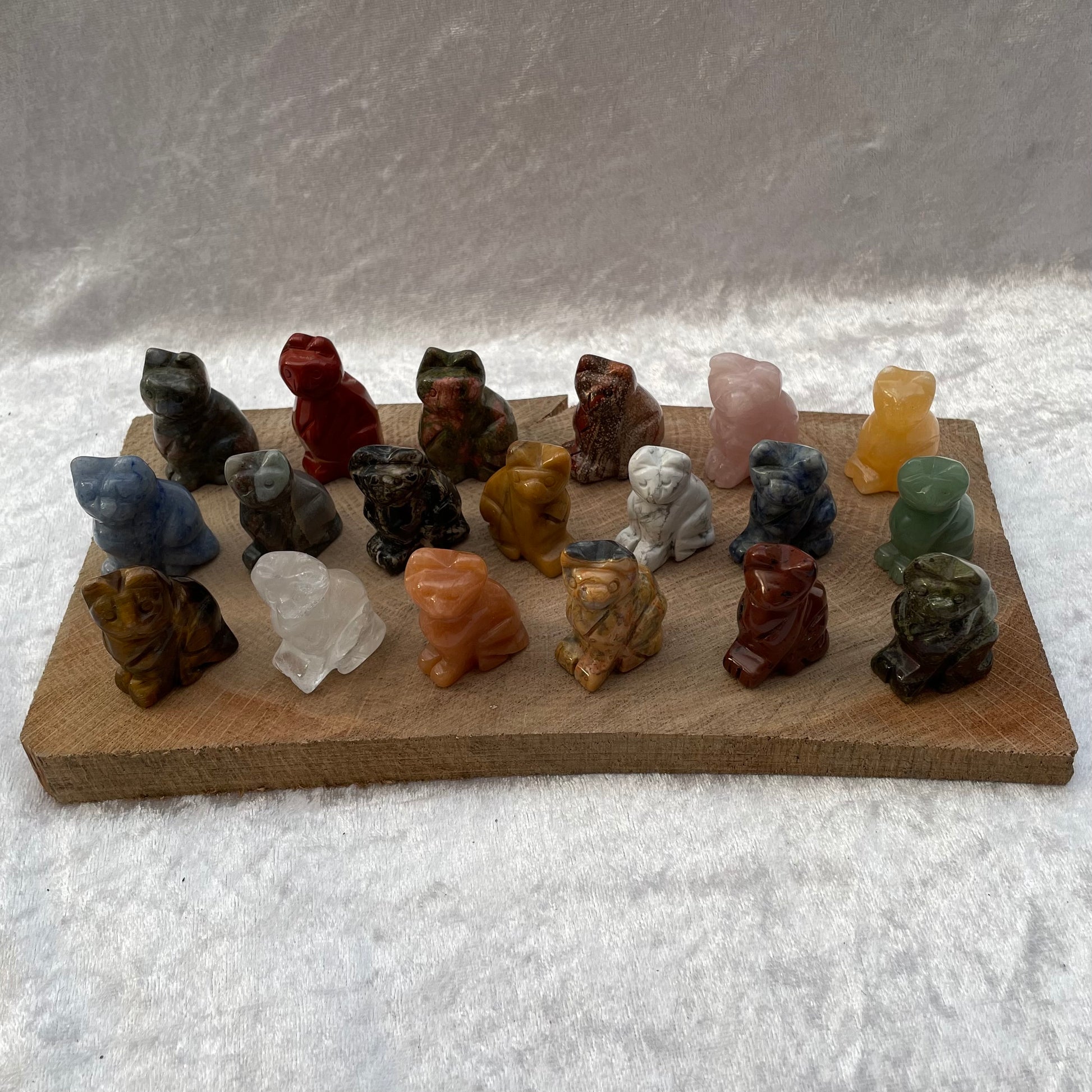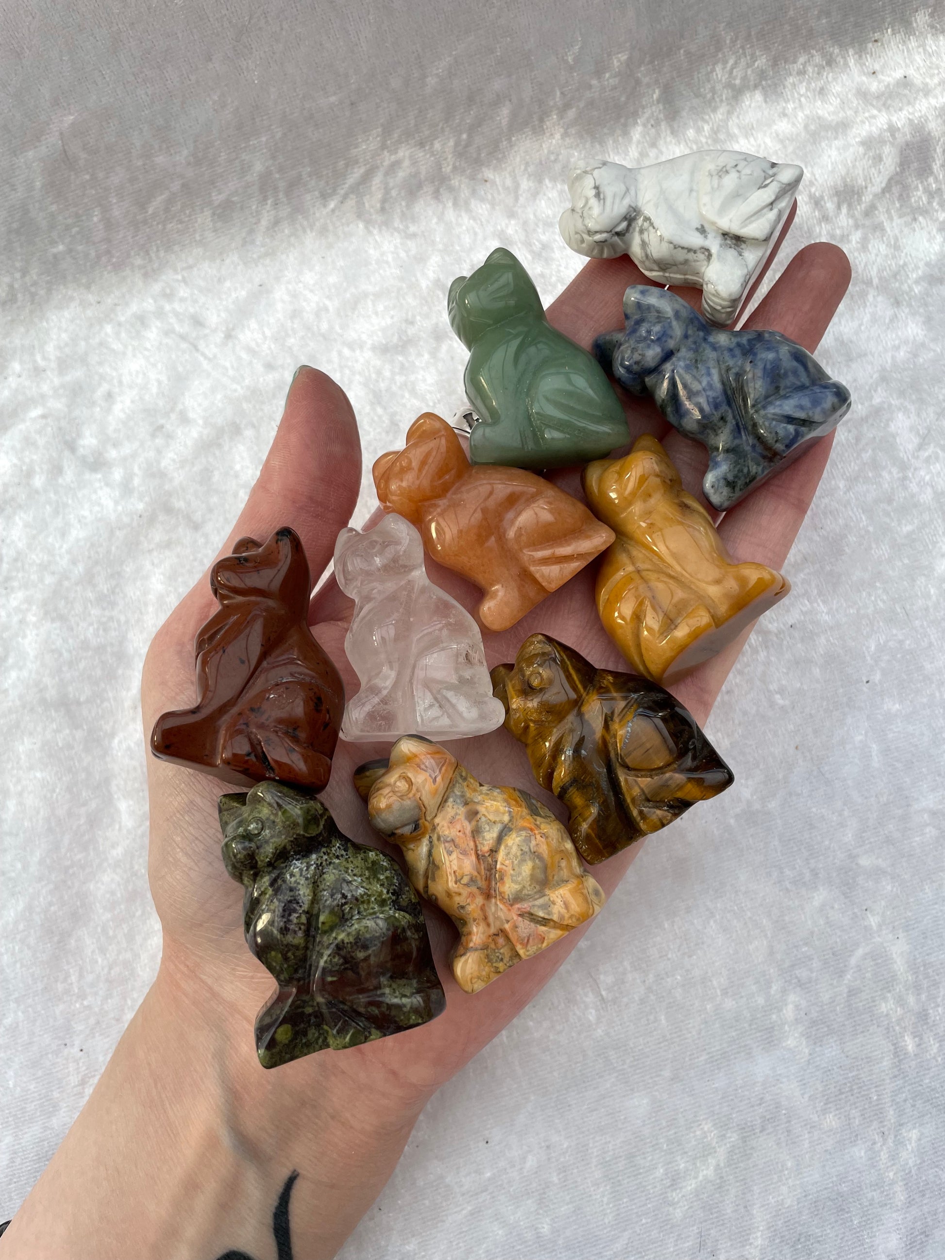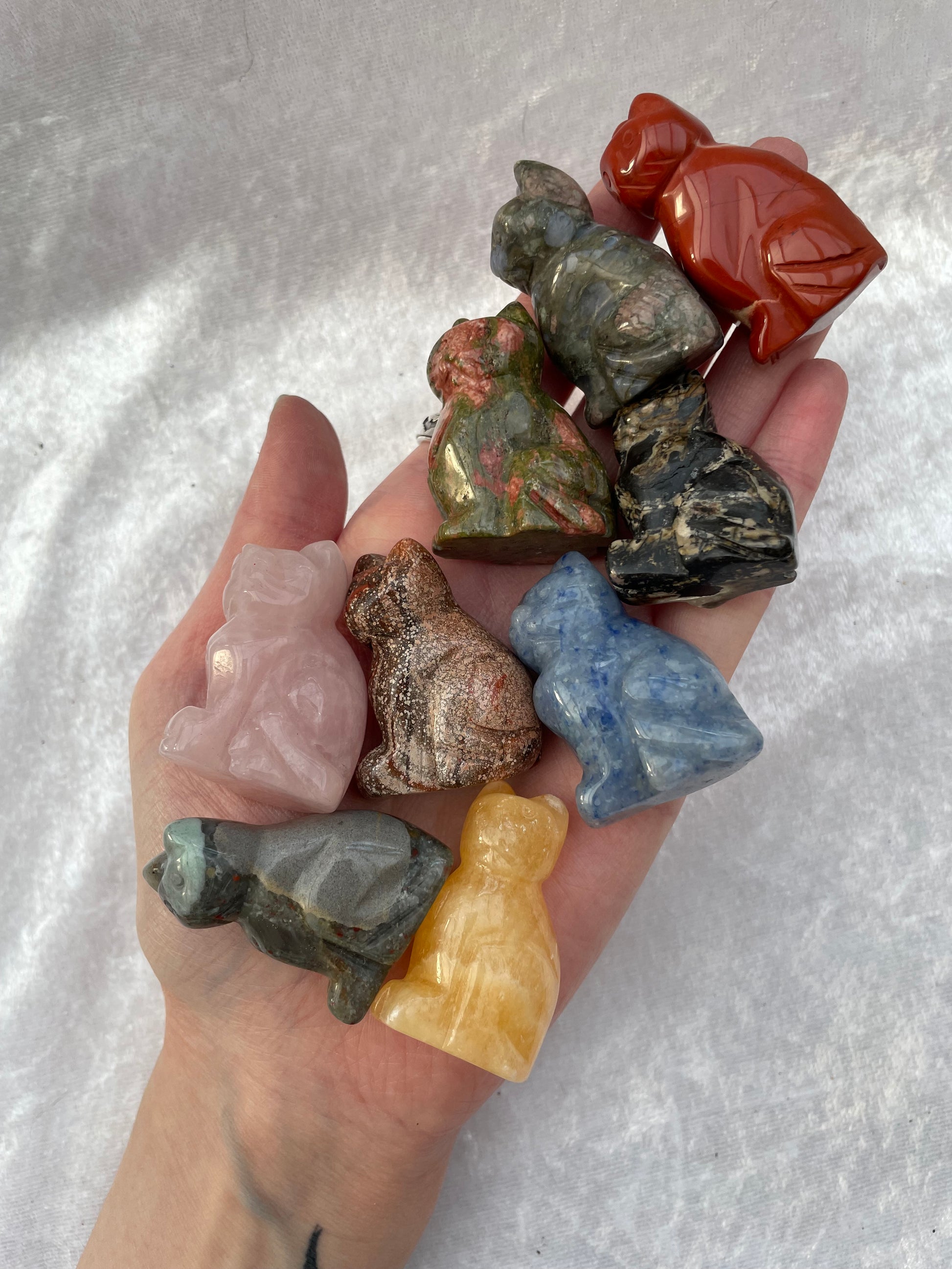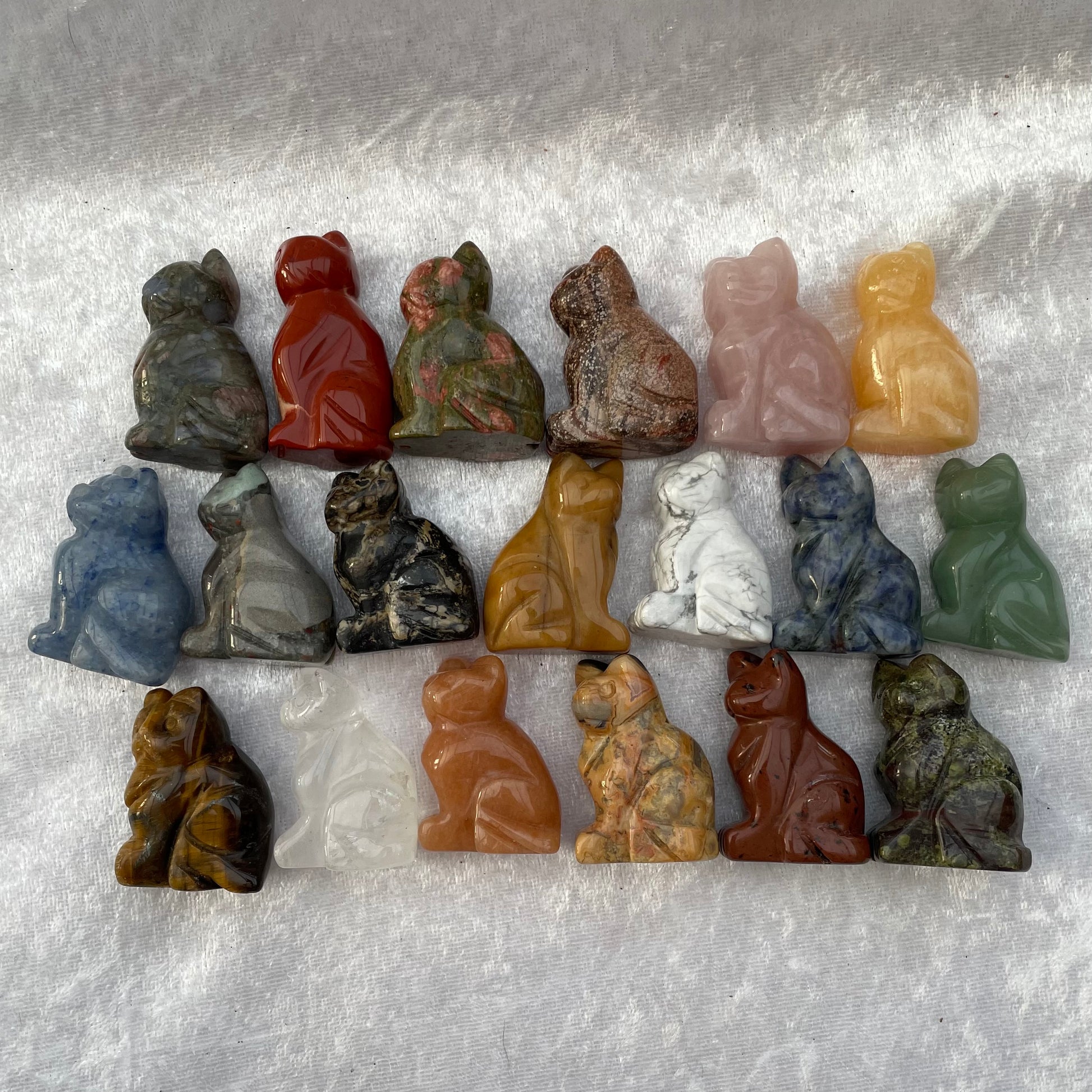 A selection of Crystal cat carvings including Red Jasper, Brecciated Jasper, Clear Quartz, Dragons blood jasper, Crazy Lace Agate, Mahogany Obsidian, Green Aventurine, Que Sera, Rose Quartz, Yellow Calcite, Unakite, Tigers Eye, Peach Aventurine, White Howlite, Seftonite, Sodalite, Blue Quartz, Rhodonite and Yellow Jasper.