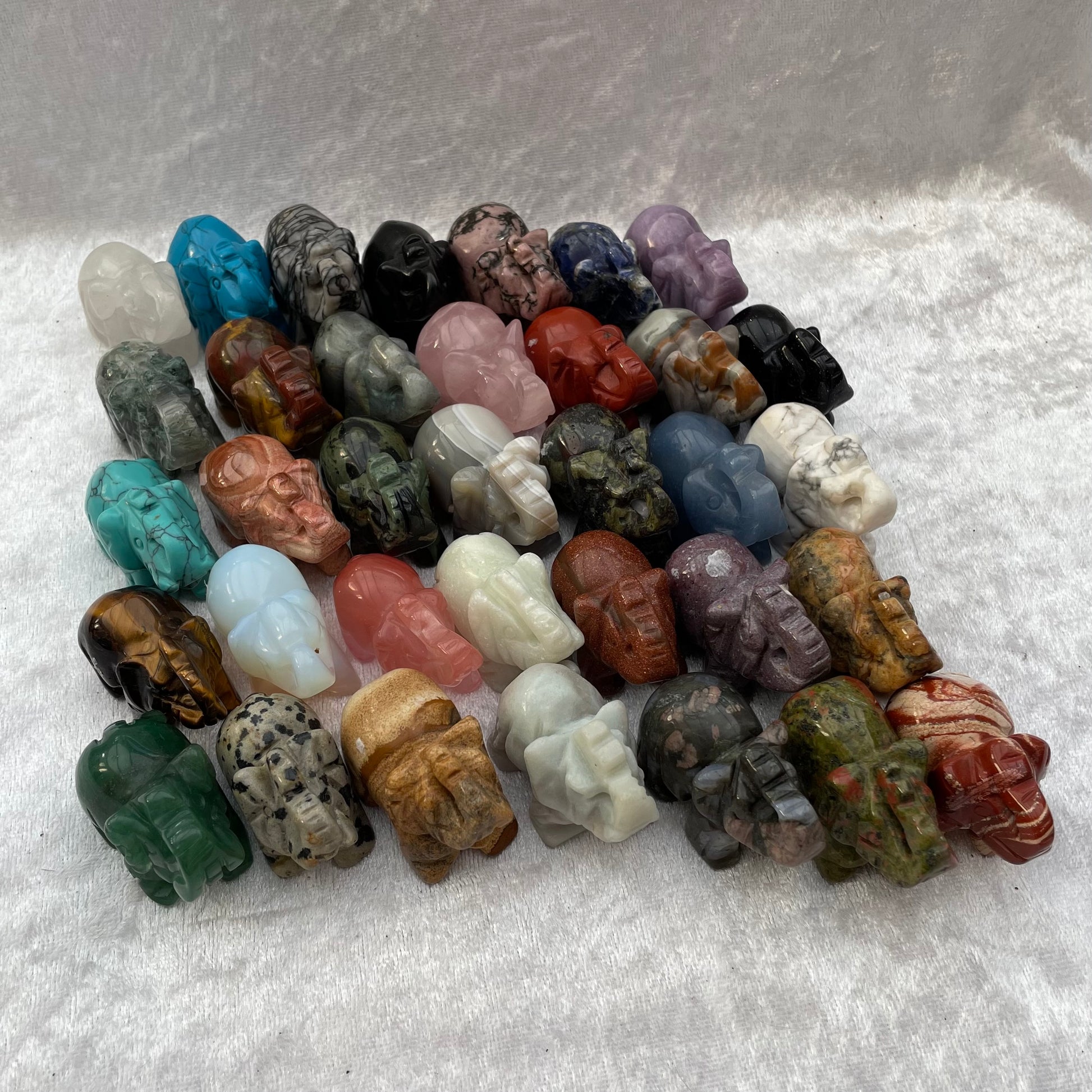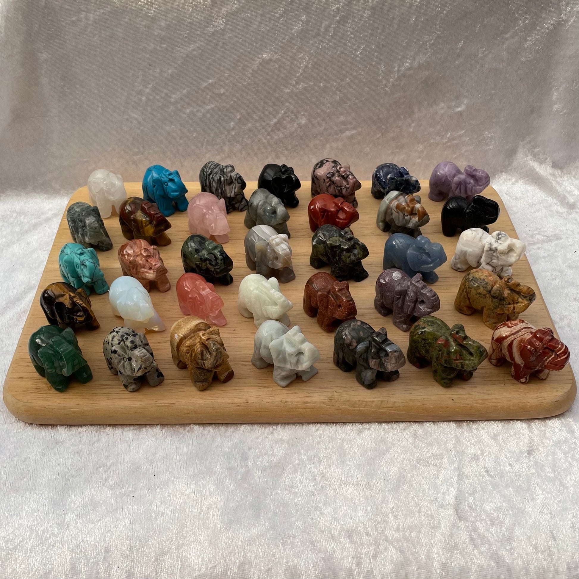 A selection of Crystal elephants including Labradorite, Que Sera, Picture Jasper, Unakite, Tigers Eye, White Howlite, Sodalite, Smelt, Red Jasper, Dark Blue Howlite, Light Blue Howlite, Lepidolite, Opalite, Crazy Lace Agate, Red Jasper, Rhodonite, Blue Quartz, Net Jasper, Kambaba Jasper, Clear Quartz, Dragons Blood Jasper, Rose Quartz, New Jade, Amazonite, Dalmatian Jasper, Black Obsidian, Brecciated Jasper, Ocean Jasper, Green Aventurine, Goldstone, Blue Goldstone, Picasso Jasper, Moss Agate and Grey Agate.