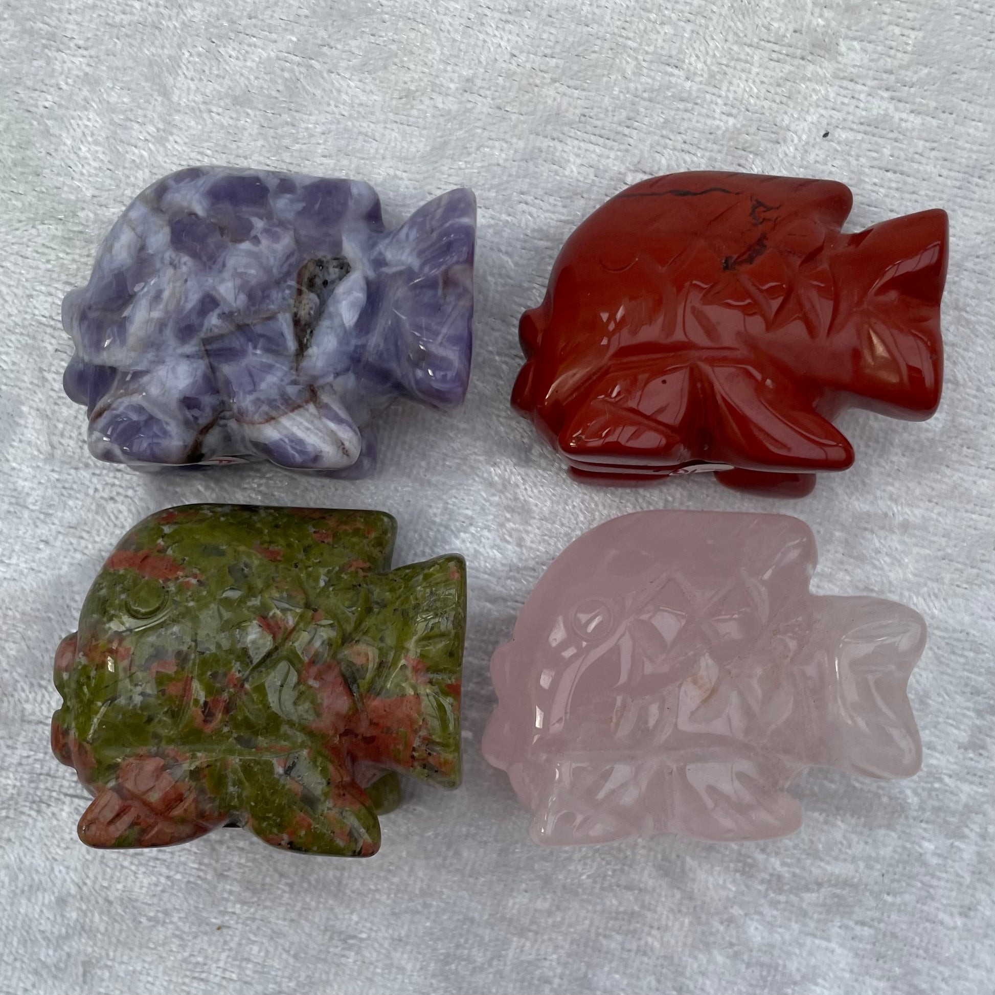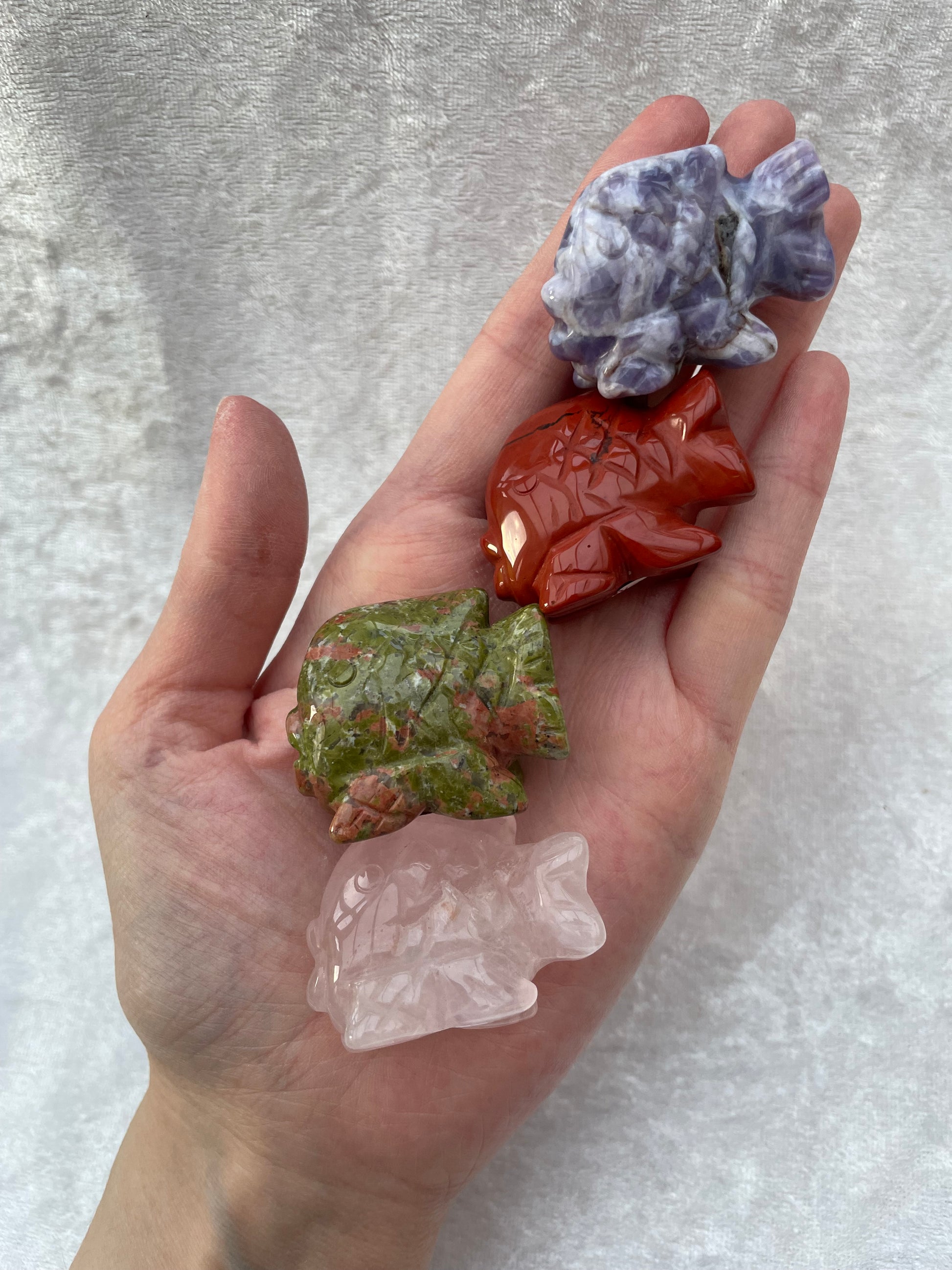 A selection of crystal fish carvings including Lepidolite, Red Jasper, Unakite and Rose Quartz.