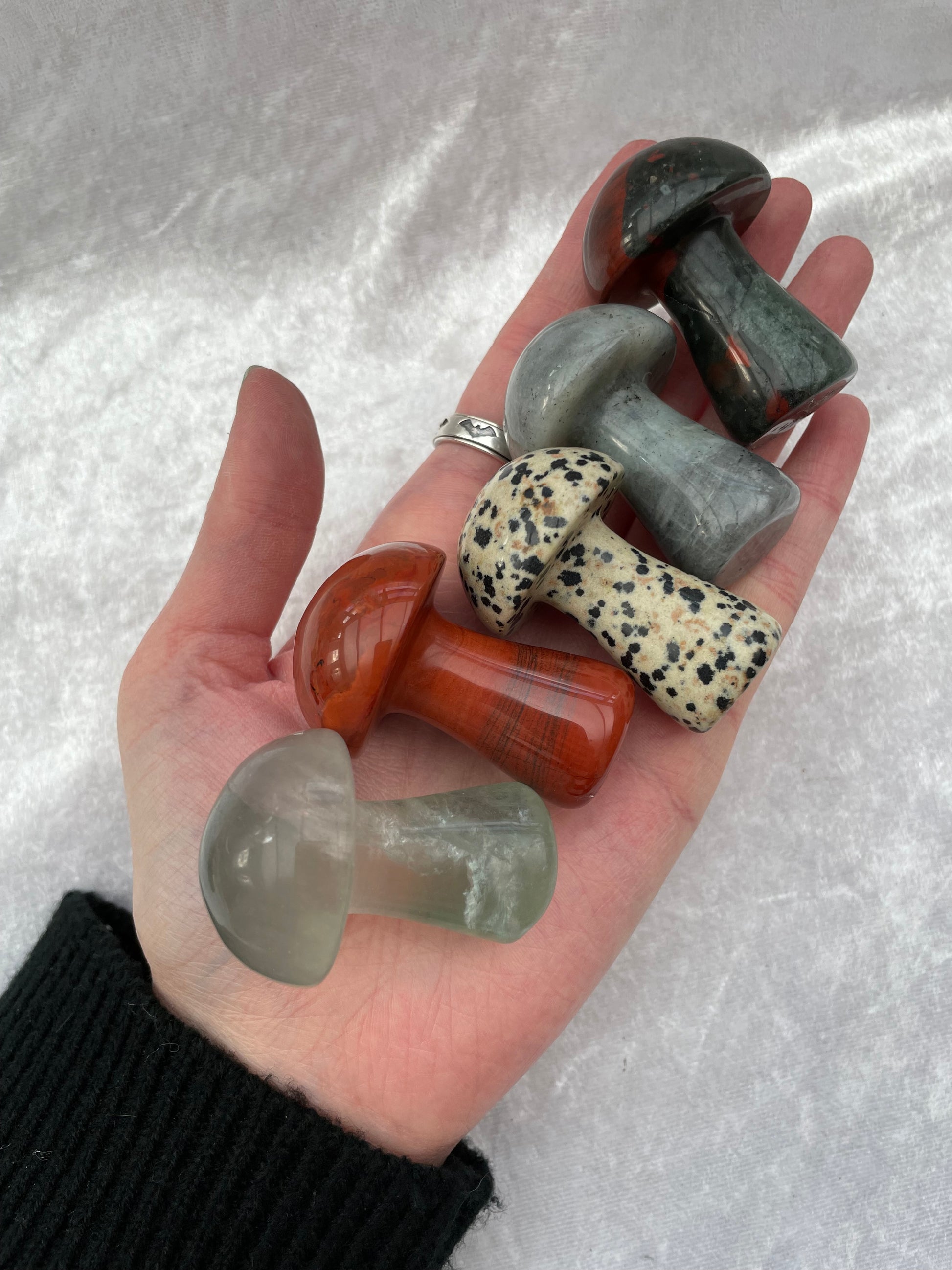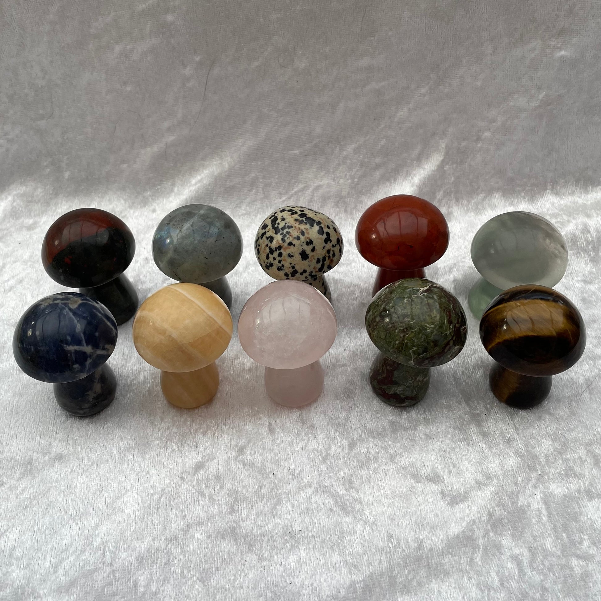 A selection of Crystal mushroom carvings including Tigers Eye, Dragons Blood Jasper, Dalmatian Jasper, Red Jasper, Rose Quartz, Seftonite, Yellow Calcite, labradorite, Green Fluorite and Sodalite.