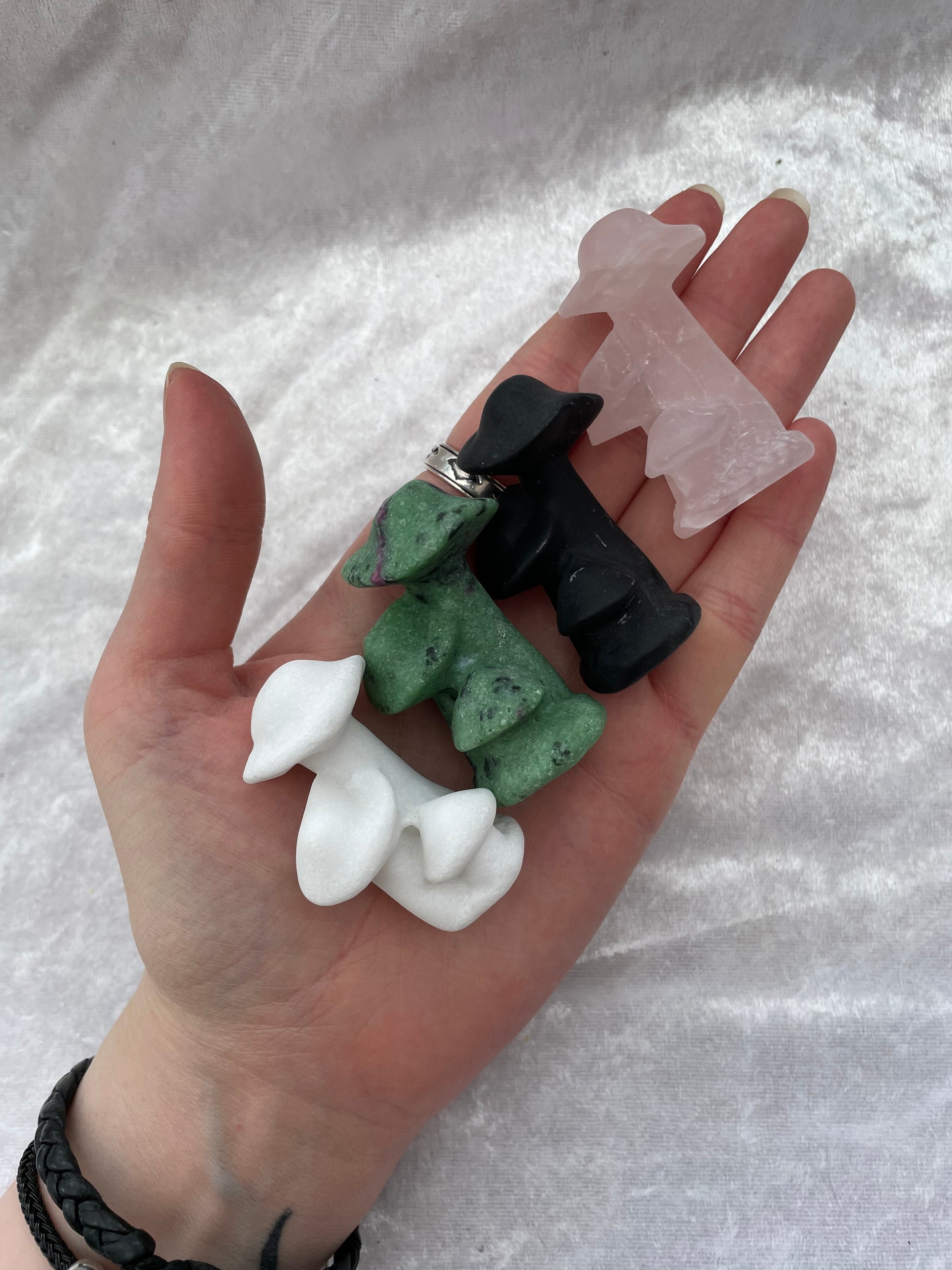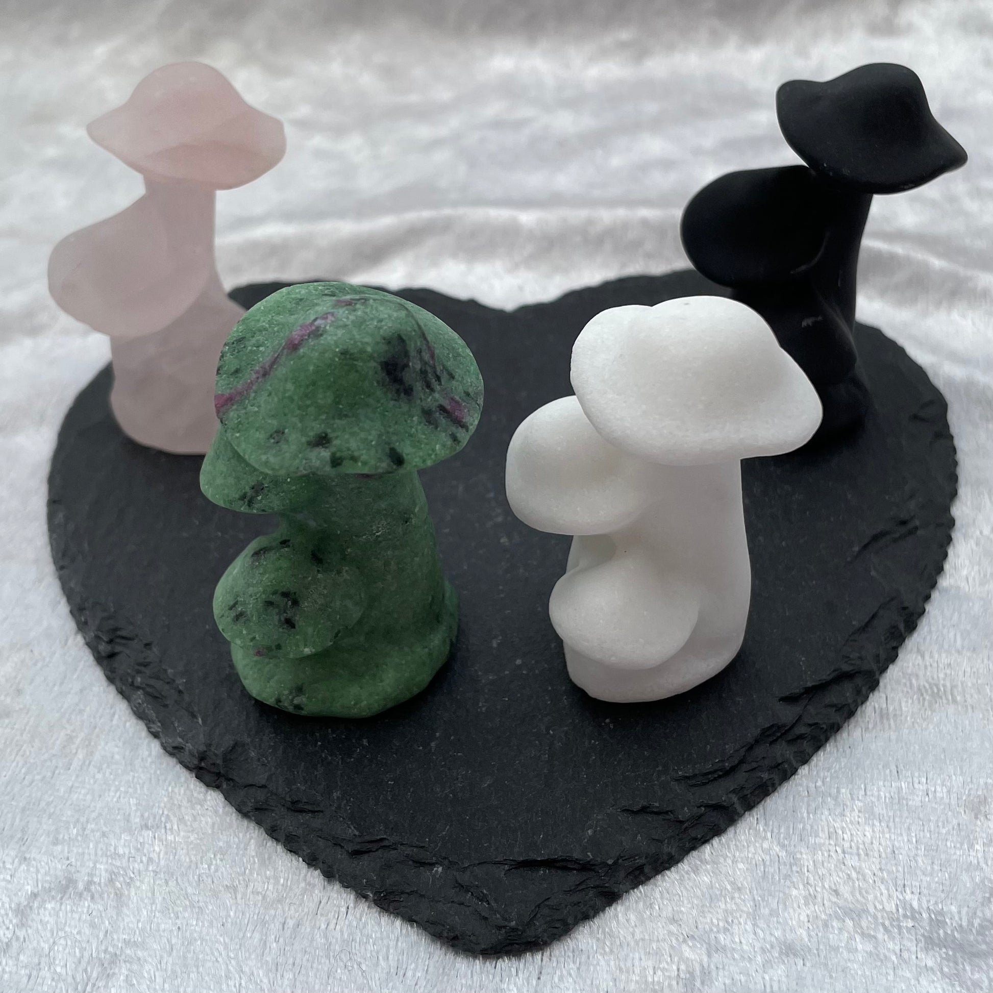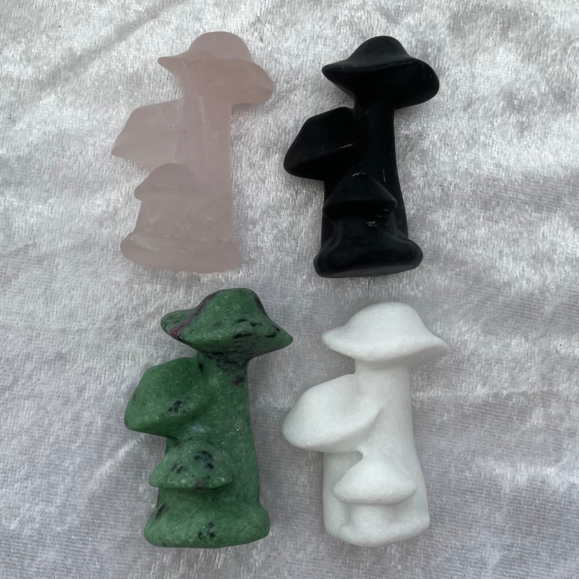 A selection of carved crystal mushroom clusters including Rose Quartz, Black Obsidian, Ruby Zoisite and White Jade.