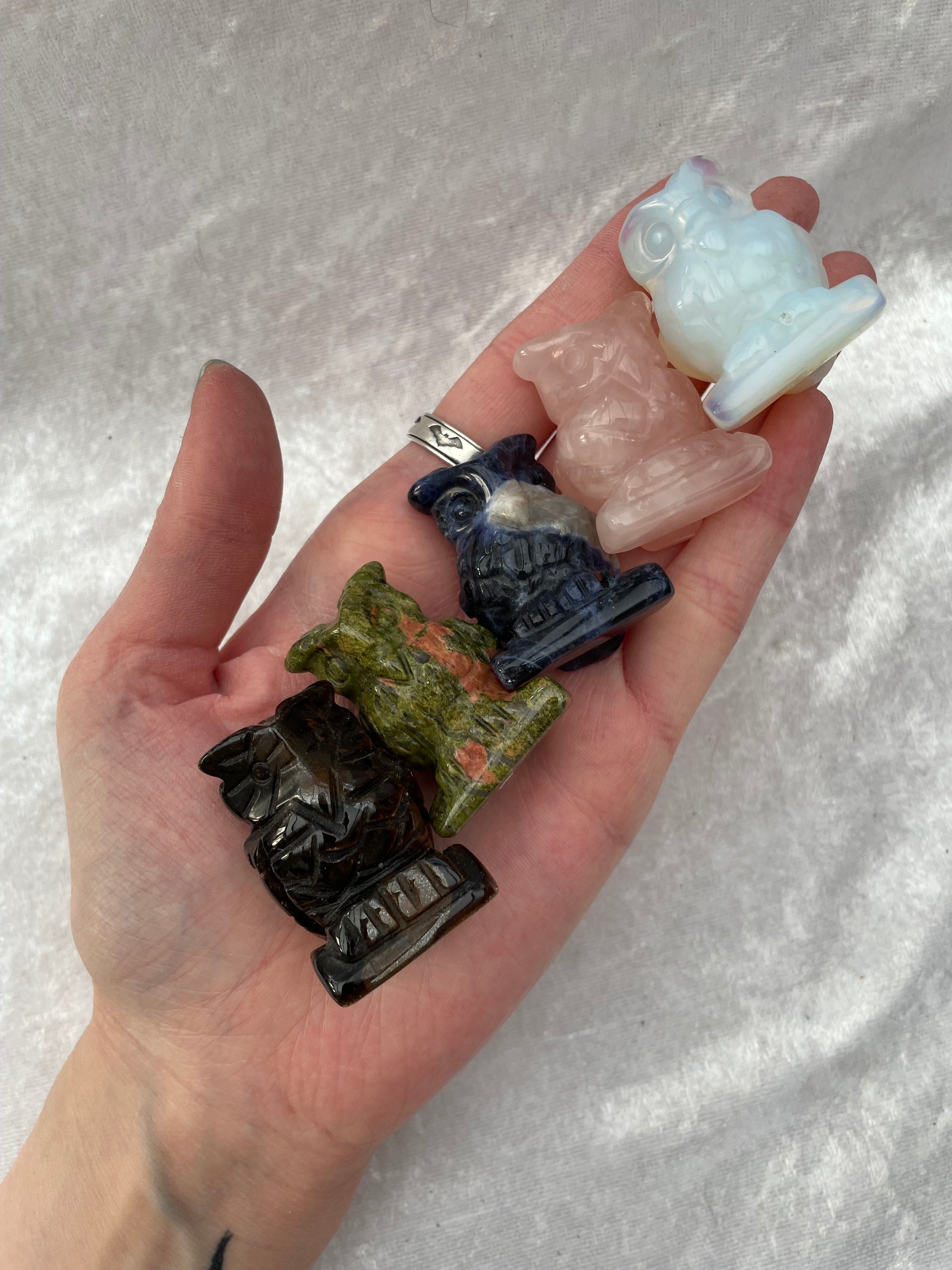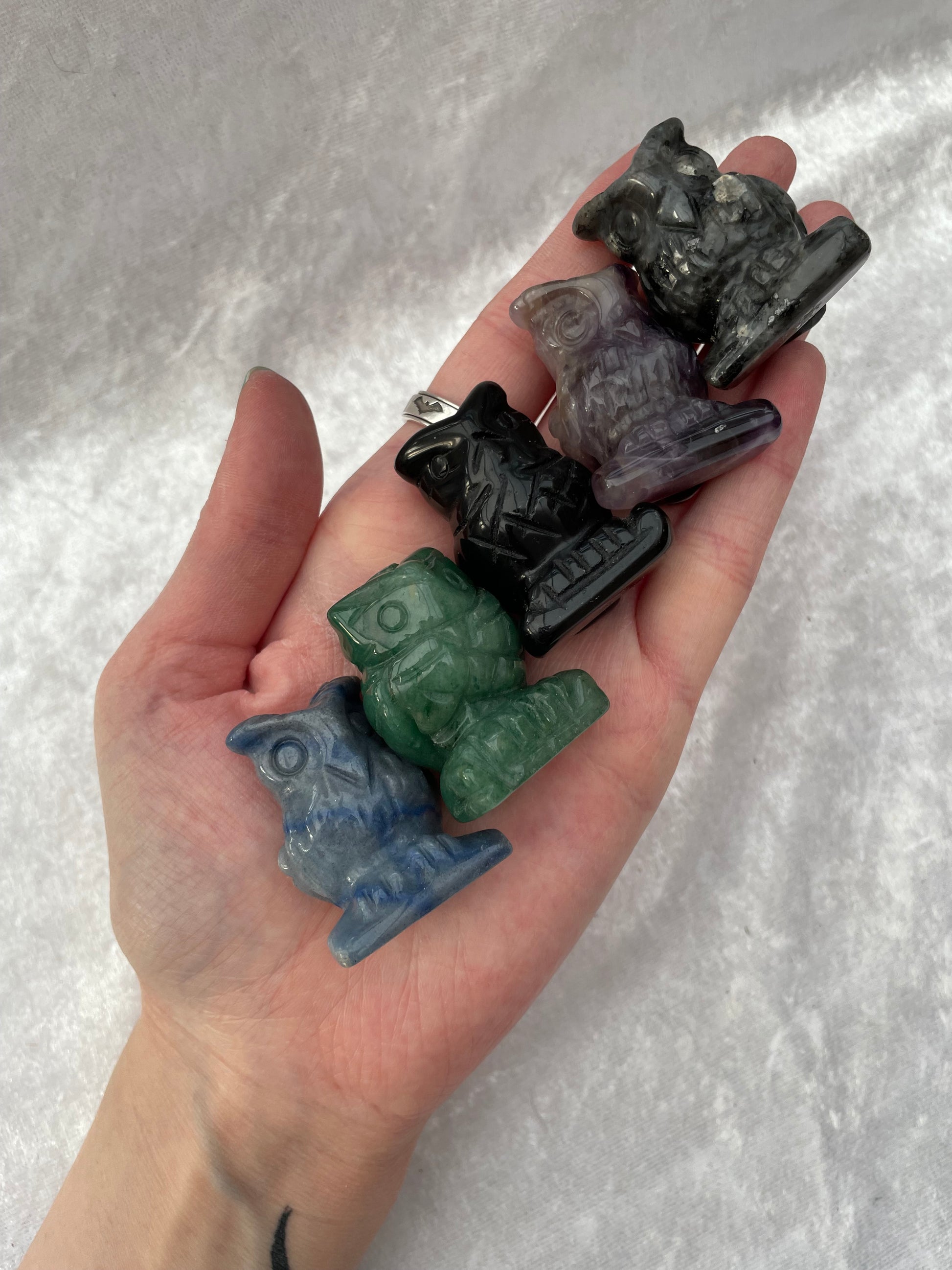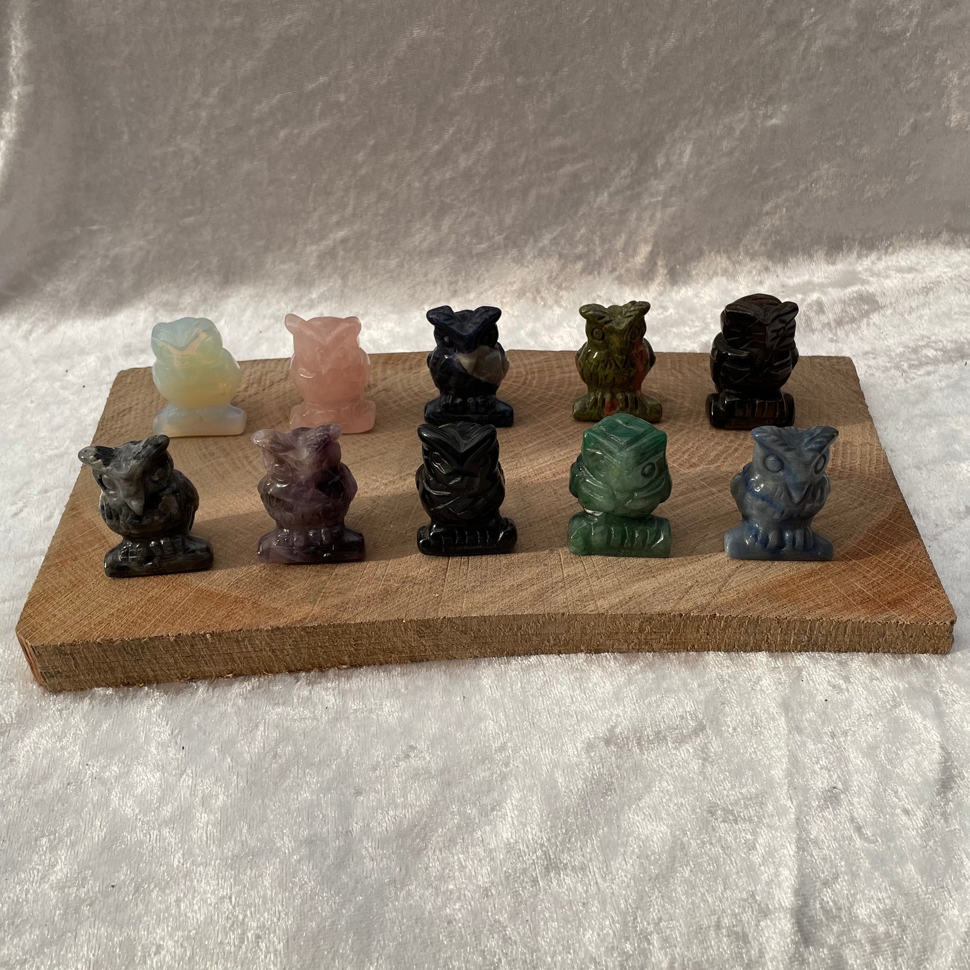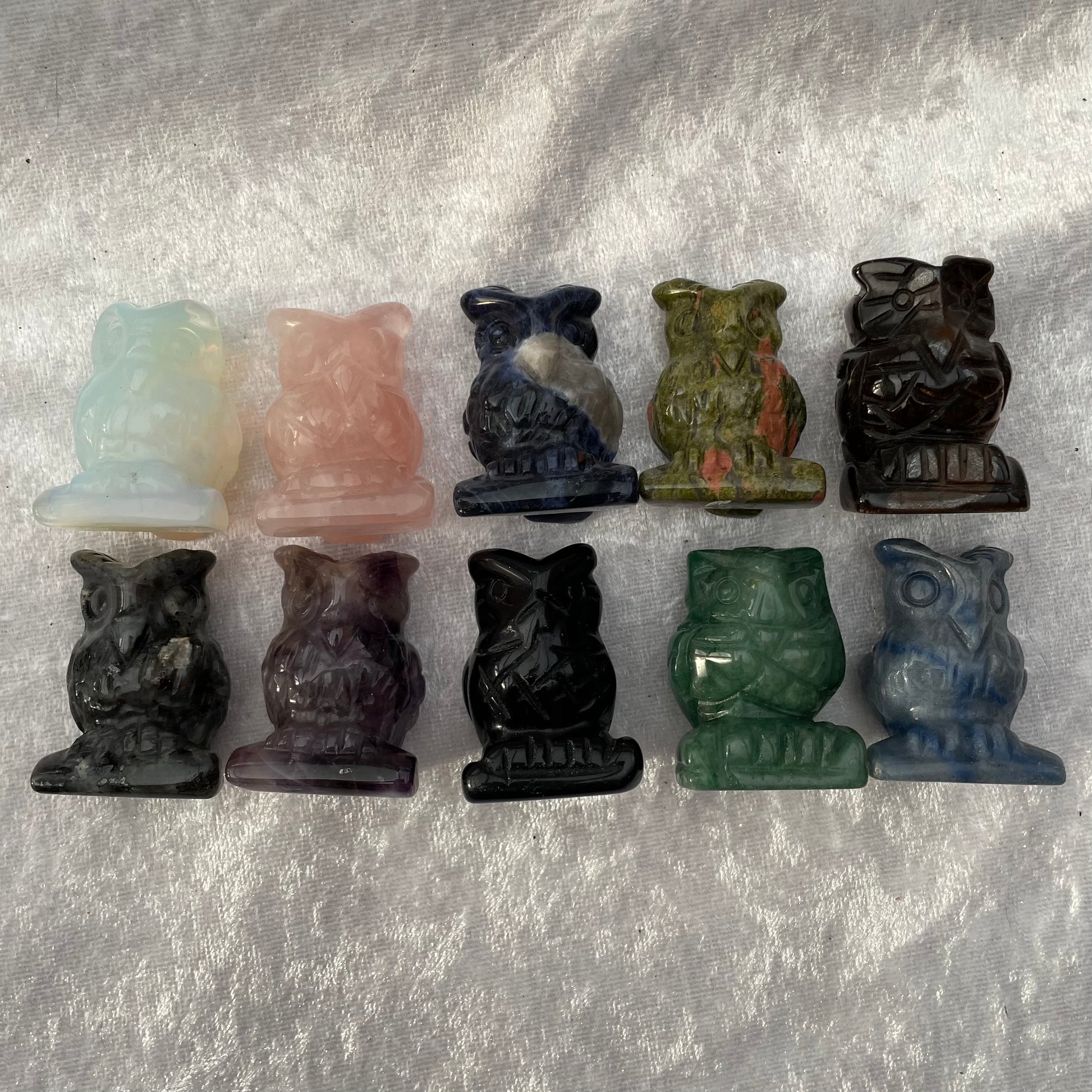 A selection of Crystal owl carvings including Rose Quartz, Unakite, Opalite, Green Aventurine, Blue Quartz, Sodalite, Tigers Eye, Larvikite, Black Obsidian and Amethyst.