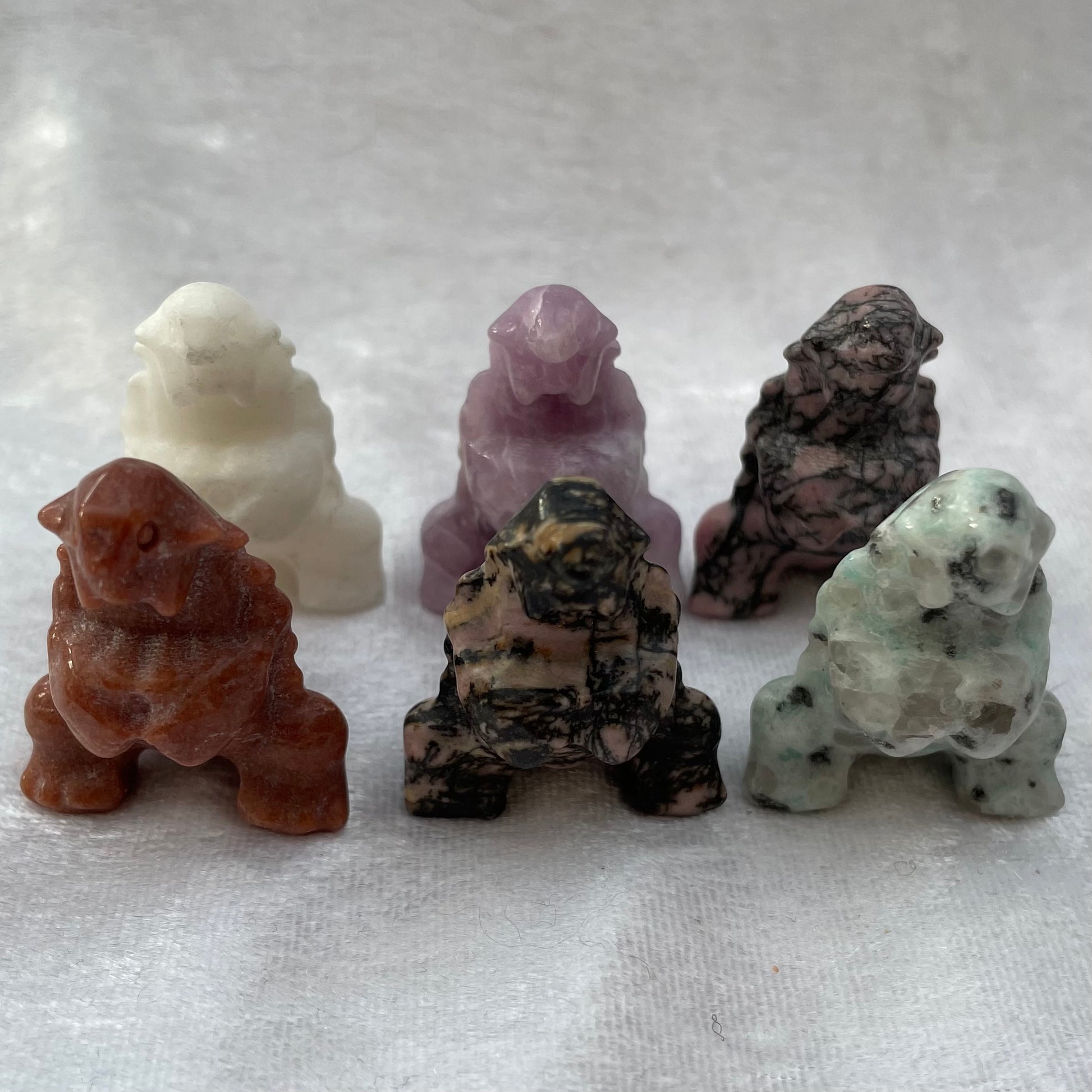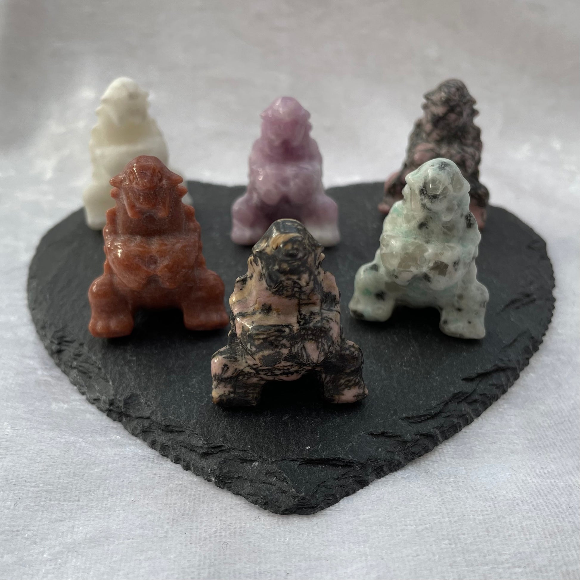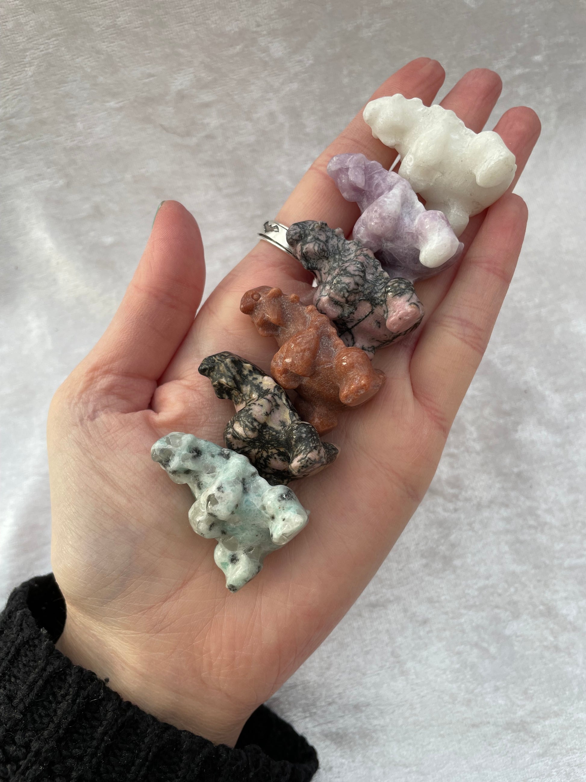 A selection of Crystal Pokémon groudon carvings including Red Agate, Kiwi Jasper, Milky Quartz, Rhodonite and Lepidolite.