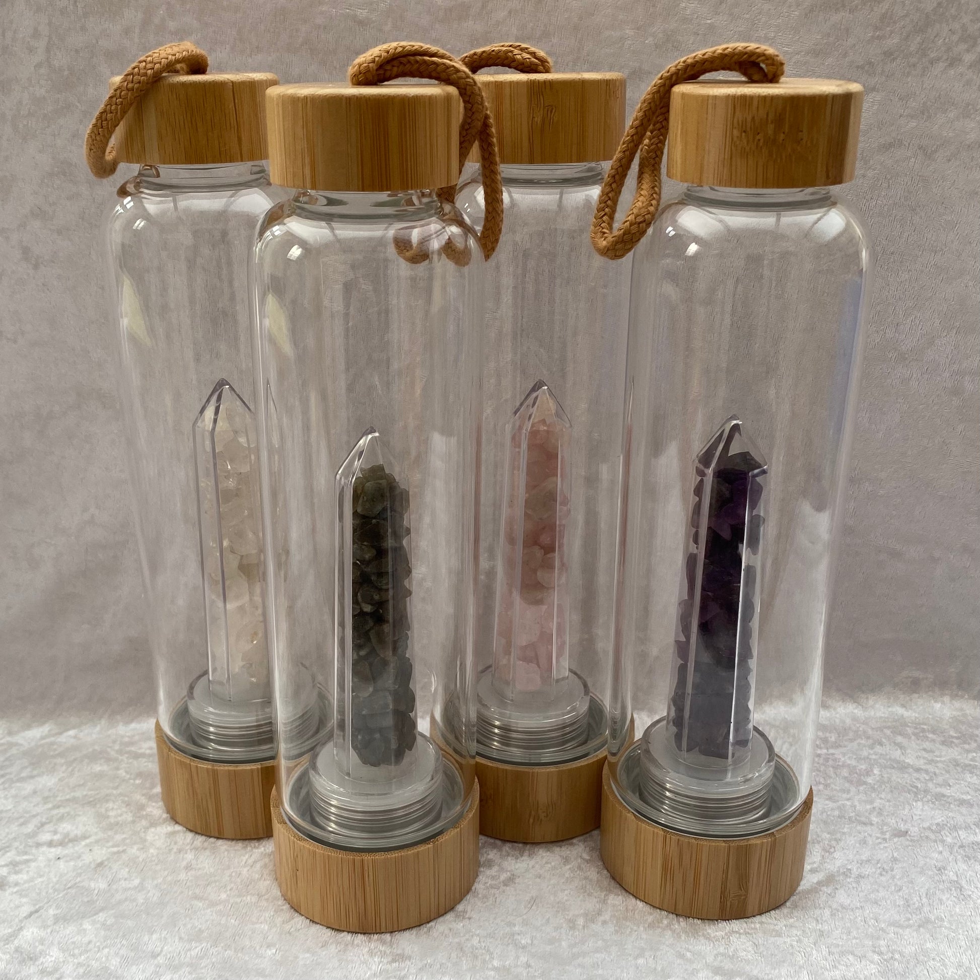 A glass water bottle with bamboo lid and base containing either Clear Quartz, Labradorite, Rose Quartz or Amethyst chips in a sealed point chamber. The base will screw off for cleaning purposes as well as allowing you to remove and swap the chips in the chamber.