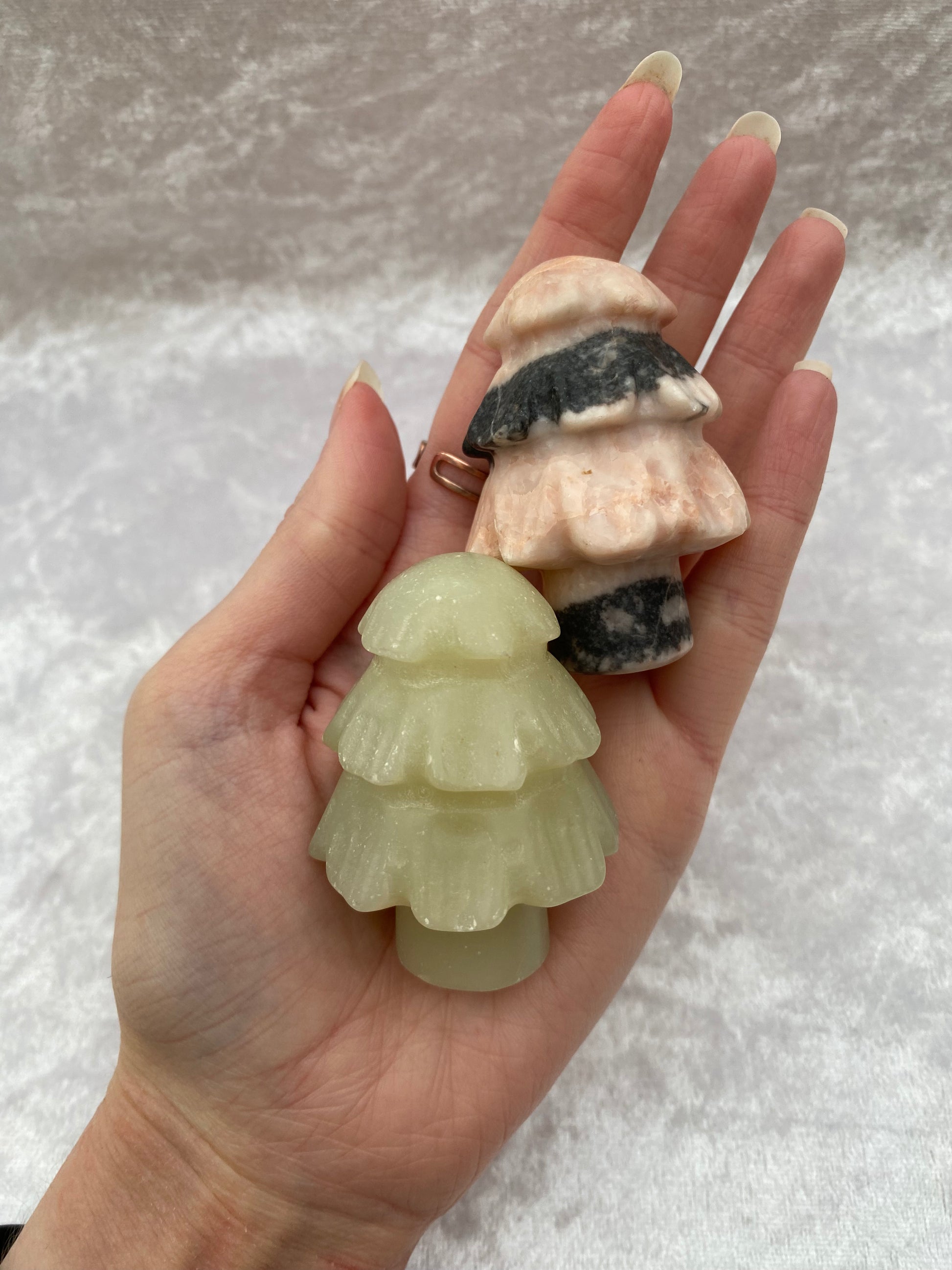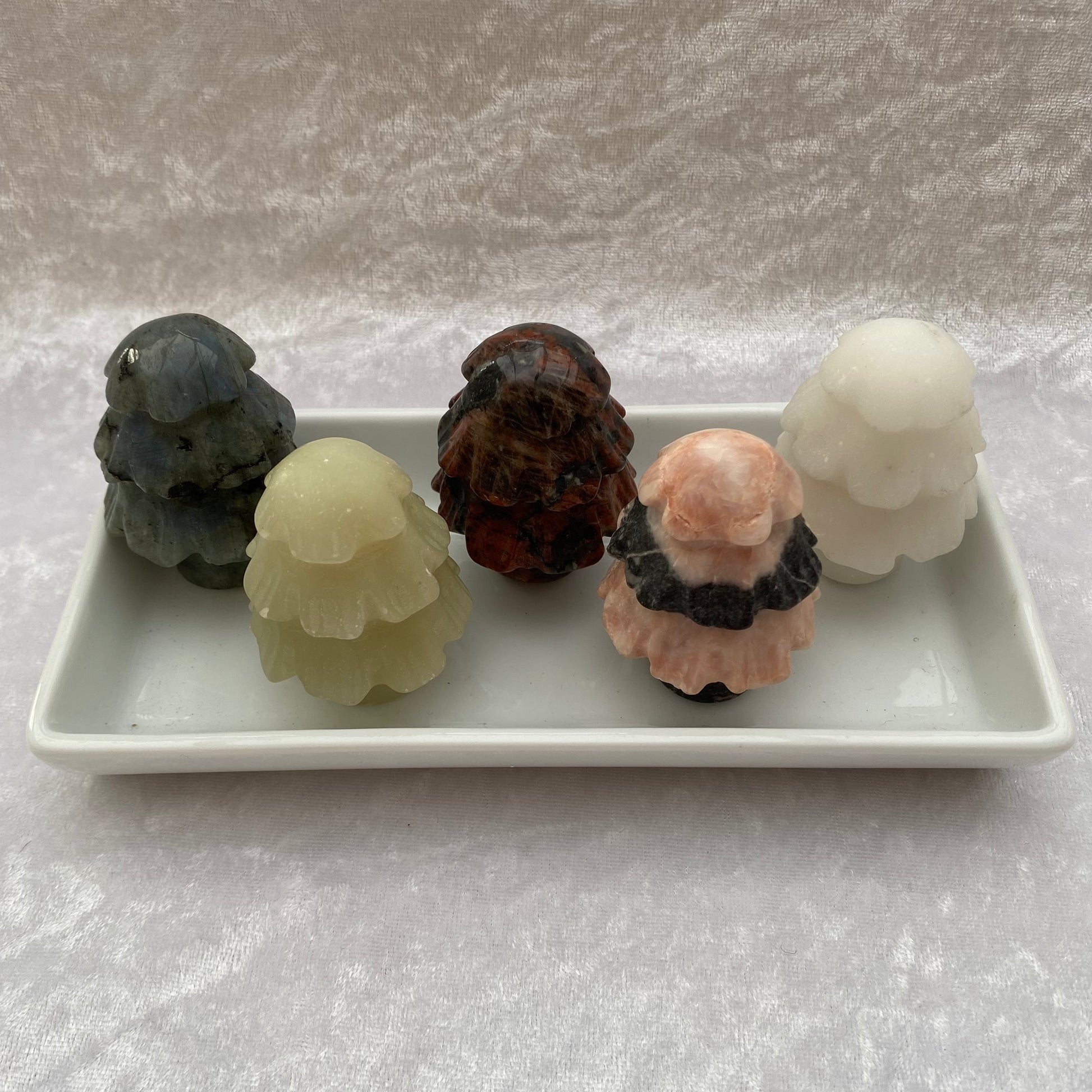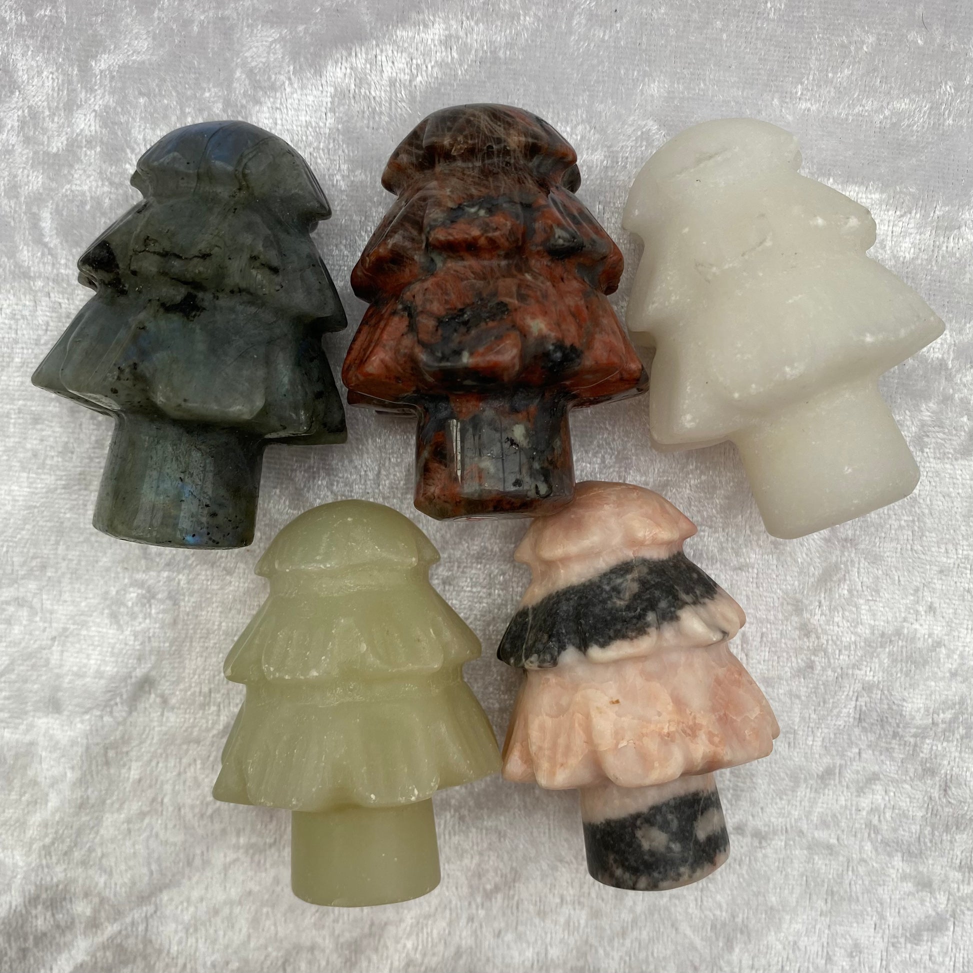 A selection of Crystal tree carvings including Brecciated Jasper, Labradorite, Milky Quartz, New Jade and Pink Zebra Jasper.