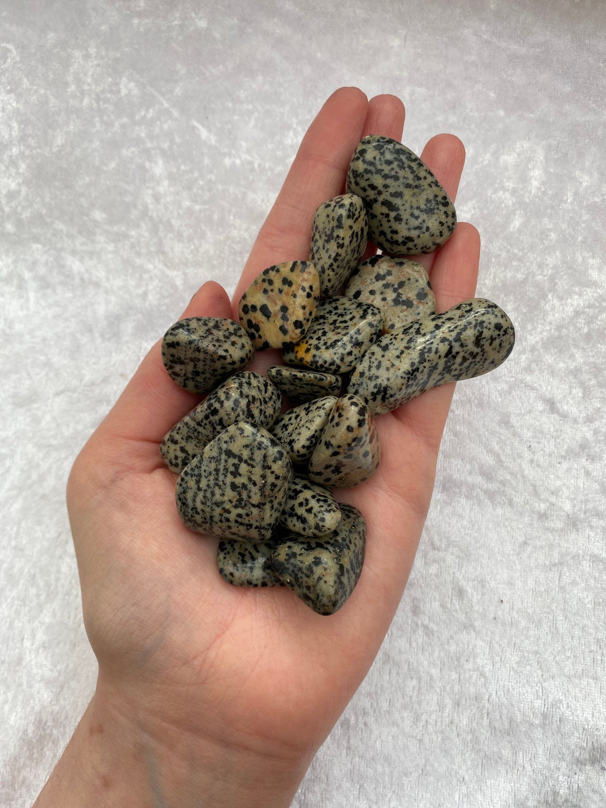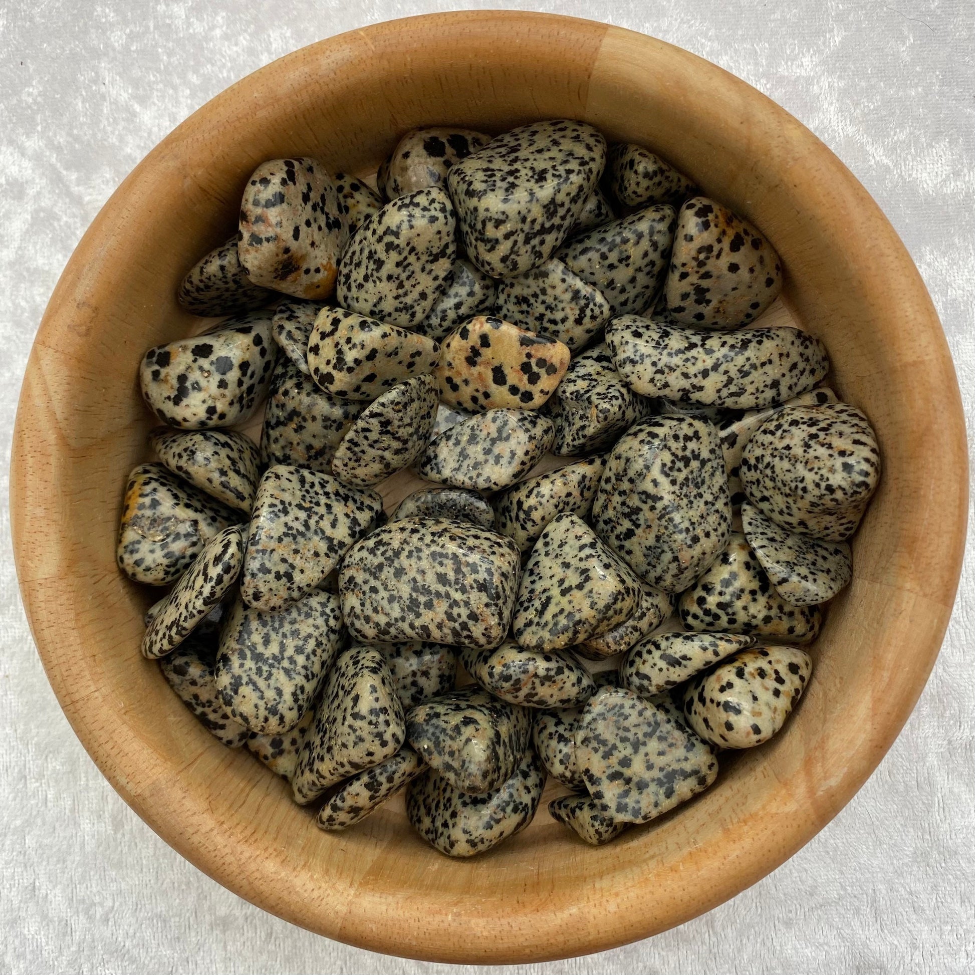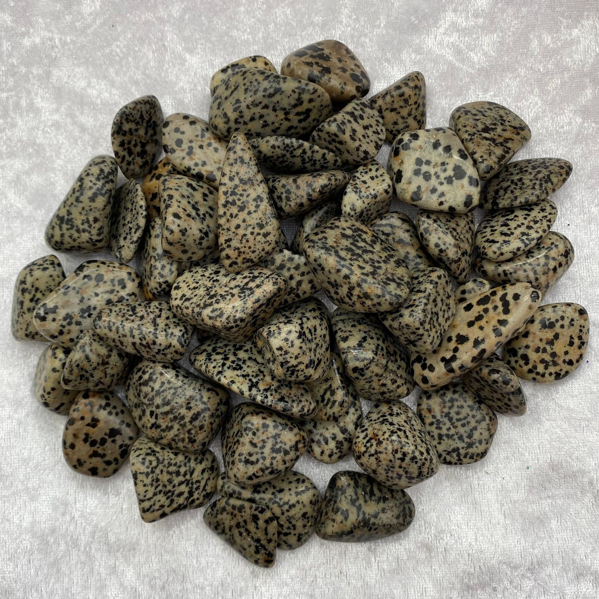 Dalmatian Stone, also referred to as Dalmatian Jasper, is a white feldspar-Quartz mineral with black dotted inclusions. These dots are Arfvedsonite. Often thought to be a Jasper, this stone is actually an igneous rock.