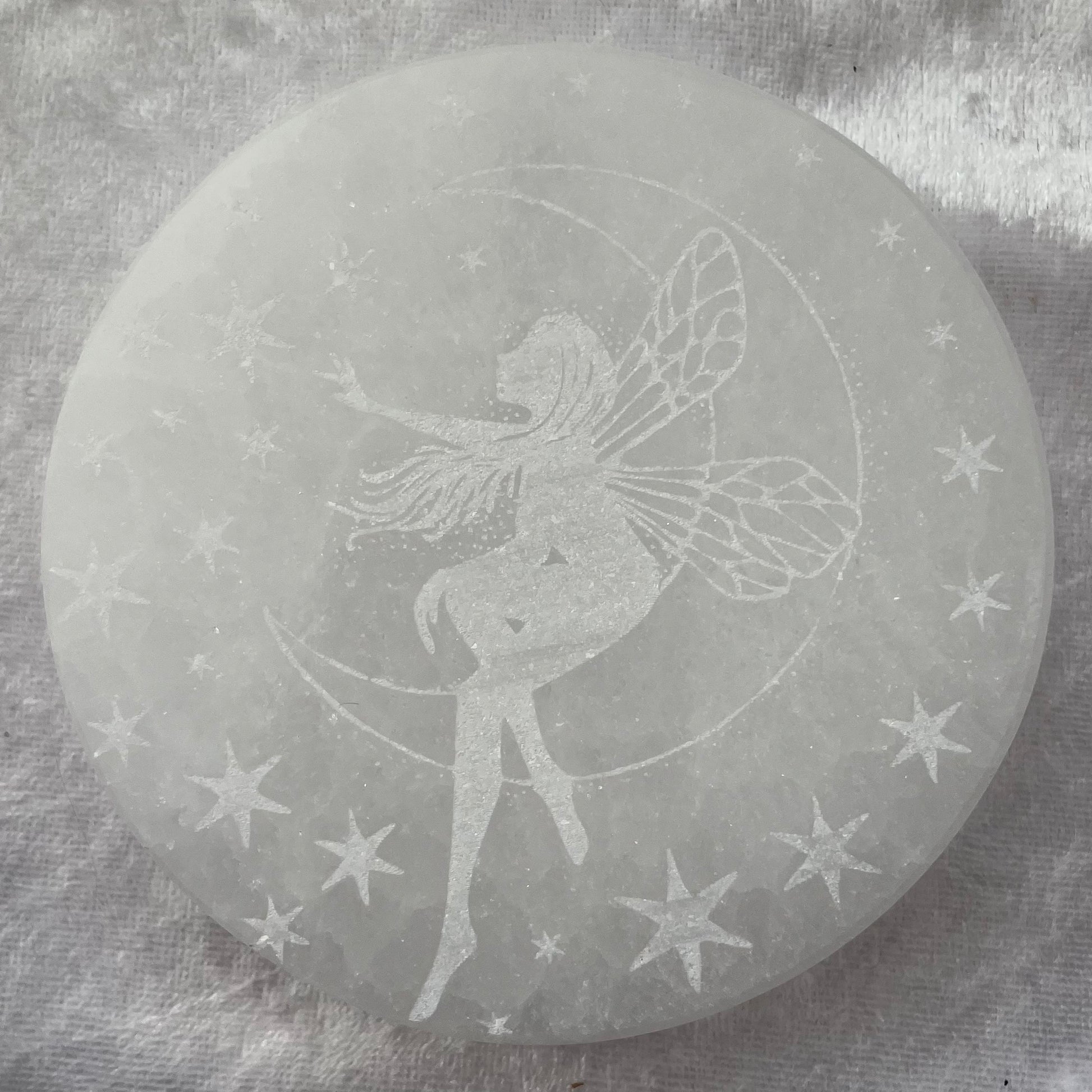 Engraved selenite fairy charging plates