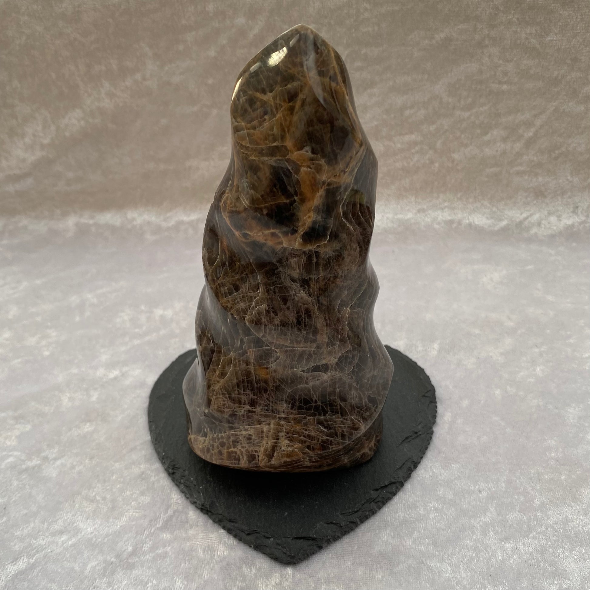 Moonstone is a variety of the feldspar-group mineral orthoclase. It’s composed of two feldspar minerals, orthoclase and albite. At first, the two minerals are intermingled. Then, as the newly formed mineral cools, the intergrown orthoclase and albite separate into stacked, alternating layers.
