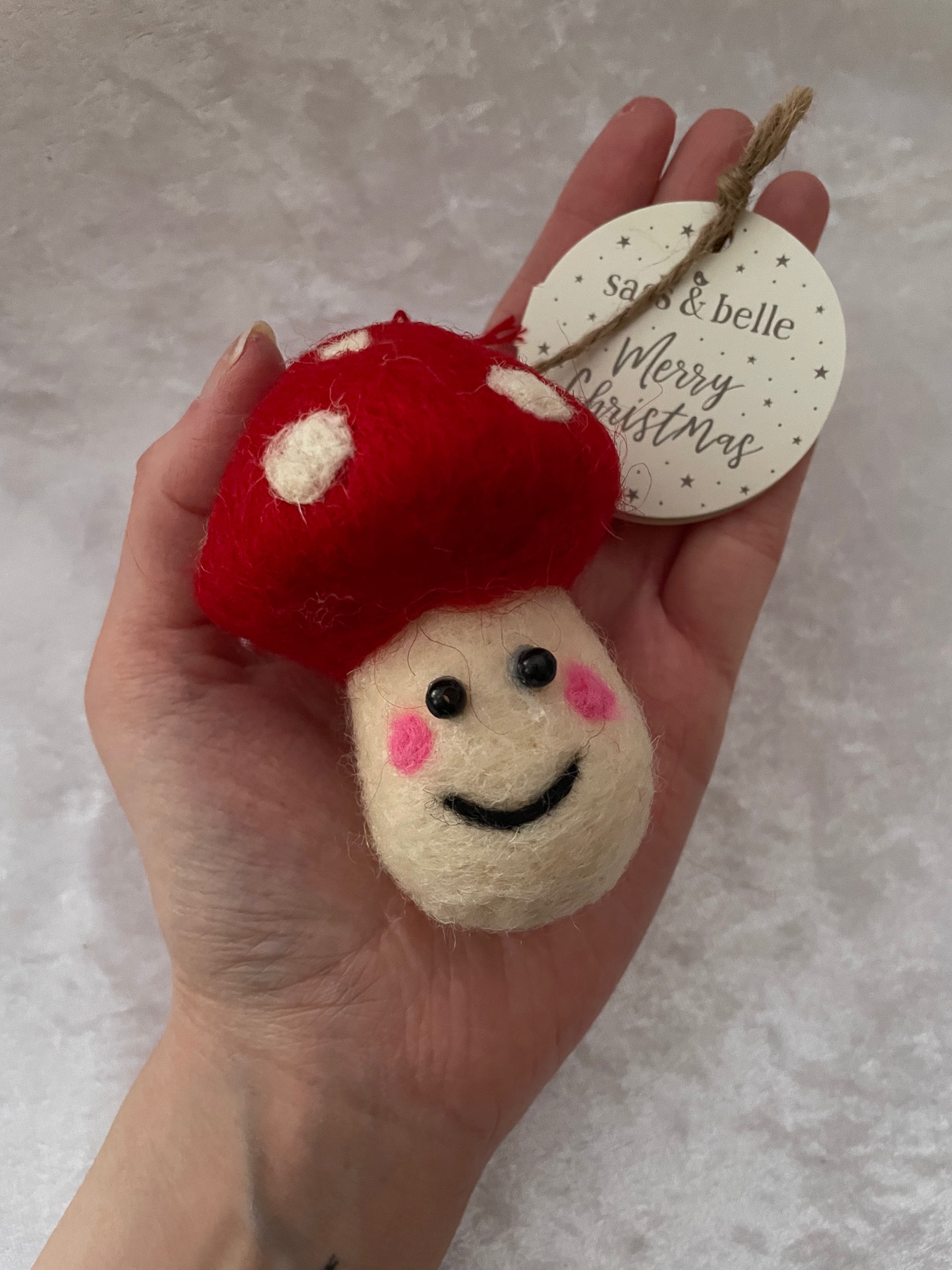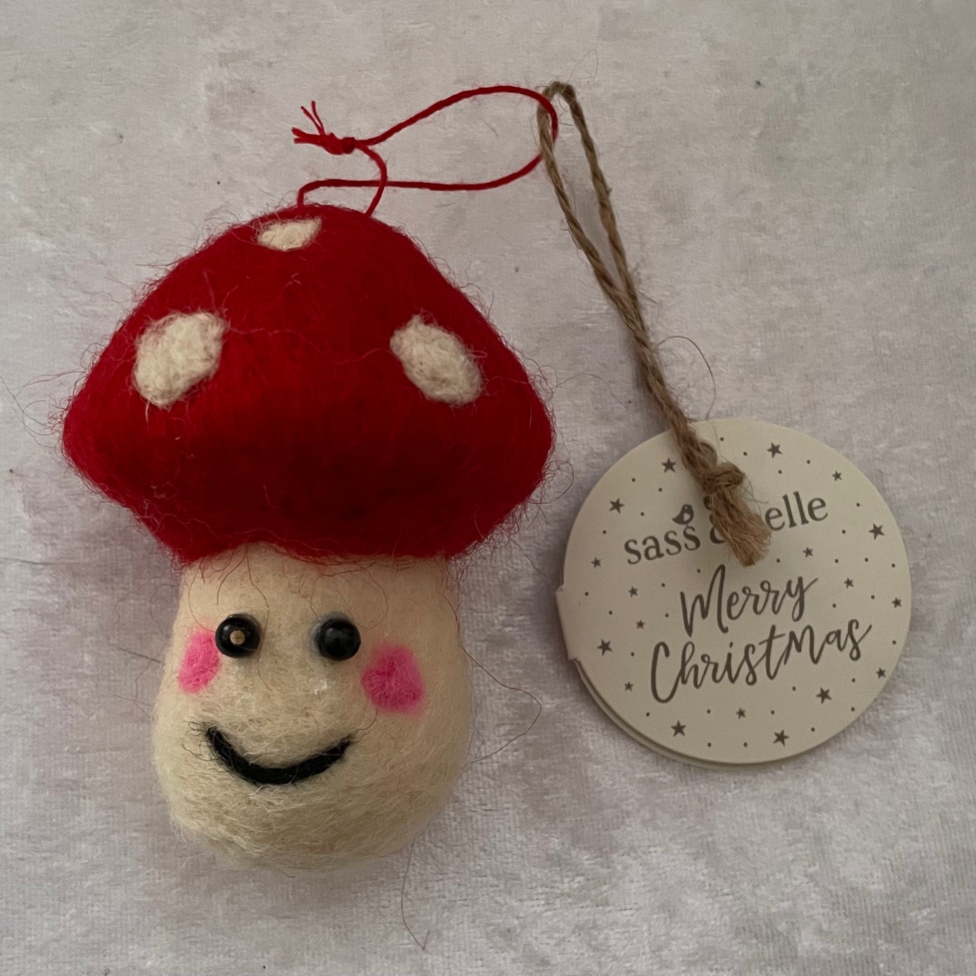 A felted mushroom ornament with beaded eyes in red and white fly agaric design. Perfect for hanging on the Christmas tree or decorating the home.