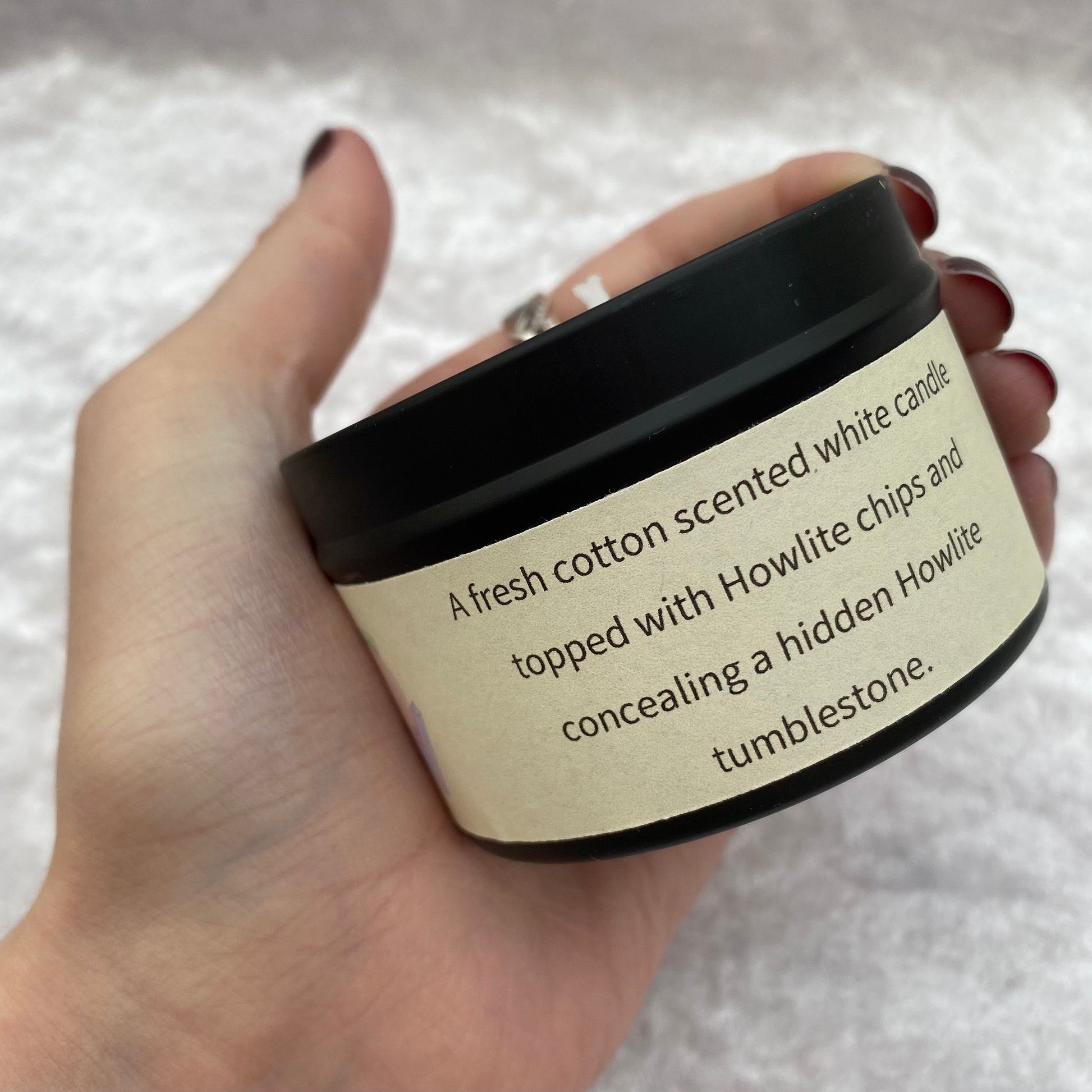 A fresh cotton scented white candle topped with White Howlite chips and concealing a hidden White Howlite tumblestone to uncover as the candle burns.