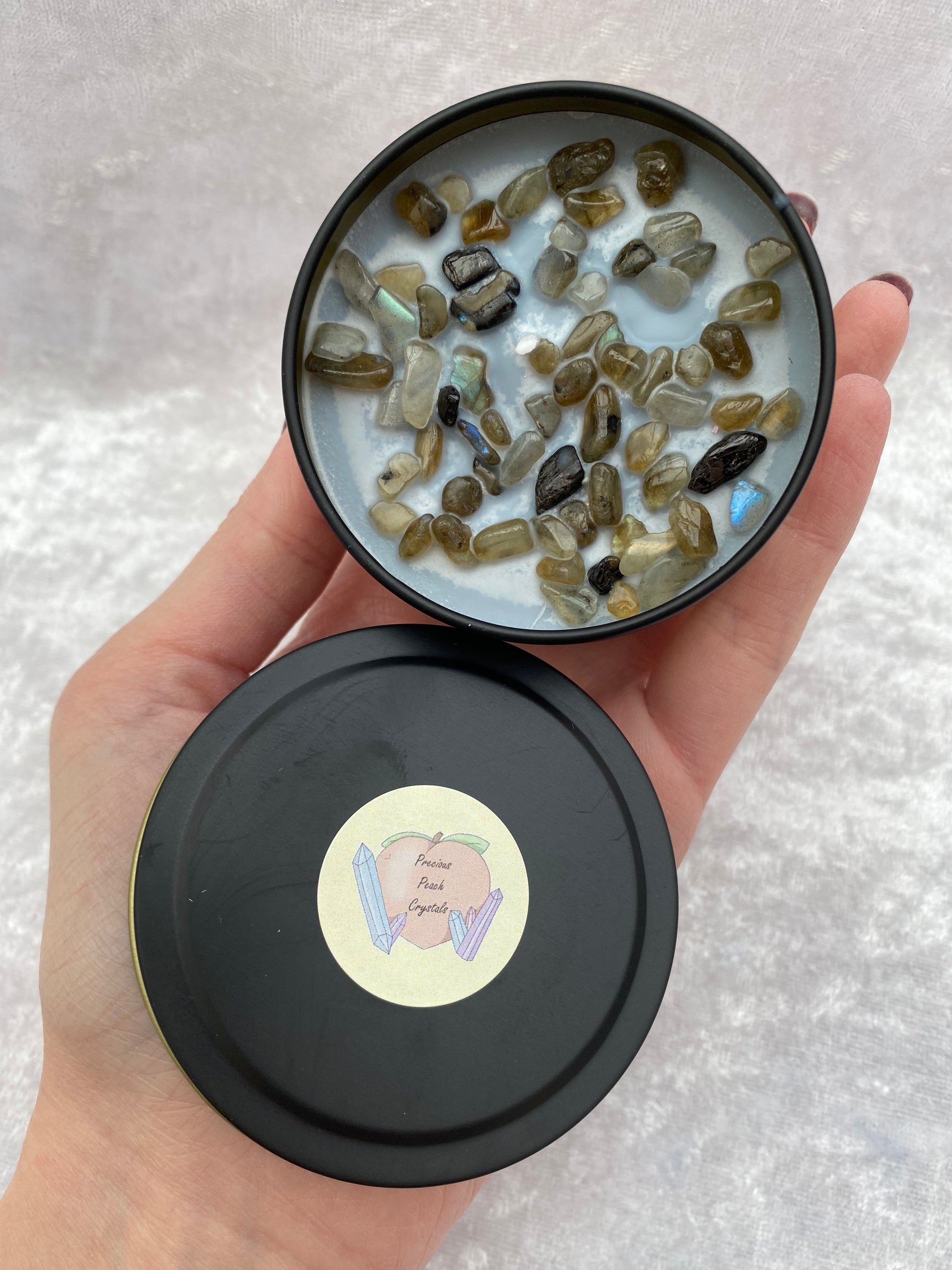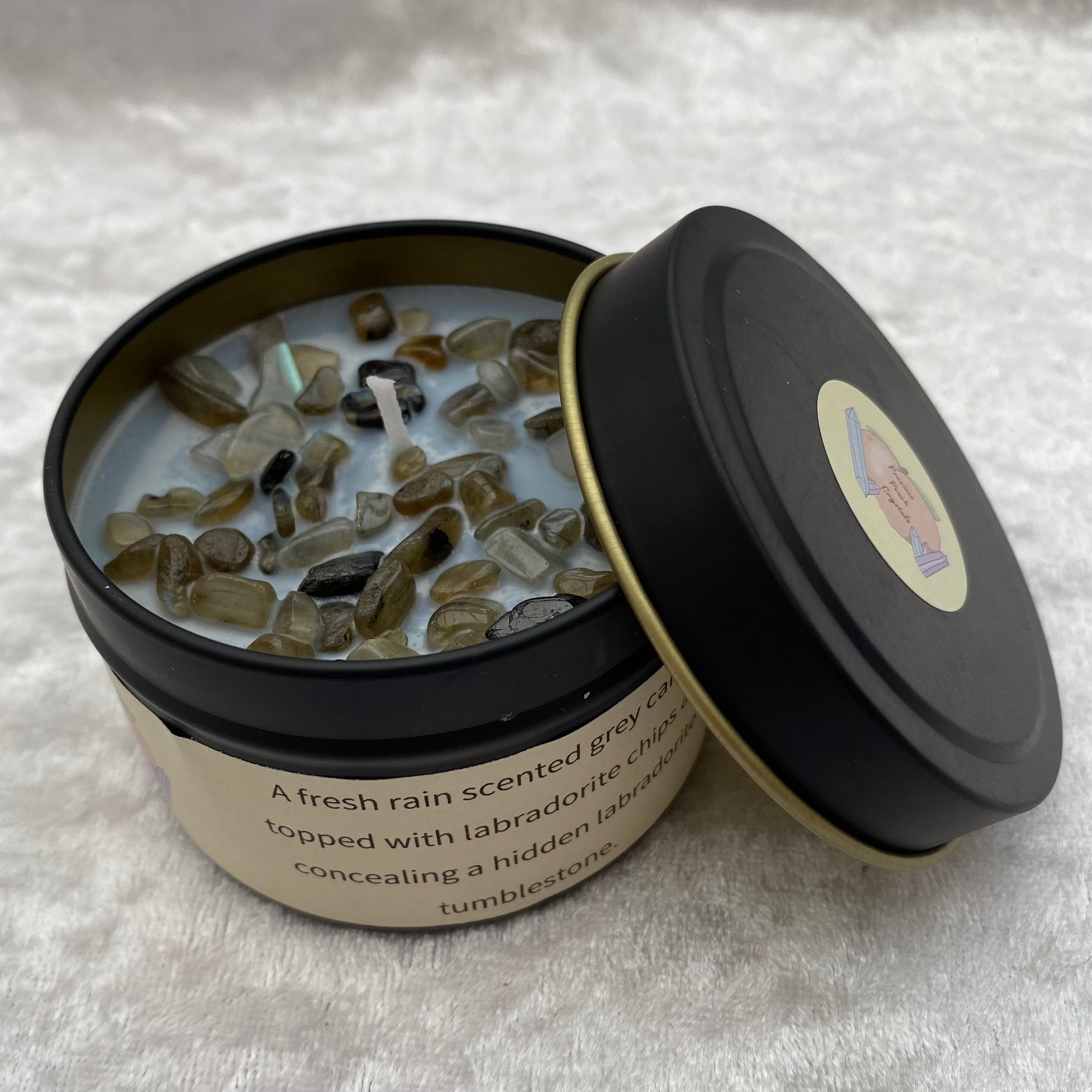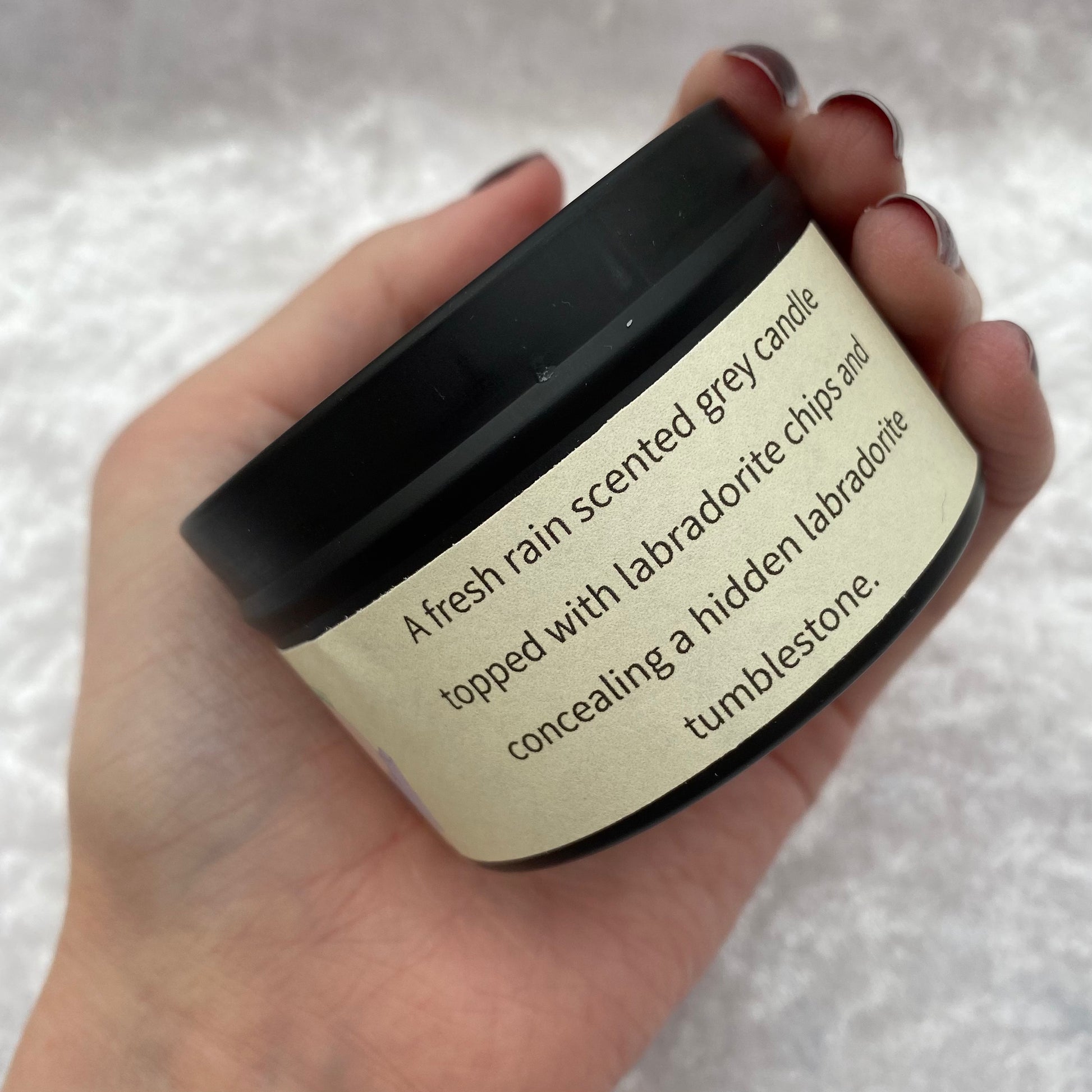 A fresh rain scented grey candle topped with Labradorite chips and concealing a hidden Labradorite tumblestone to uncover as the candle burns.
