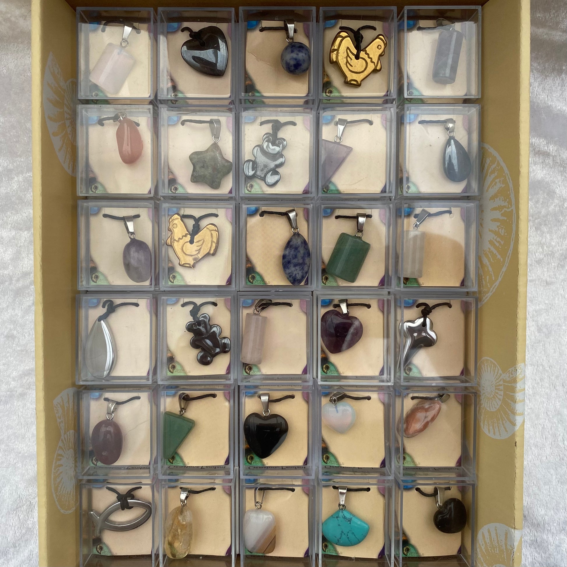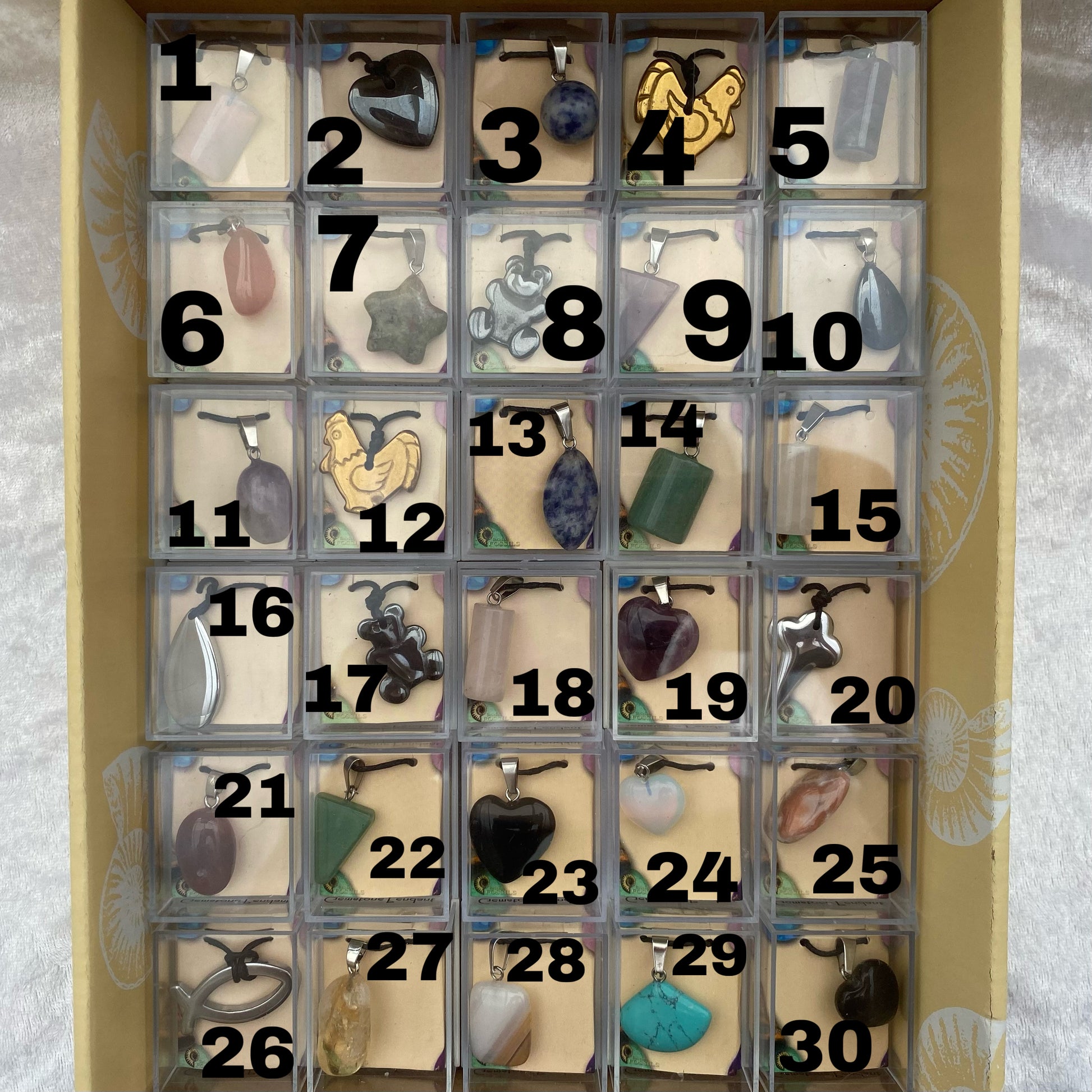 Each pendant comes in a box with a black necklace cord that fastens with a clasp.