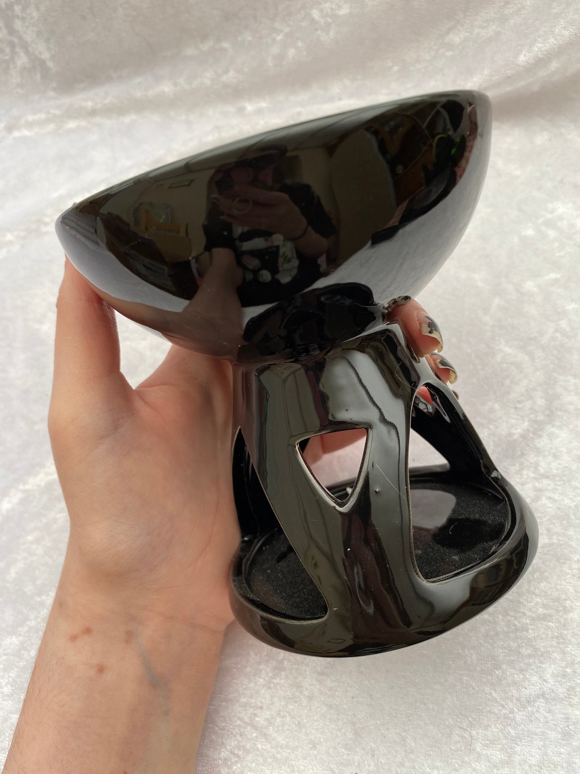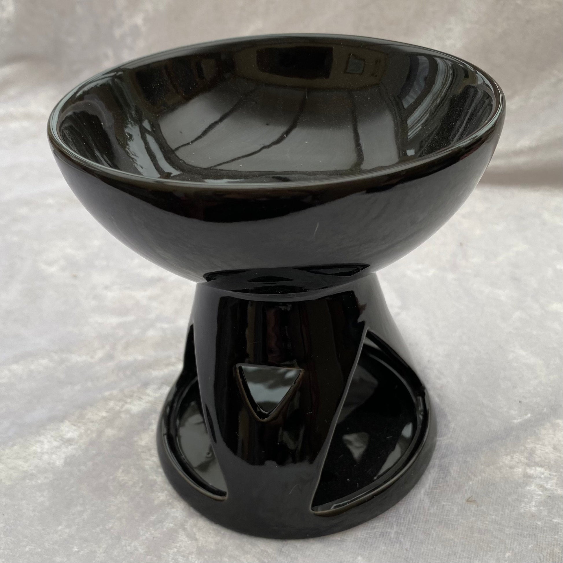 A ceramic black burner with a glossy finish, simply place a candle underneath and add your oil or wax melt to release the scent and burn your fragrance.