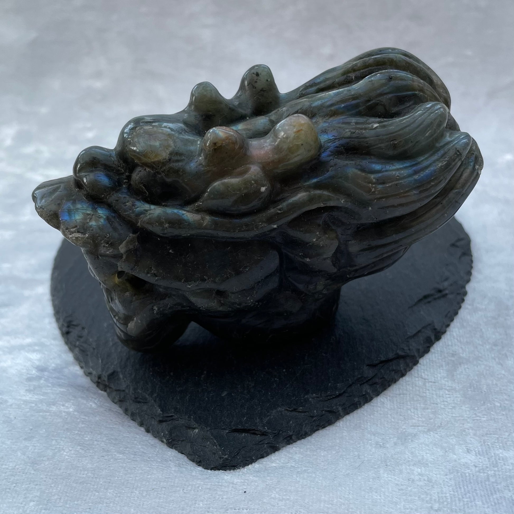 Some specimens of labradorite exhibit a schiller effect, which is a strong play of iridescent blue, green, red, orange, and yellow colours known as "labradorescence."