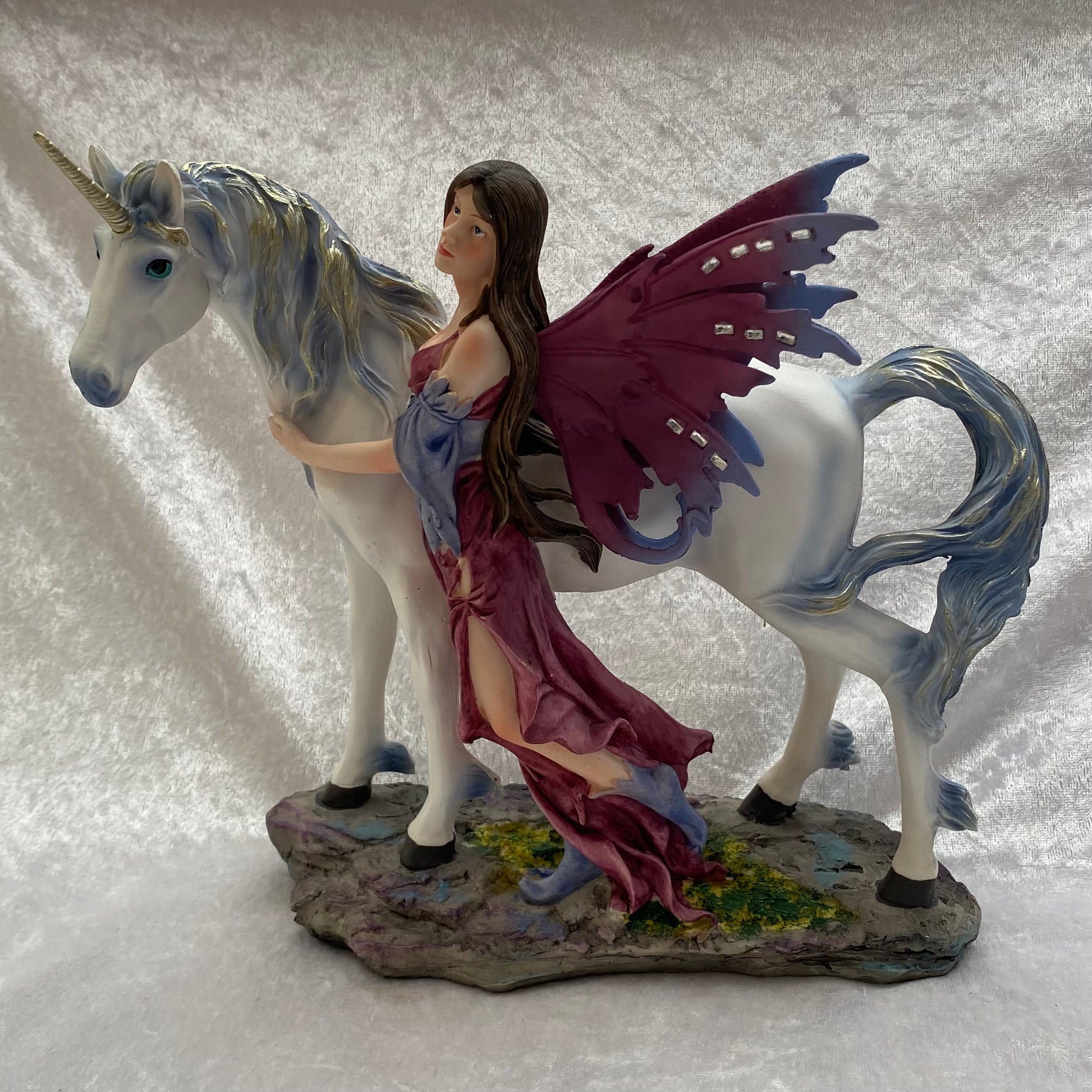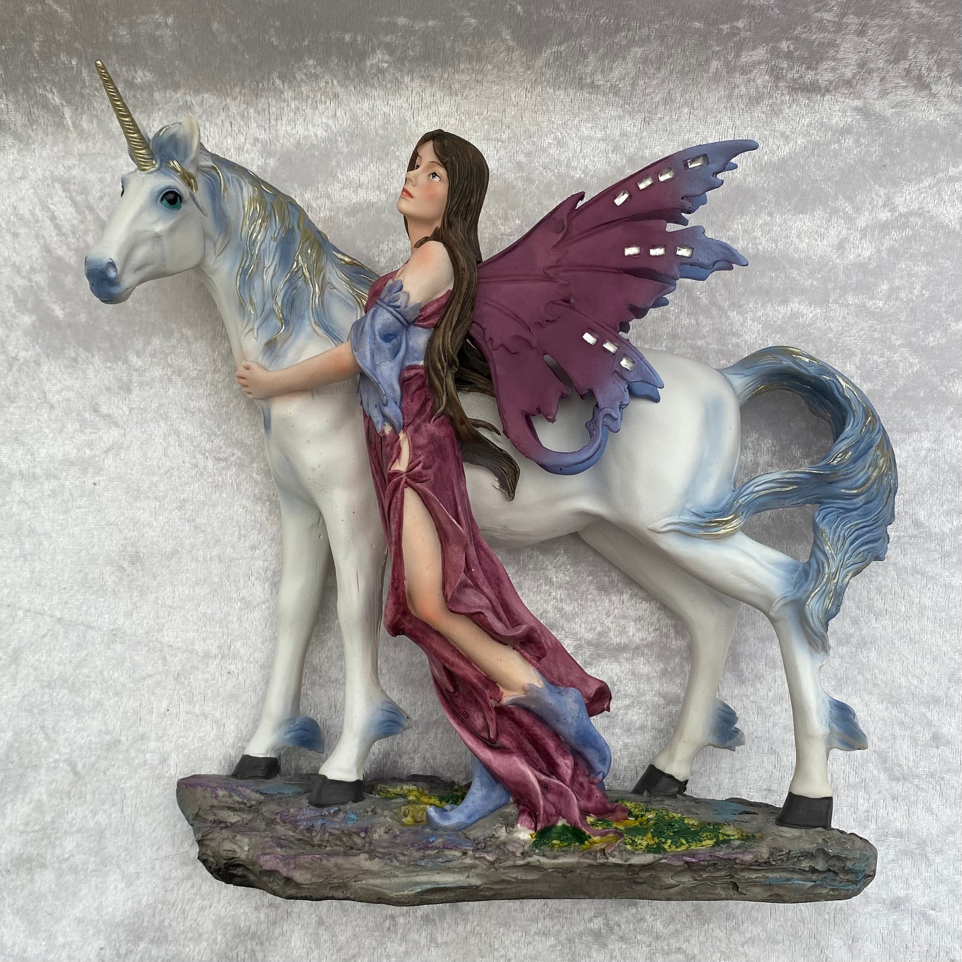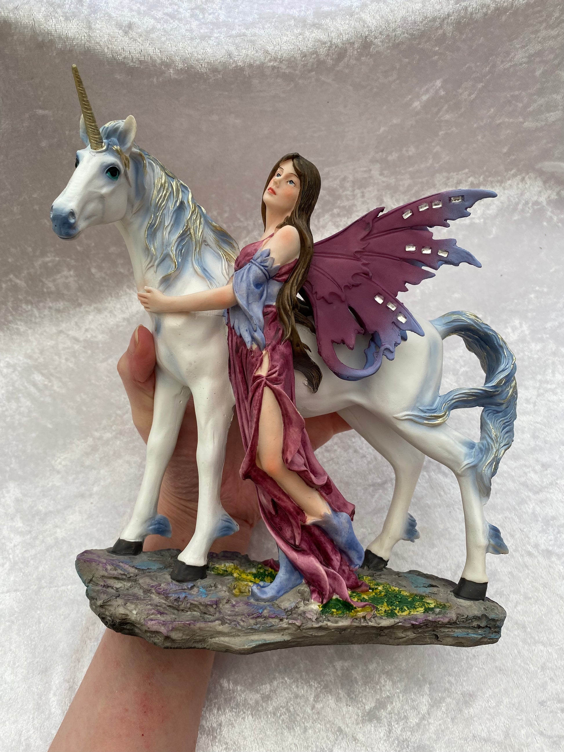A beautiful forest fairy stood with her arm around her unicorn companion. Made from resin and measuring 21.5cm tall, 23cm wide and 10cm deep, this ornament is hand painted and features glittering gems on the wings.
