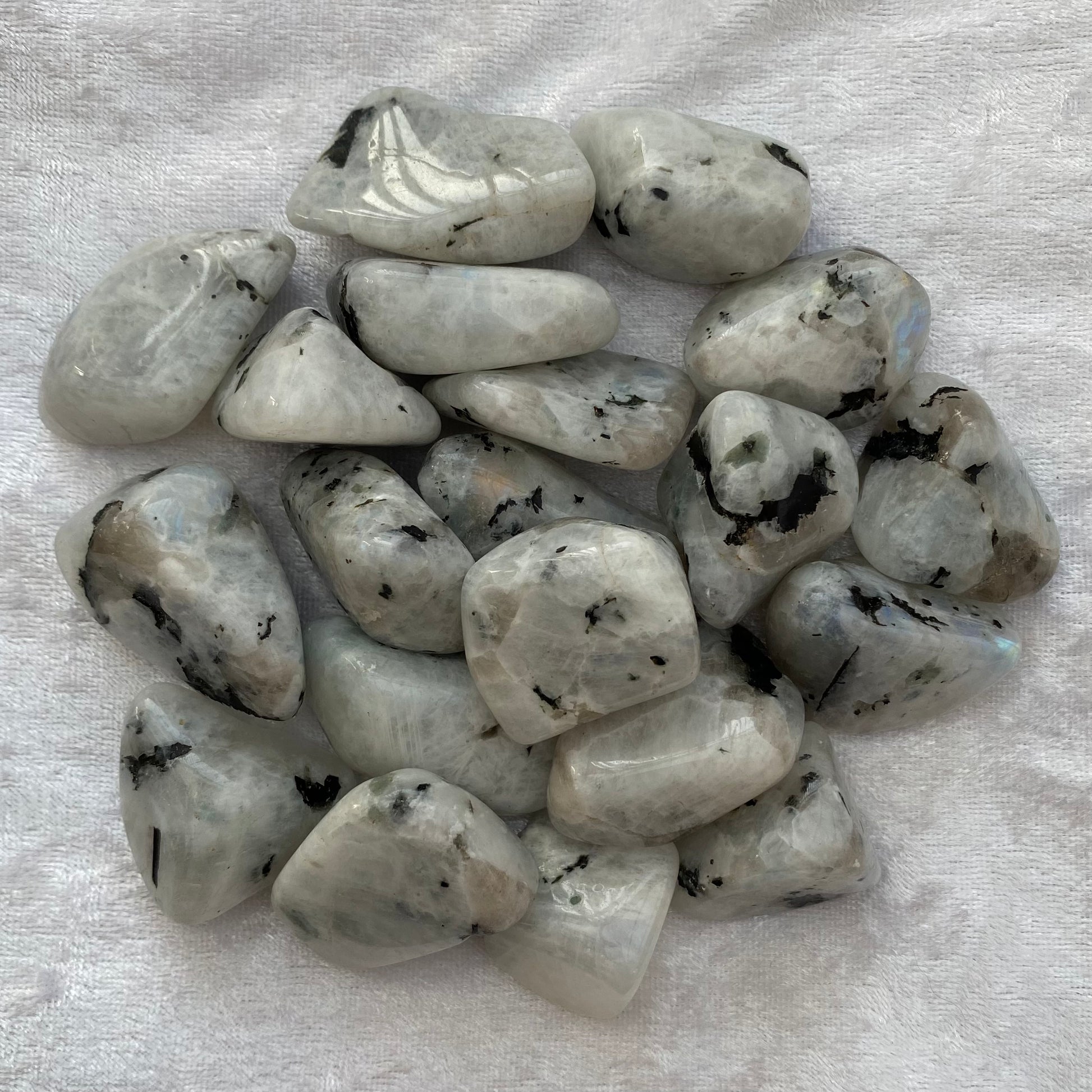 Moonstone is a variety of the feldspar-group mineral orthoclase. It’s composed of two feldspar minerals, orthoclase and albite. At first, the two minerals are intermingled. Then, as the newly formed mineral cools, the intergrown orthoclase and albite separate into stacked, alternating layers.