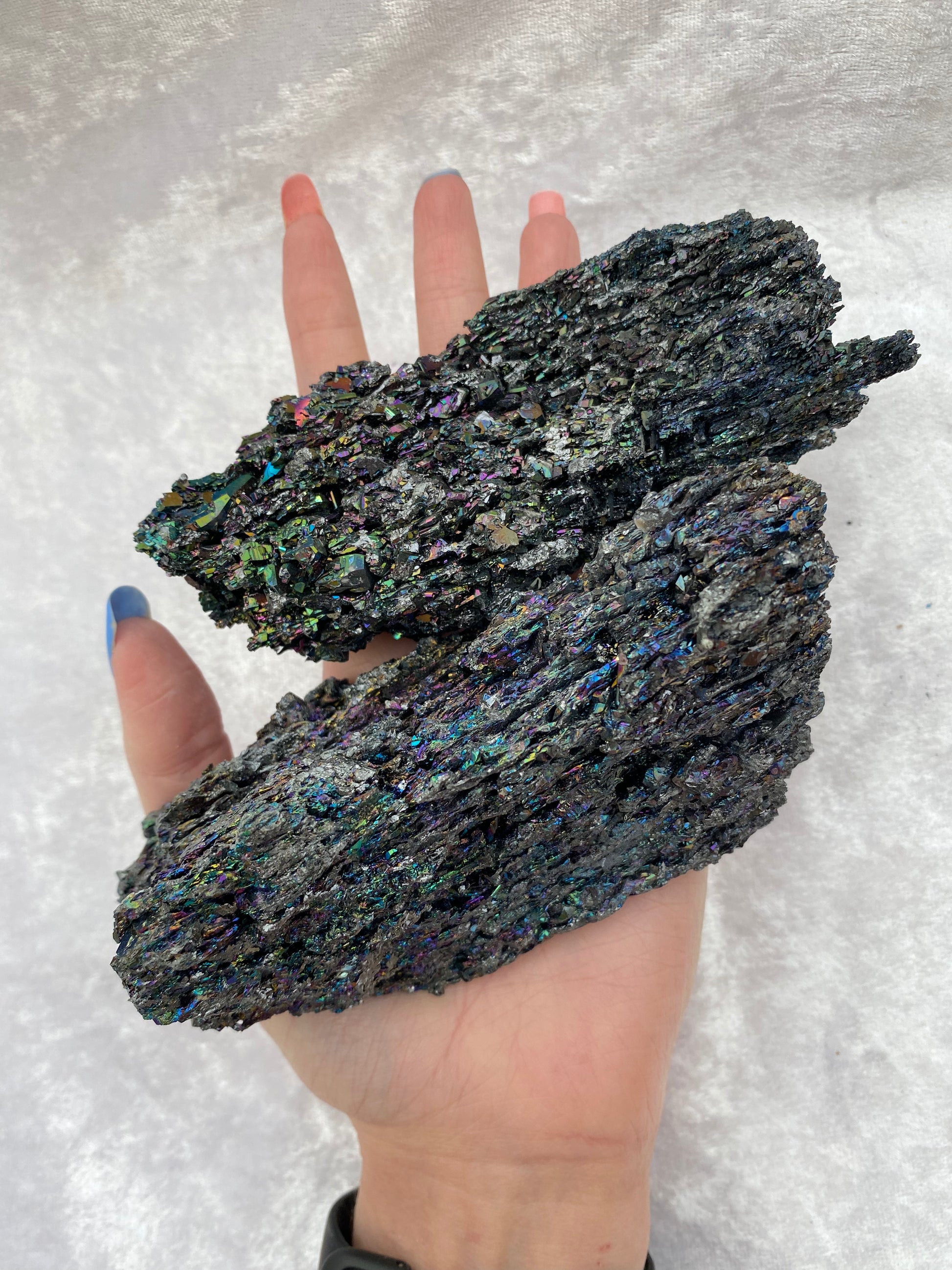 Carborundum is produced artifically in large quantities as an abrasive. Most is crushed and used in griding grits and abrasive papers. It is made up of hexagonal plates of silicon carbide with irridescent surface colours.