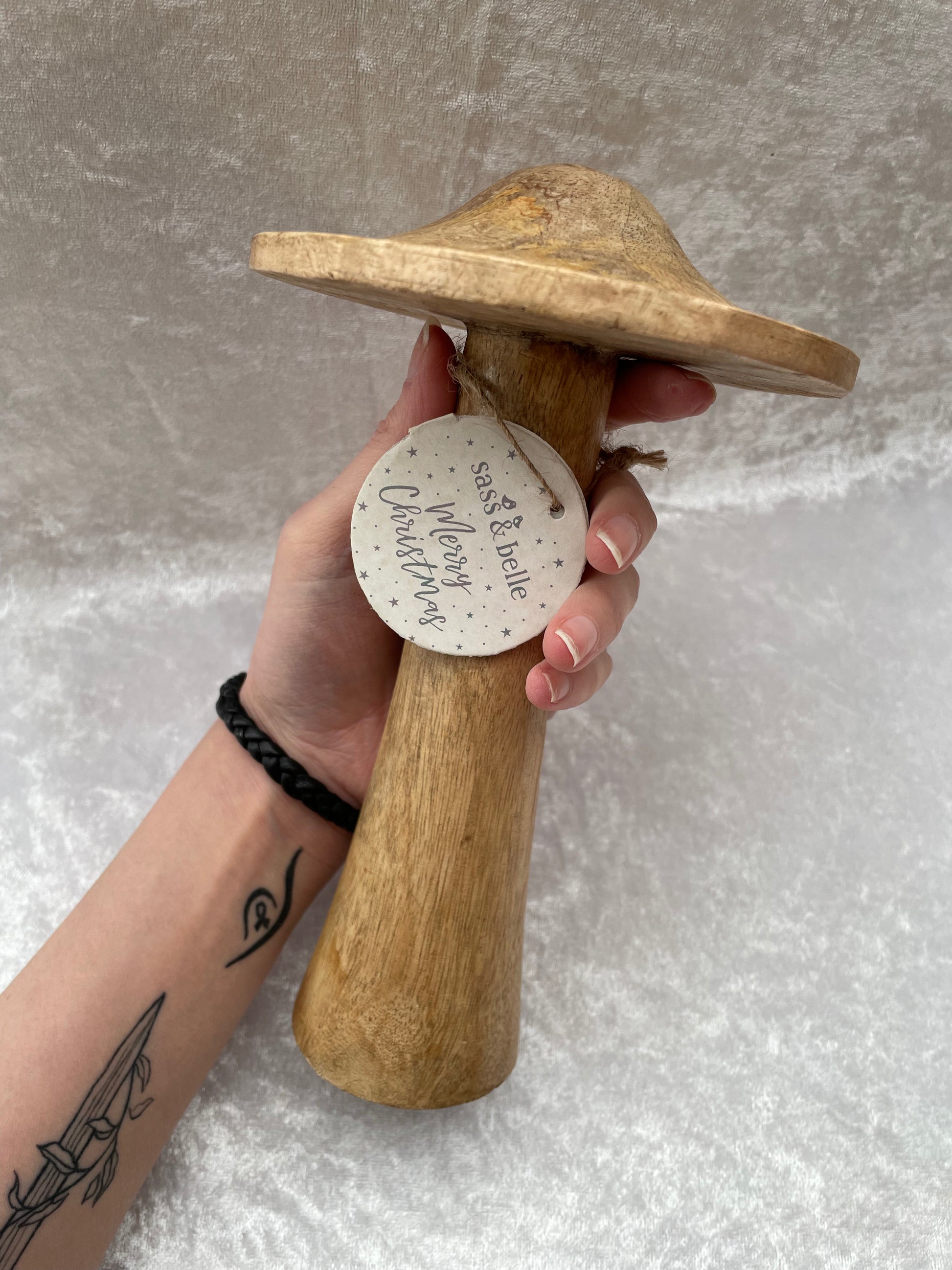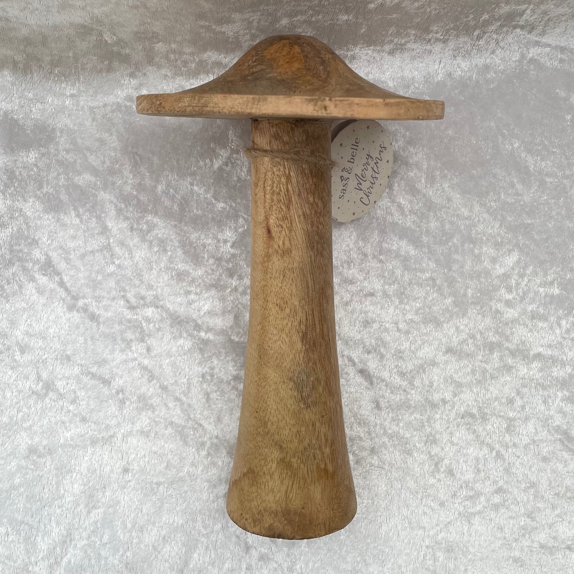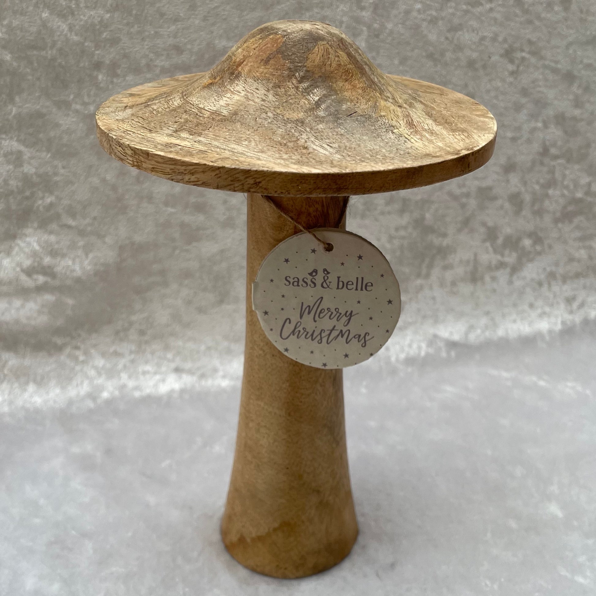 A carved wooden mushroom ornament. Perfect for decorating the home at Christmas or any time of year.