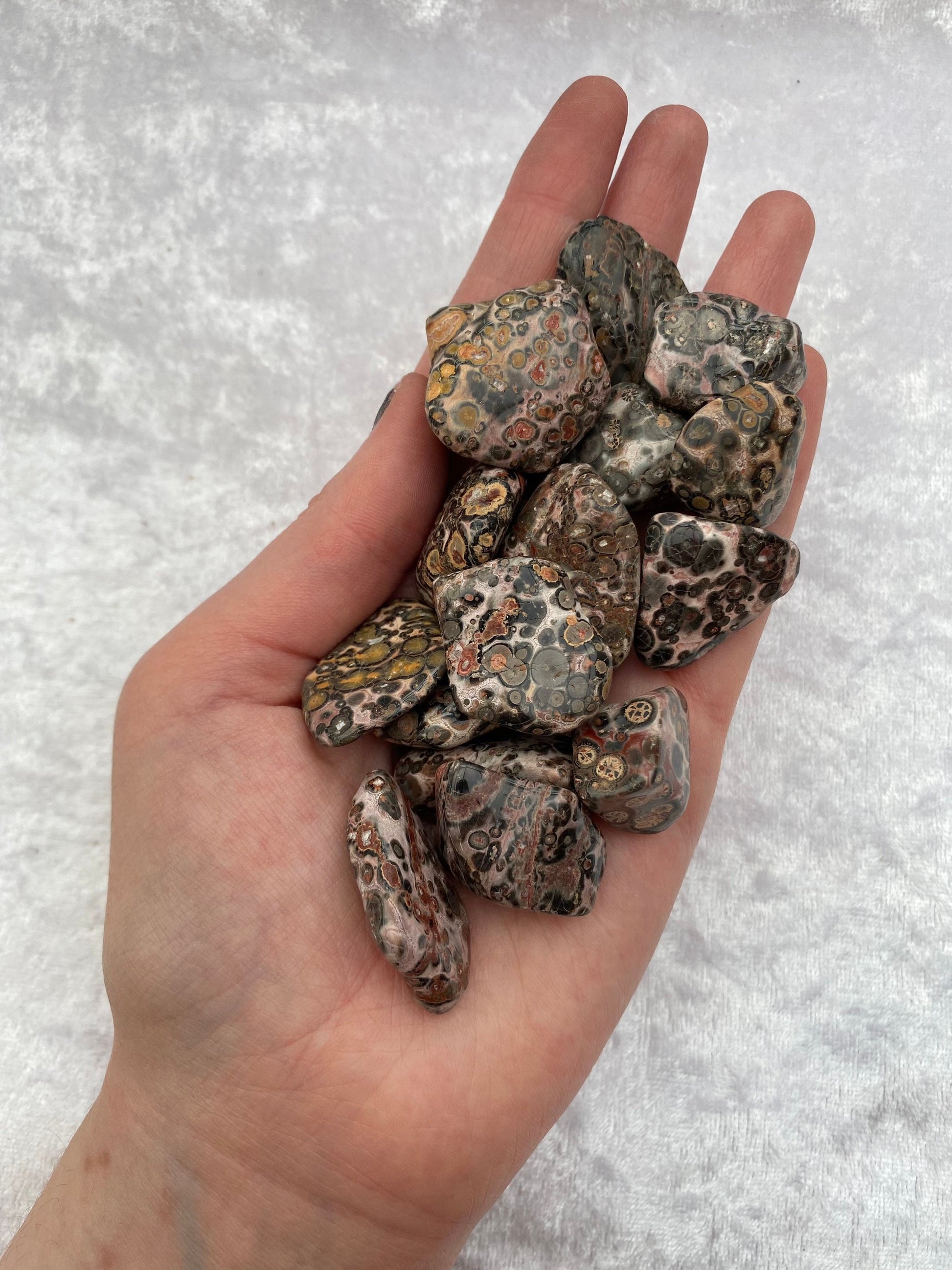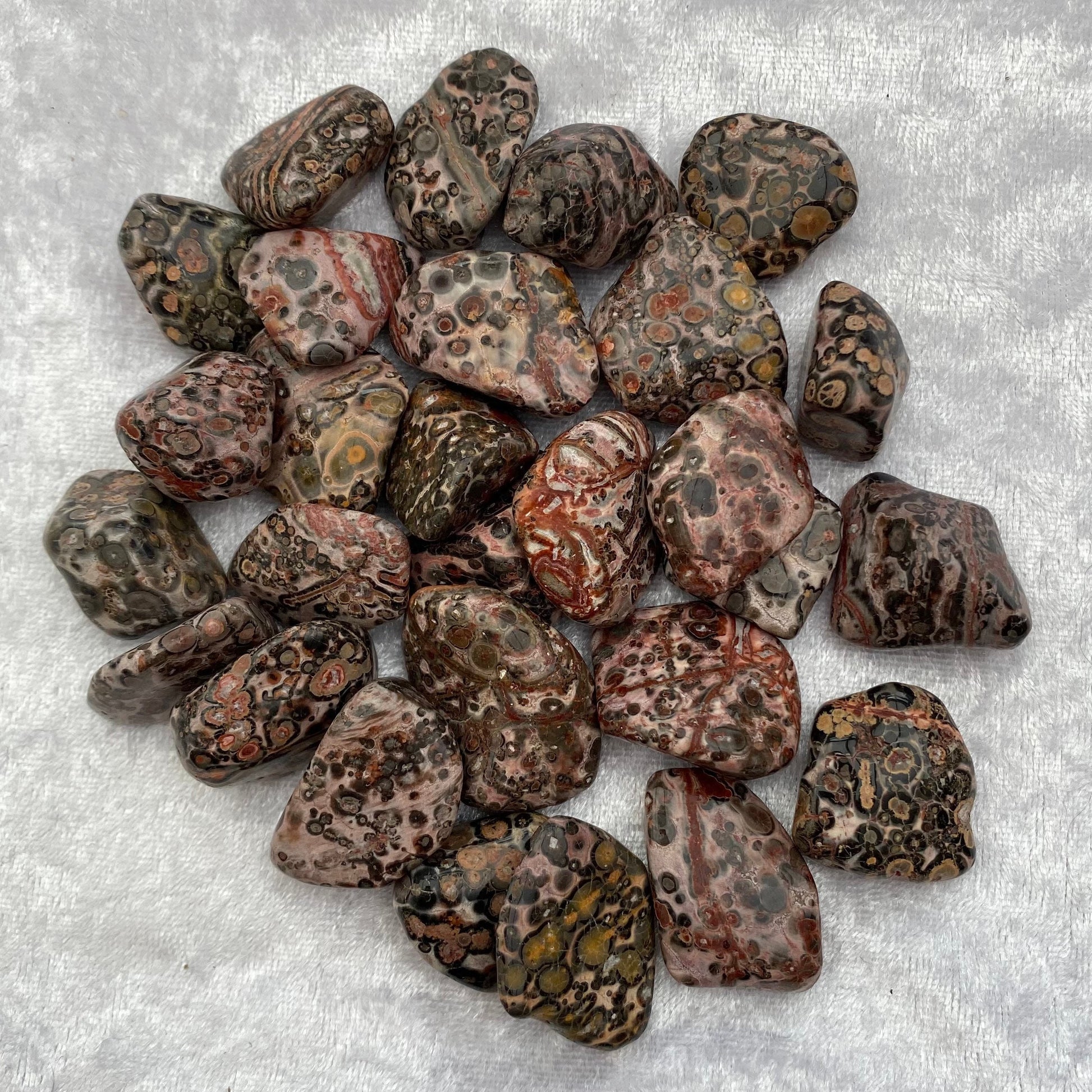 Leopardskin jasper, also sometimes referred to as jaguar stone, is a beautiful stone of many colors with distinct spotted patterns. Leopardskin jasper is a silicon dioxide with various inclusions that create the unique and desirable patterns.