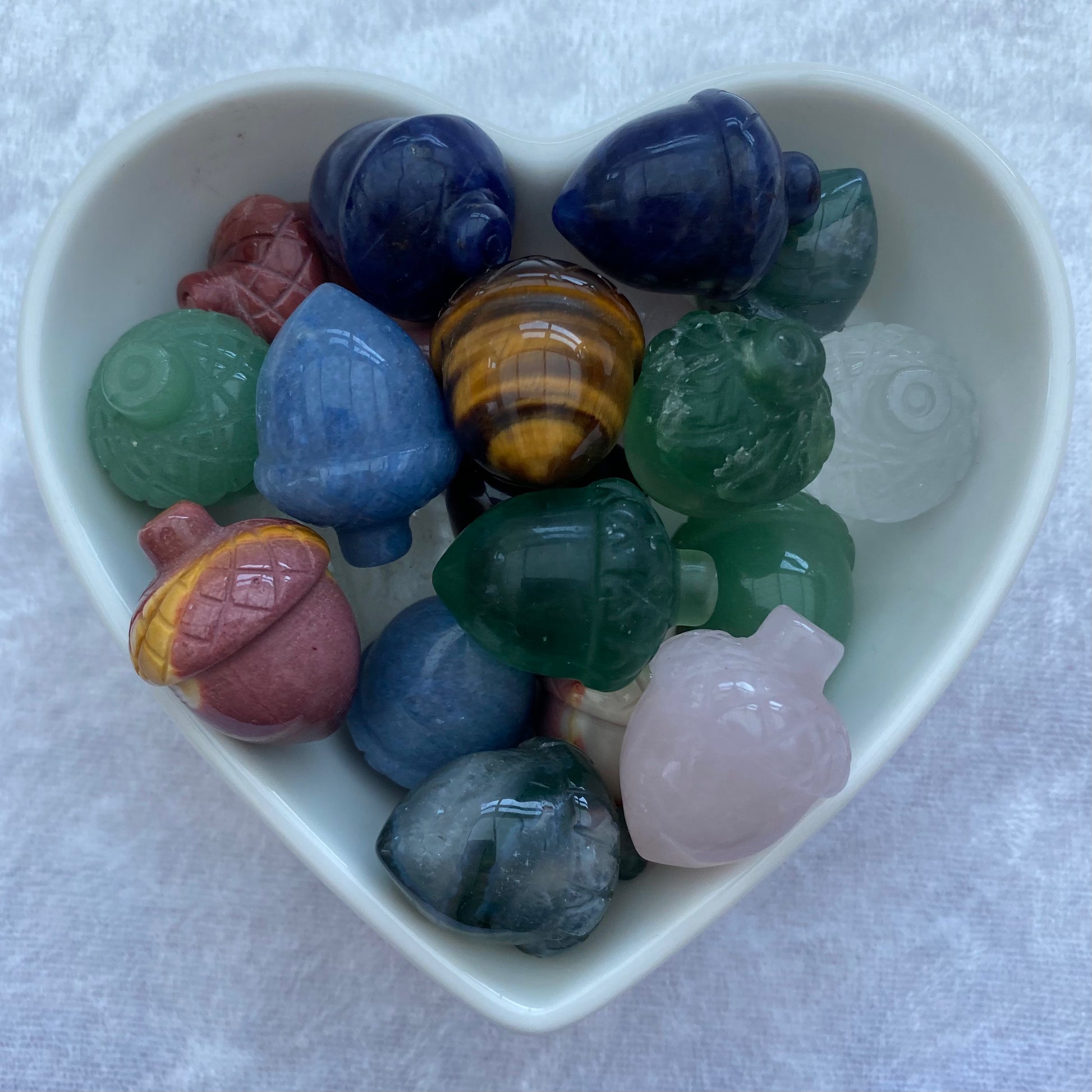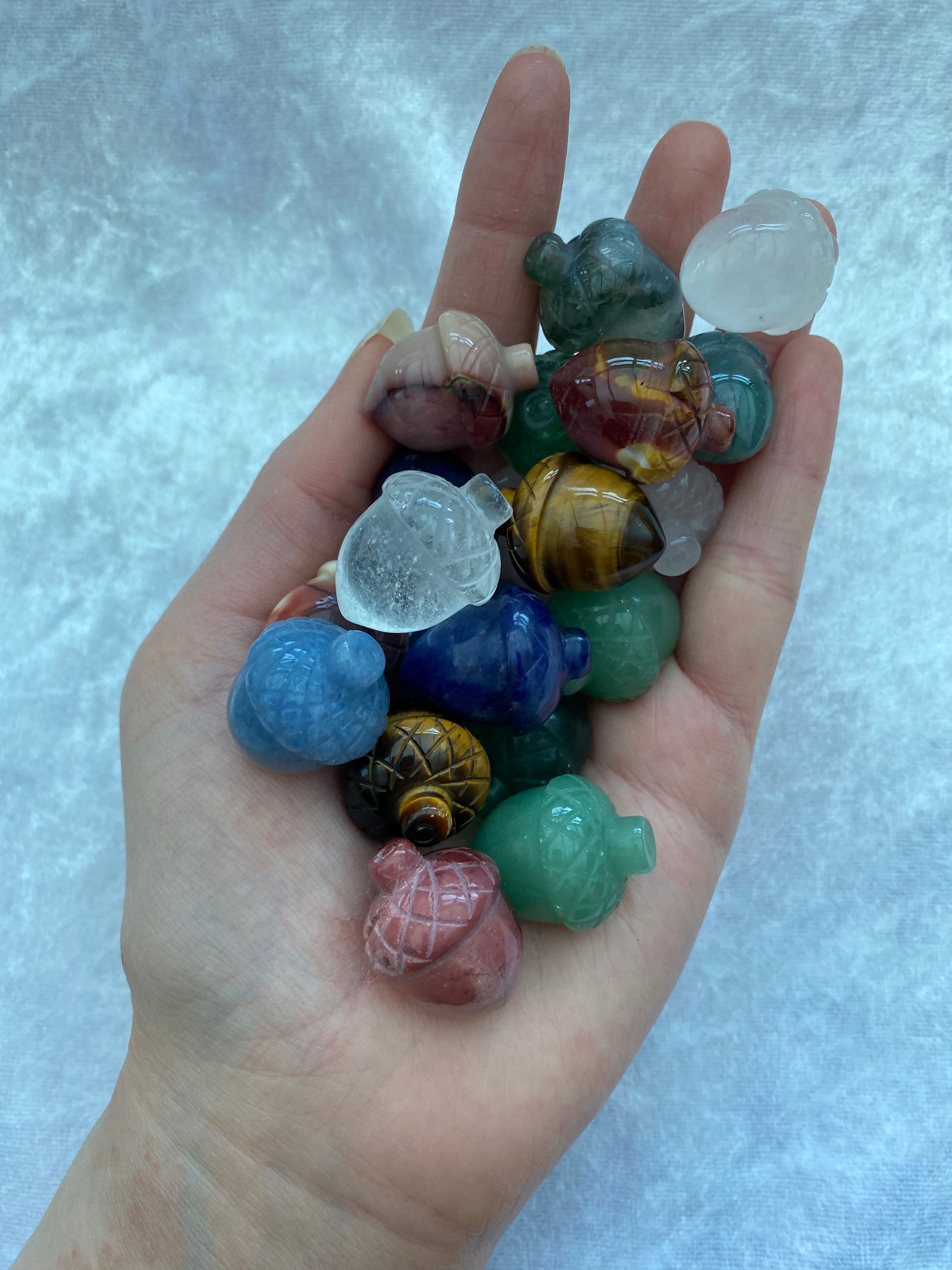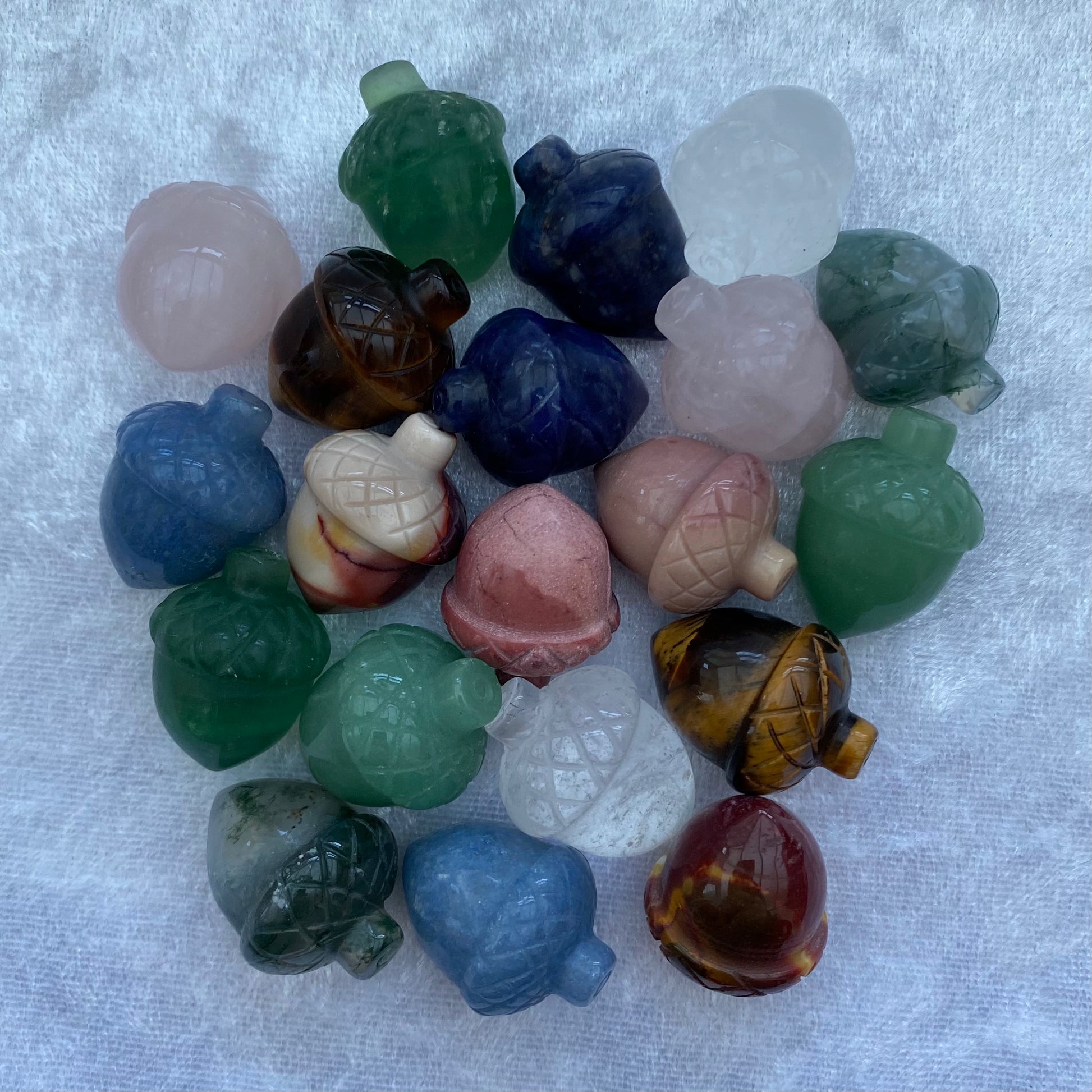 A selection of miniature acorn carvings including Angelite, Clear Quartz, Green Aventurine, Mookaite, Moss Agate, Rose Quartz, Sodalite, Tigers Eye and Fluorite.
