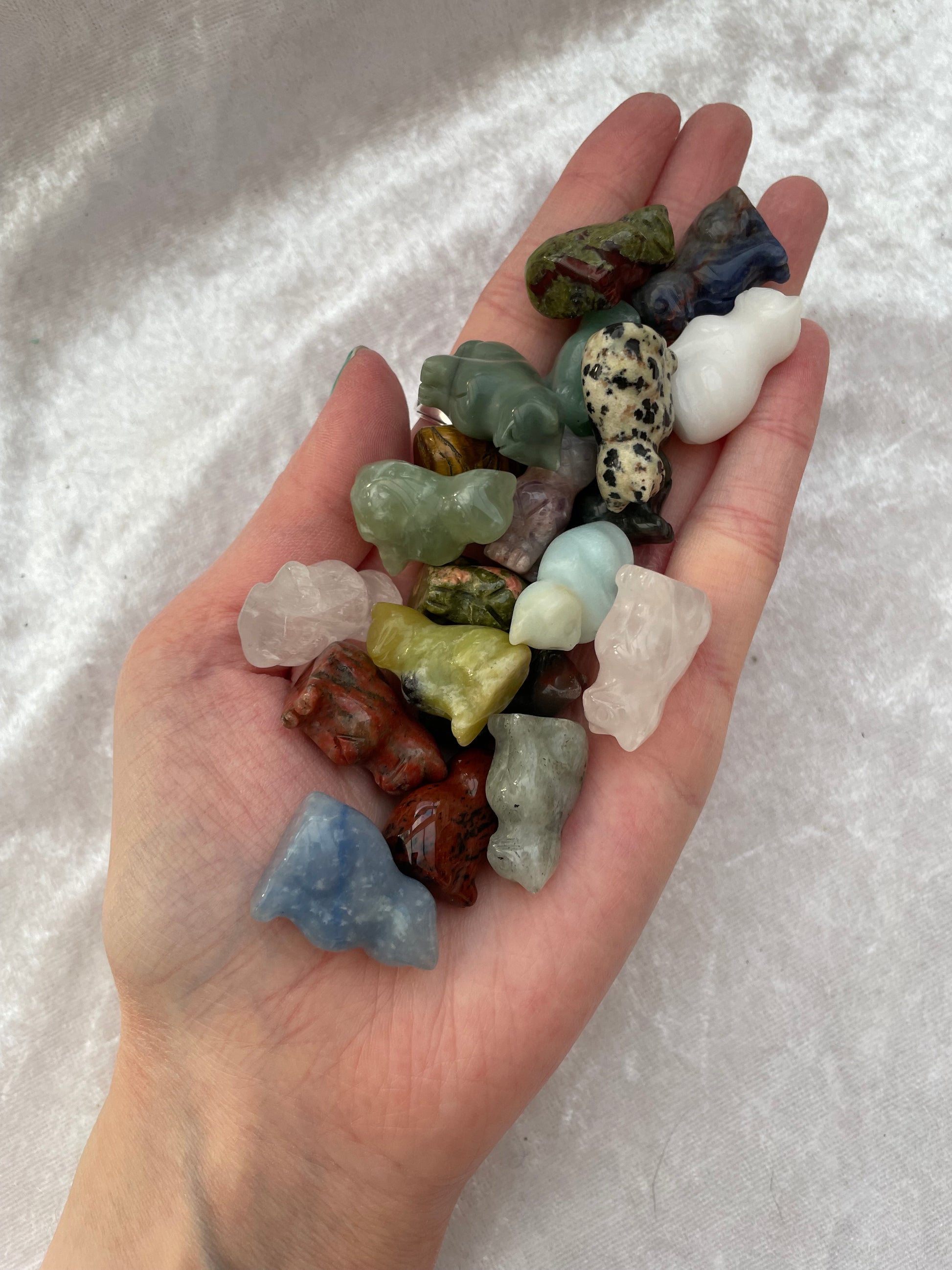 A selection of miniature Crystal cats available in Blue Quartz, New Jade, Serpentine, Green Aventurine, Mahogany Obsidian, Dalmatian Jasper, Brecciated Jasper, Amethyst, Dragons Blood Jasper, Milky Quartz, Unakite, Clear Quartz, Seftonite, Sodalite, Tigers Eye, Rose Quartz, Prehnite and Jade.