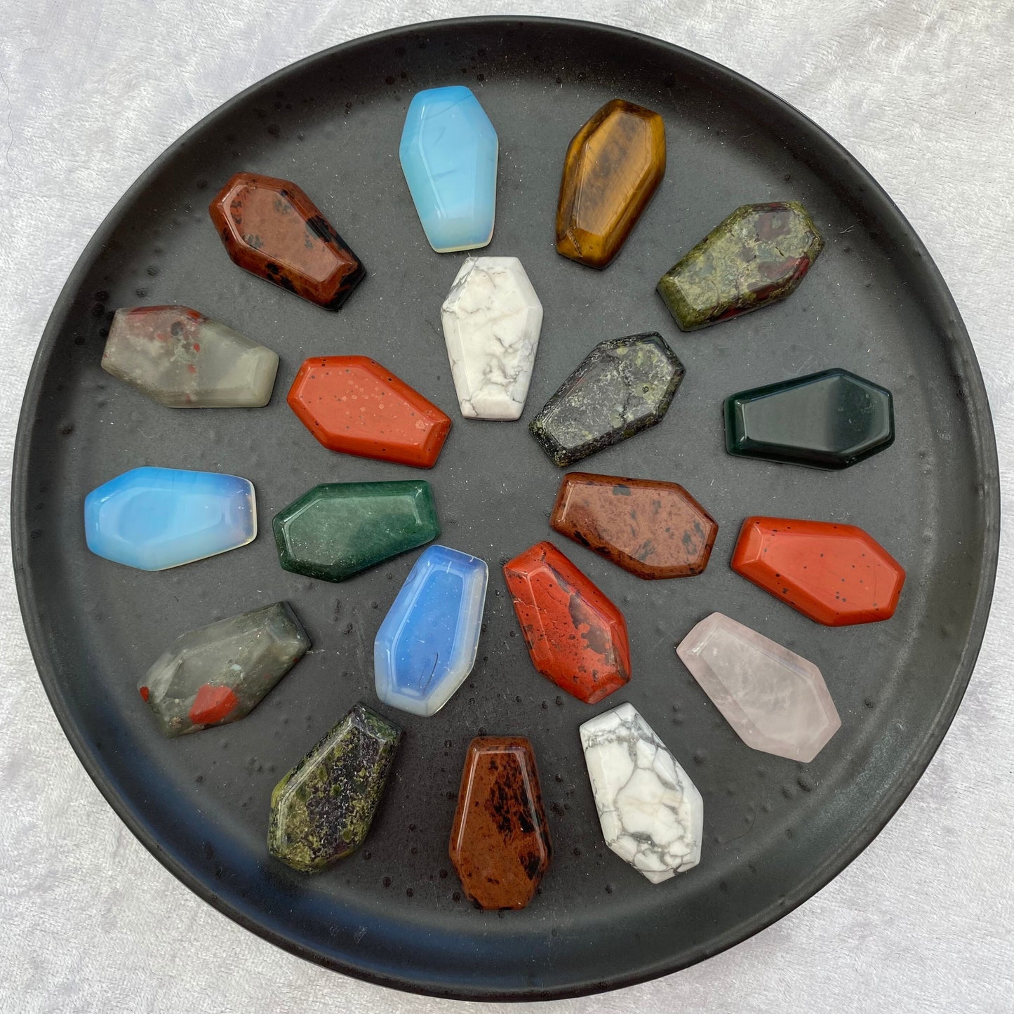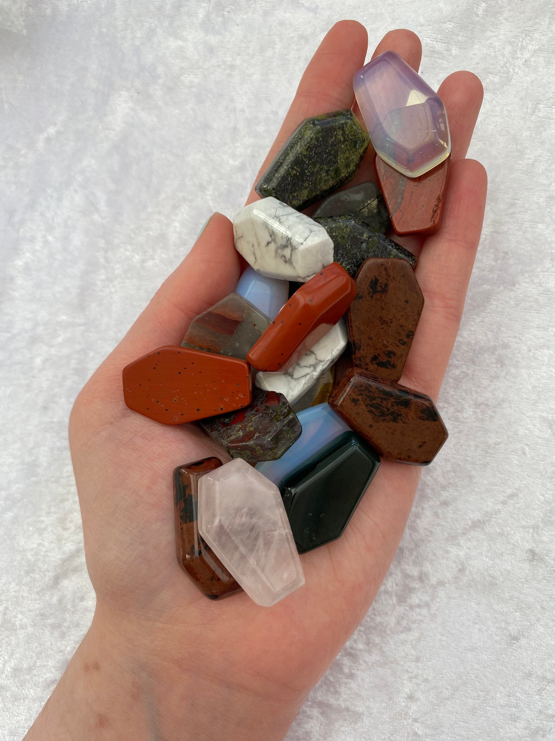A selection of miniature crystals coffins including Mahogany Obsidian, Green Aventurine, Tigers Eye, Red Jasper, Opalite, Rose Quartz, Dragons Blood Jasper, White Howlite, Seftonite and Moss Agate.