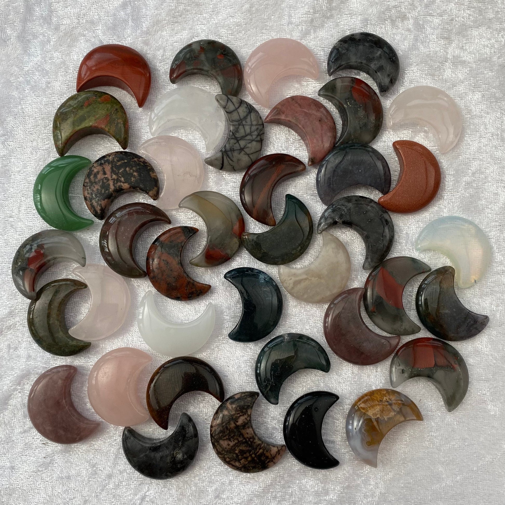 A selection of mini crystal moons including Clear Quartz, Net Jasper, Red Jasper, Opalite, Green Aventurine, Tigers Eye, Tiger Iron, Unakite, Brecciated Jasper, Milky Quartz, White Agate, Goldstone, Blue Goodstone, Rose Quartz, Rhodonite, Larvikite, Moss Agate, Ocean Jasper, Crazy Lace Agate and Bloodstone.