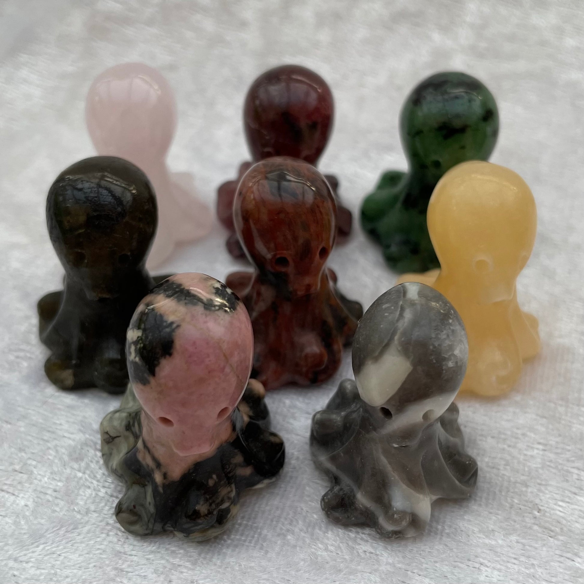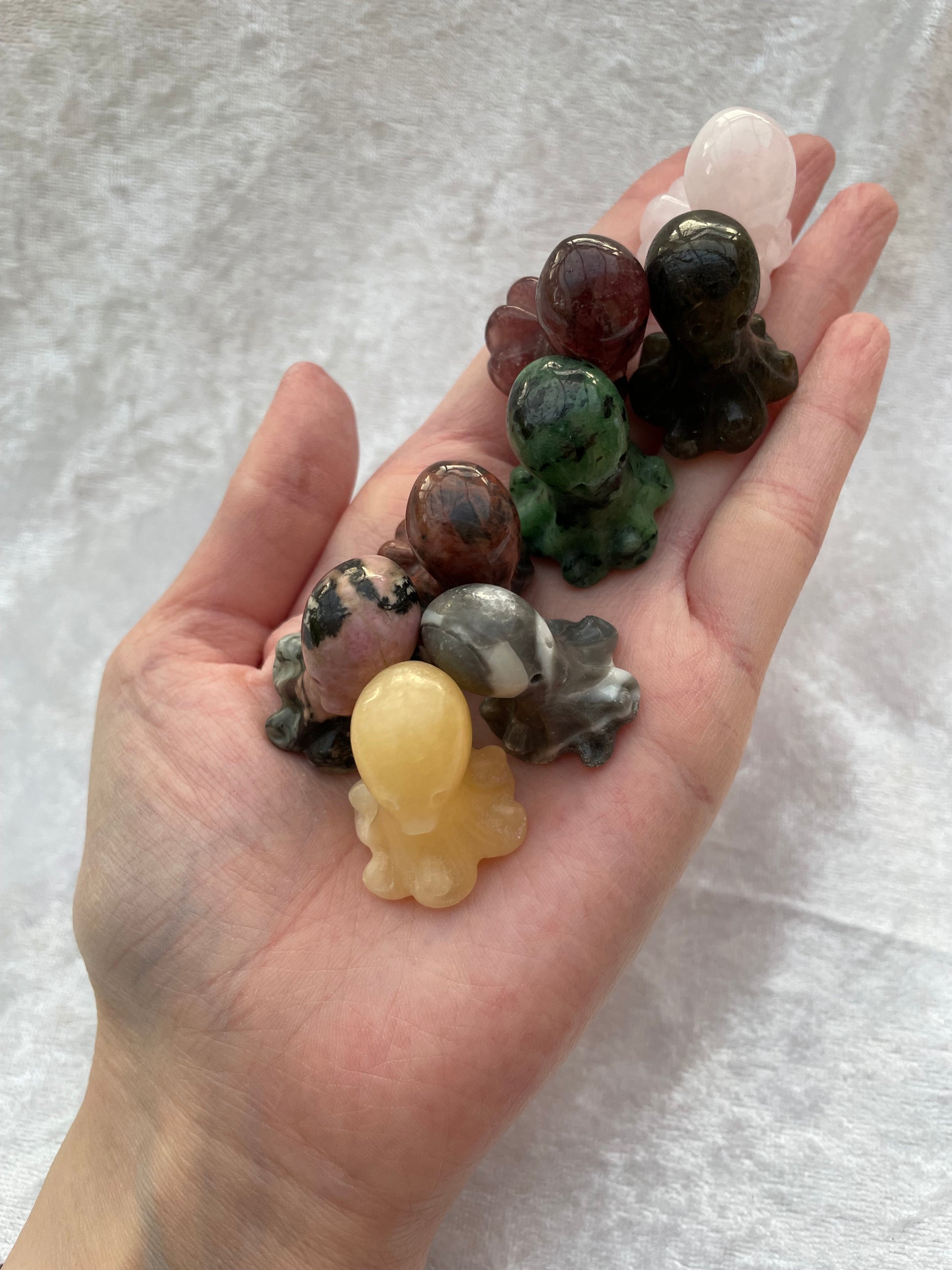 A selection of miniature crystal octopus carvings including brecciated jasper, strawberry quartz, labradorite, rose quartz, aragonite, shell jasper, sodalite, yooperlite, Ruby zoisite and rhodonite.
