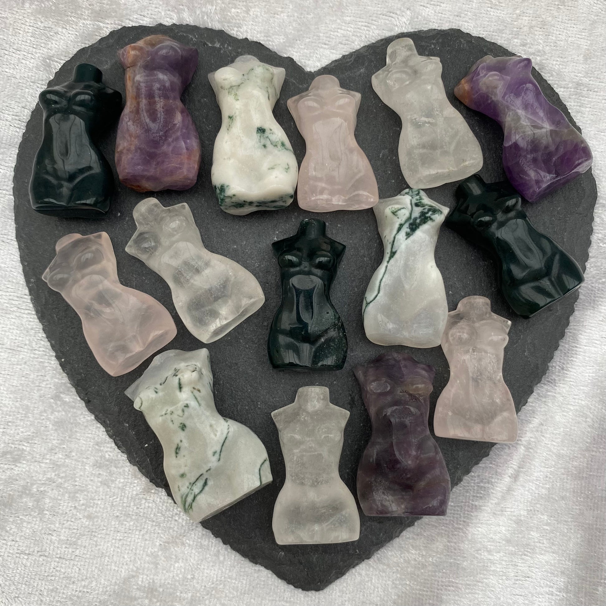 A selection of miniature Crystal torsos including Amethyst, Clear Quartz, Rose Quartz, Moss Agate and Tree Agate.