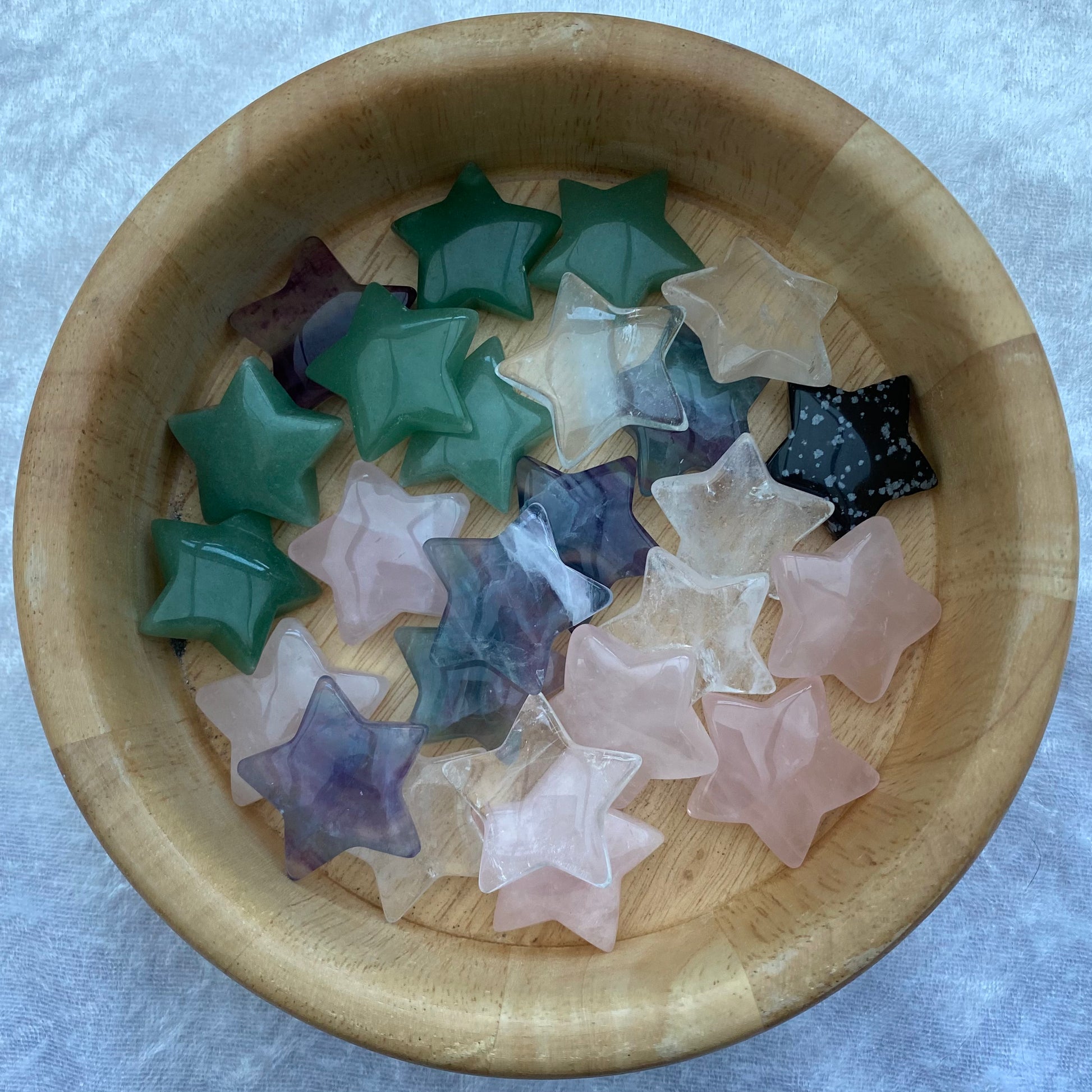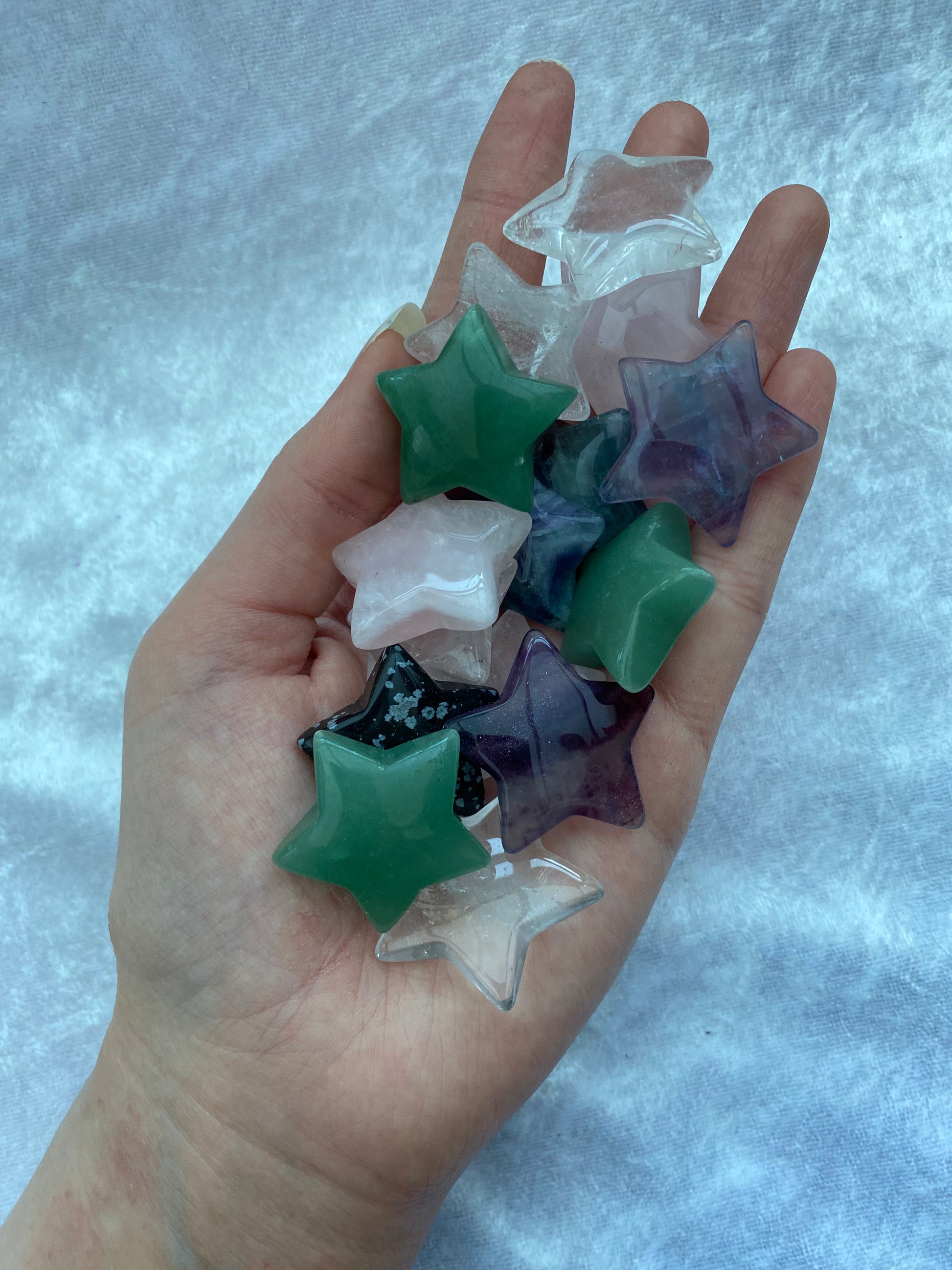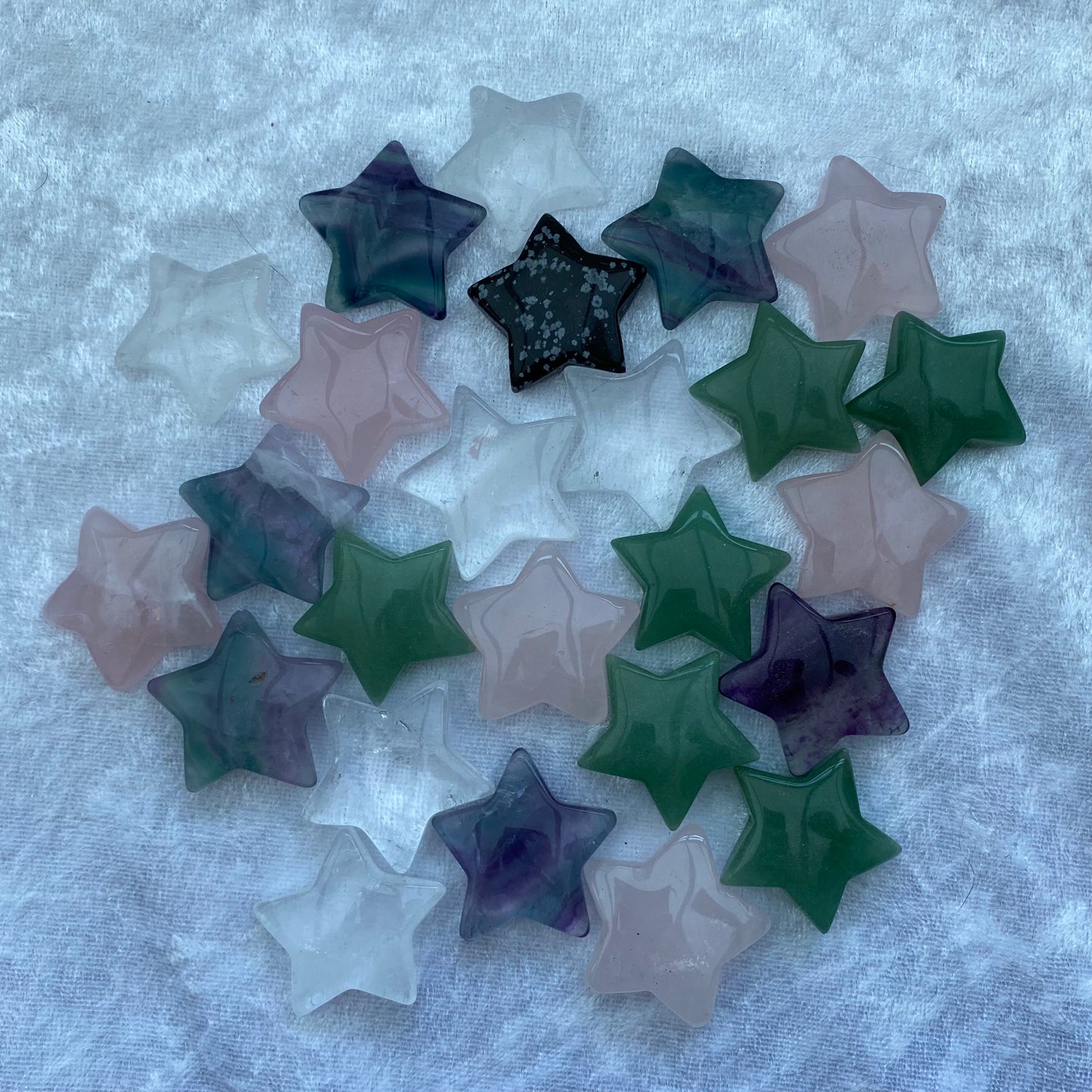 A selection of miniature star carvings including Clear Quartz, Rainbow Fluorite, Green Aventurine, Rose Quartz and Snowflake Obsidian.