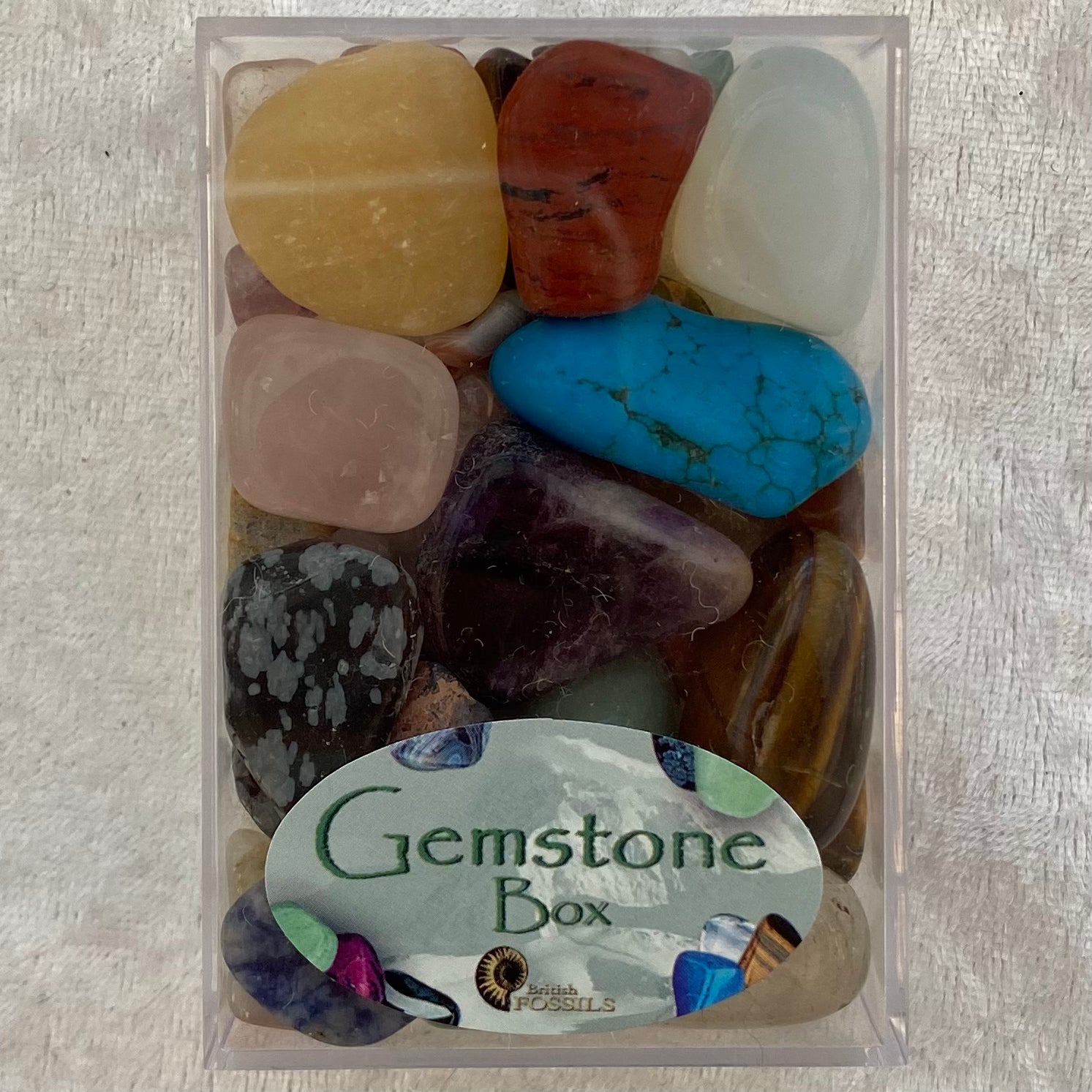 A clear box full of crystal tumblestones of all types from around the world. Perfect for children or for new collectors to build up their collection.