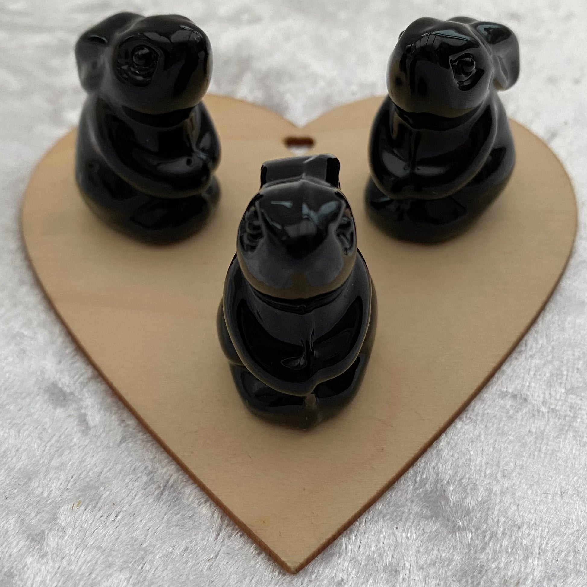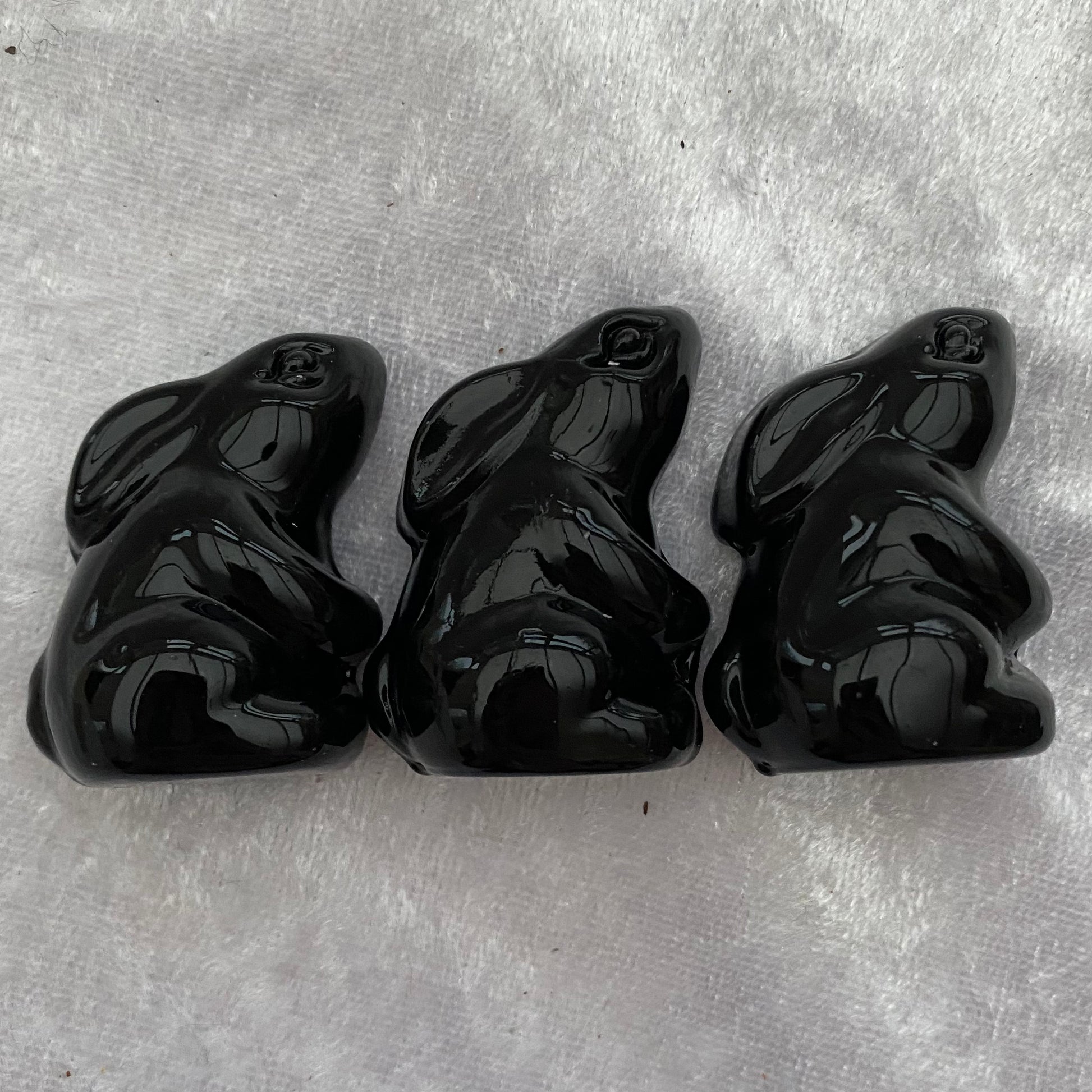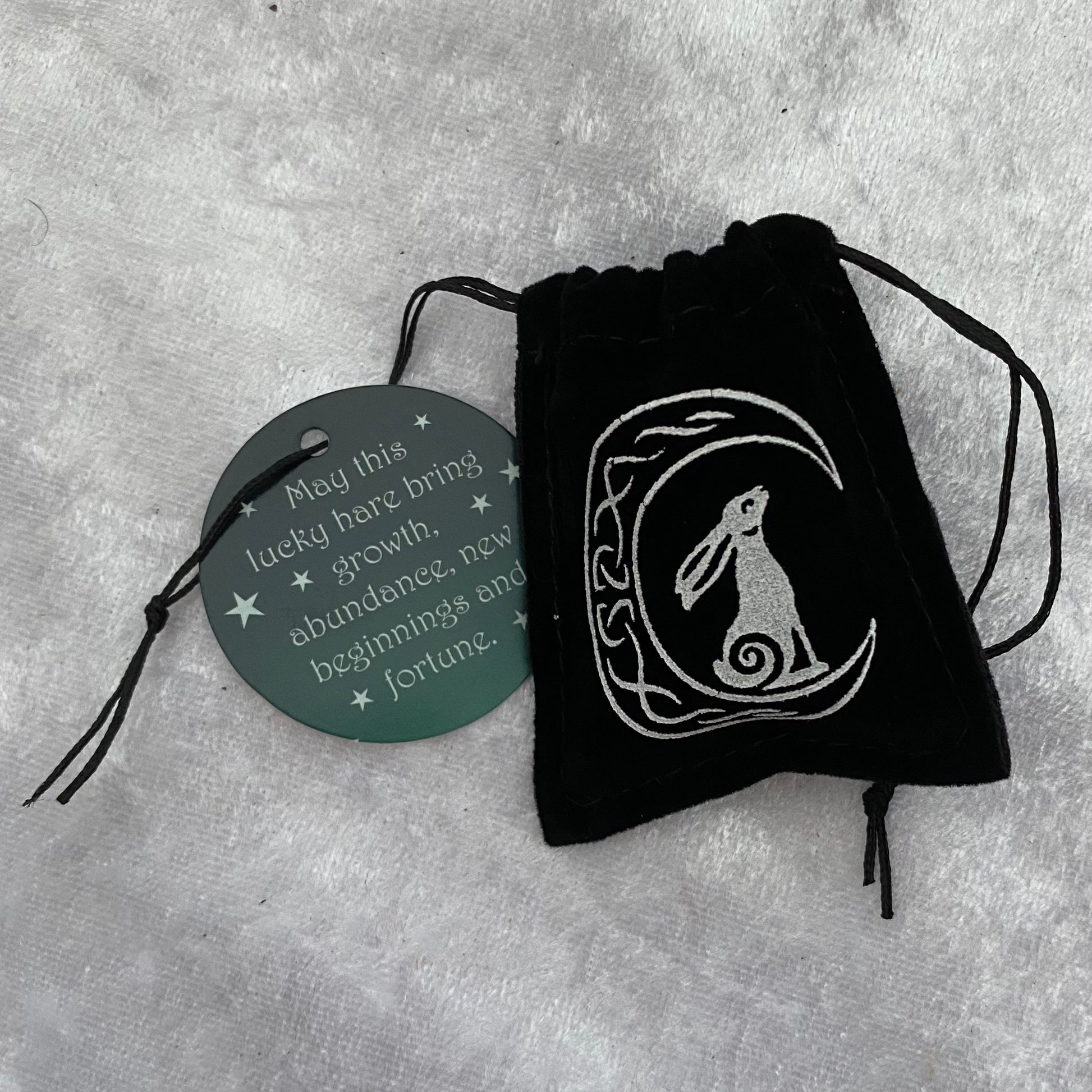 Lucky moon gazing hares made from black glass and sent in a velvet pouch. These charms are believed to bring growth, abundance, new beginnings and fortune.