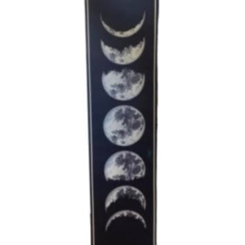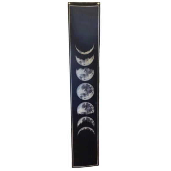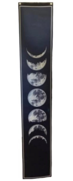 This wall hanging features a moon phases design on a black background composed of cotton and silk. It can be hung by the two eye holes at the top of the fabric. The measurements of this wall hanging are 169cm x 30cm.