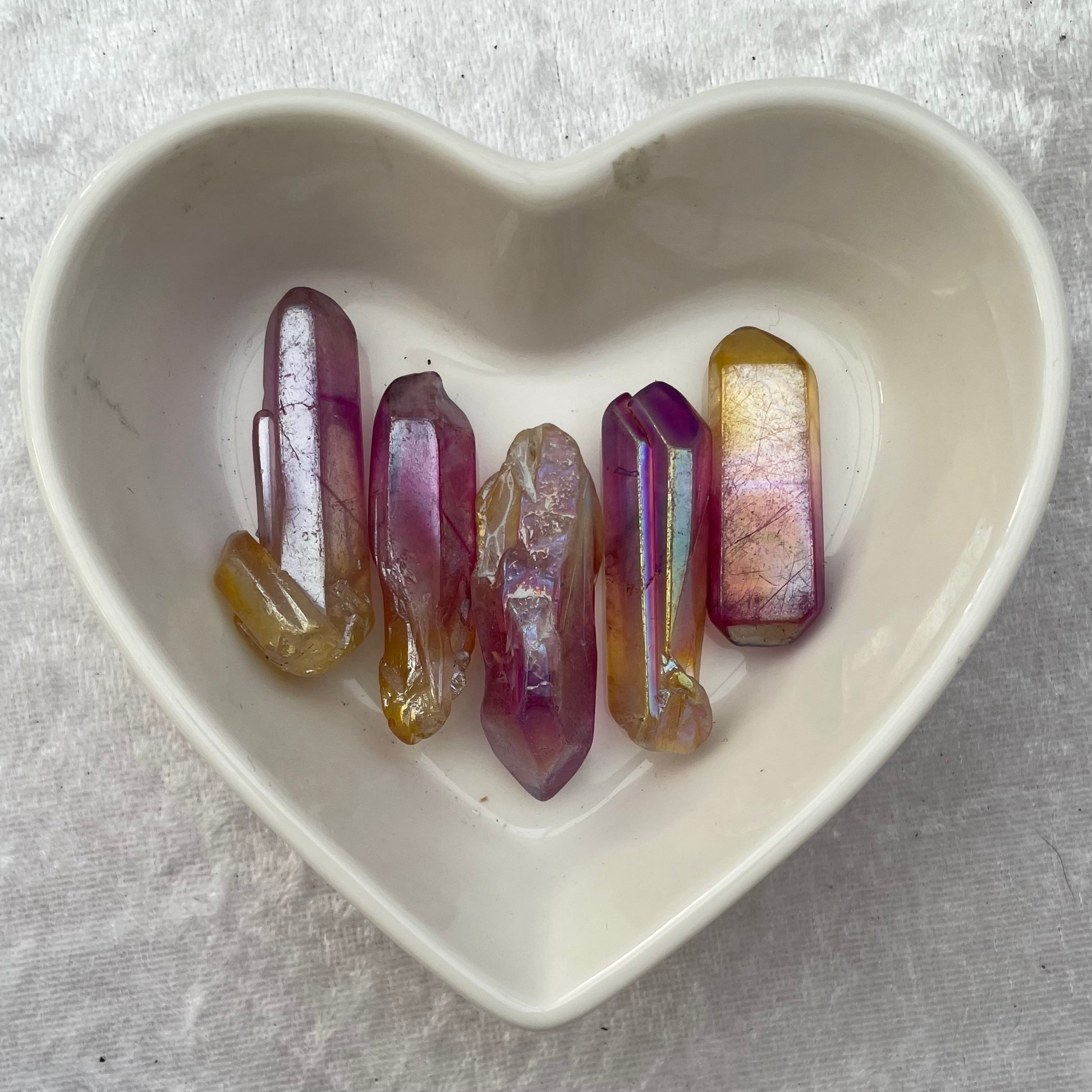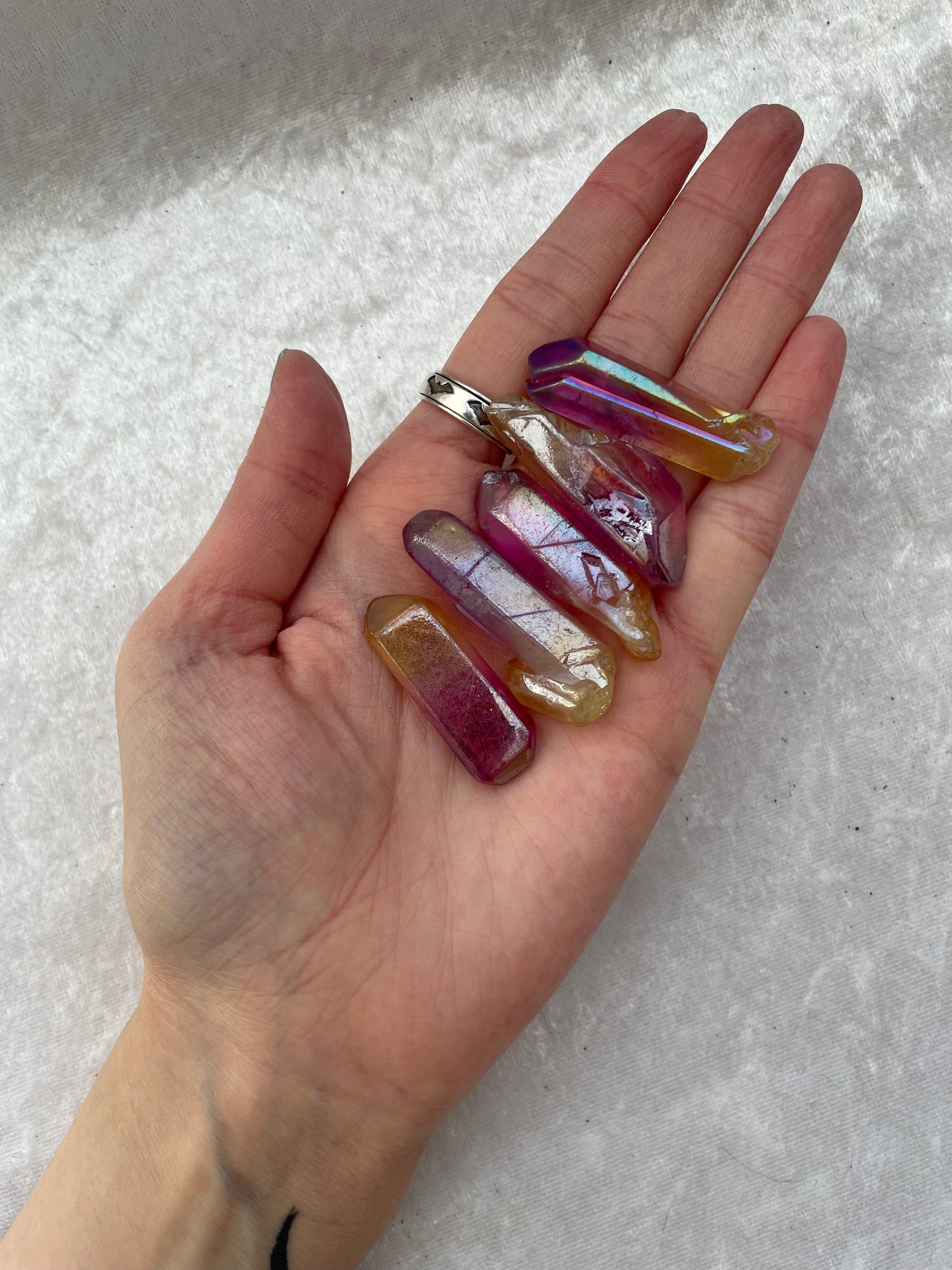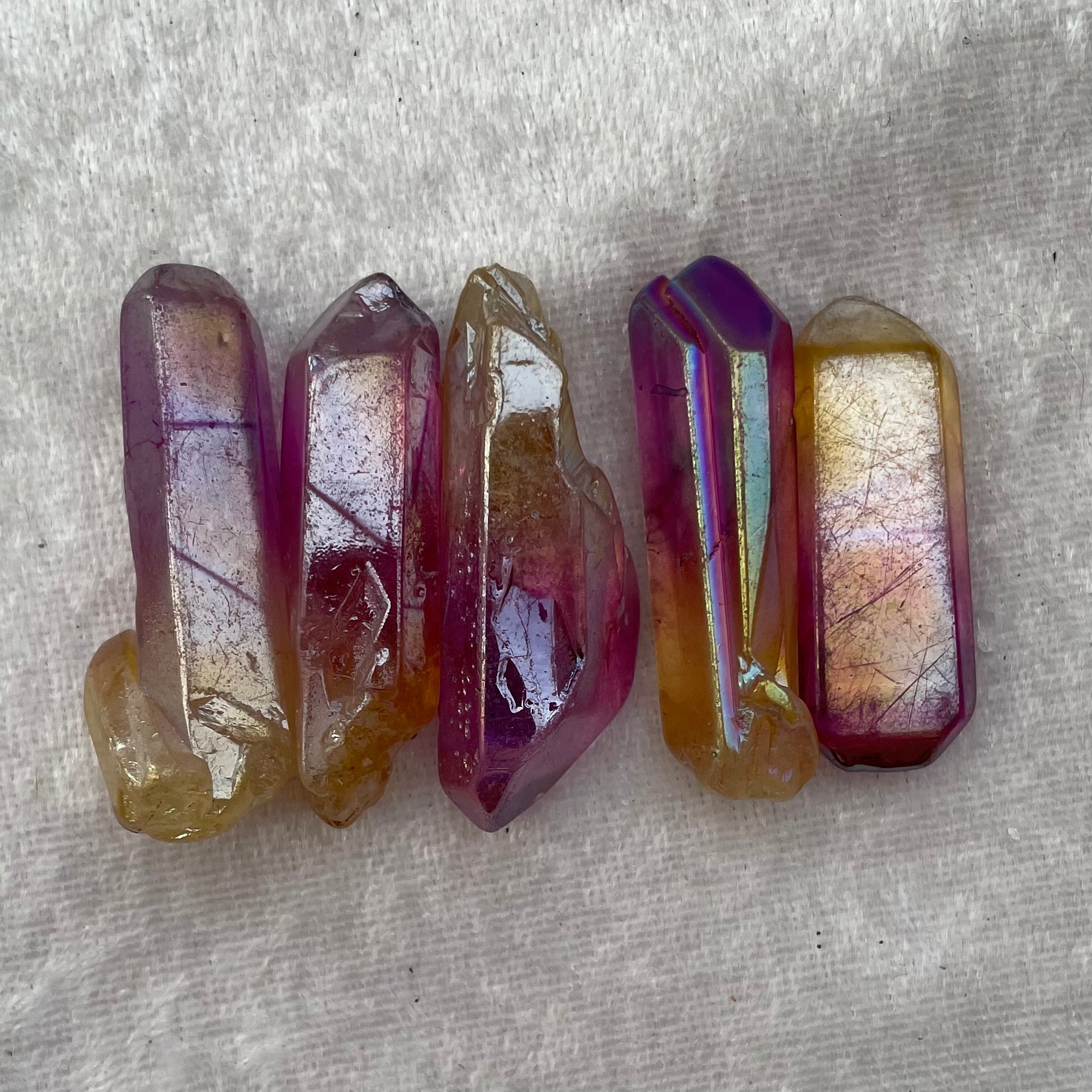 Aura crystals are made by heating Quartz crystals to an extremely high temperature then coating them with fine vaporized precious metals. This gives them a rainbow sheen.