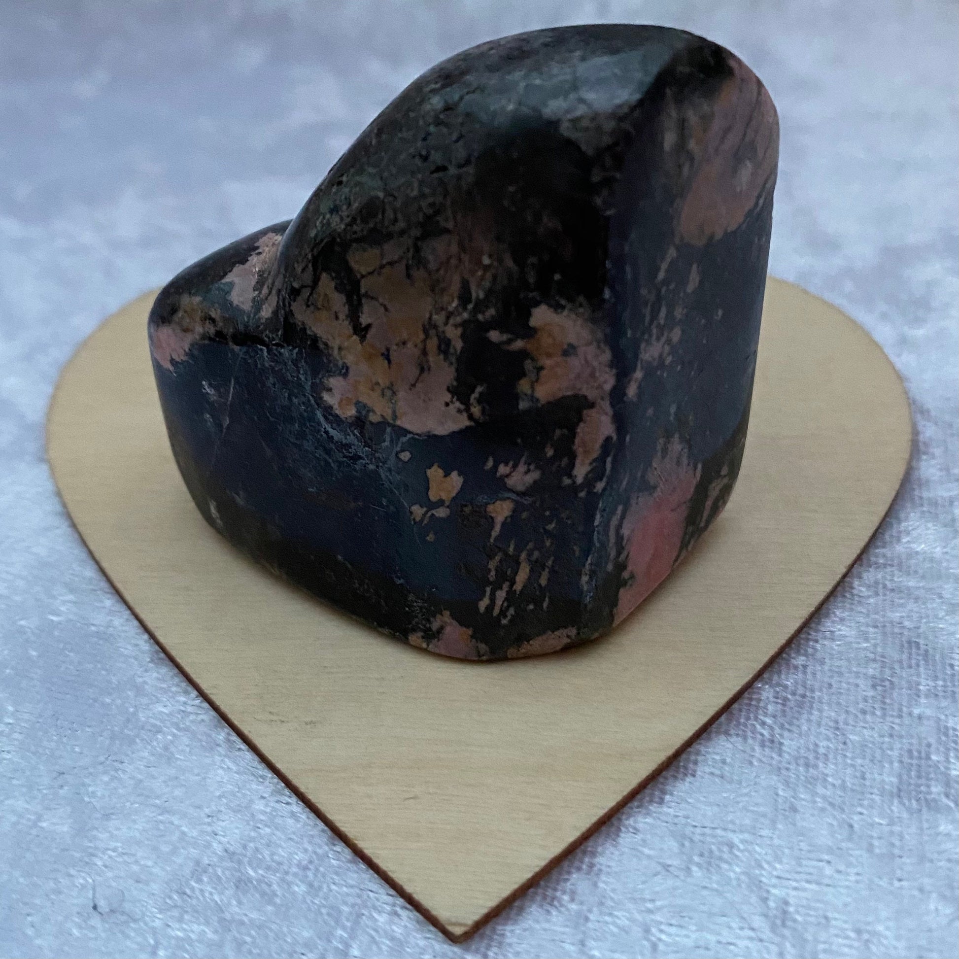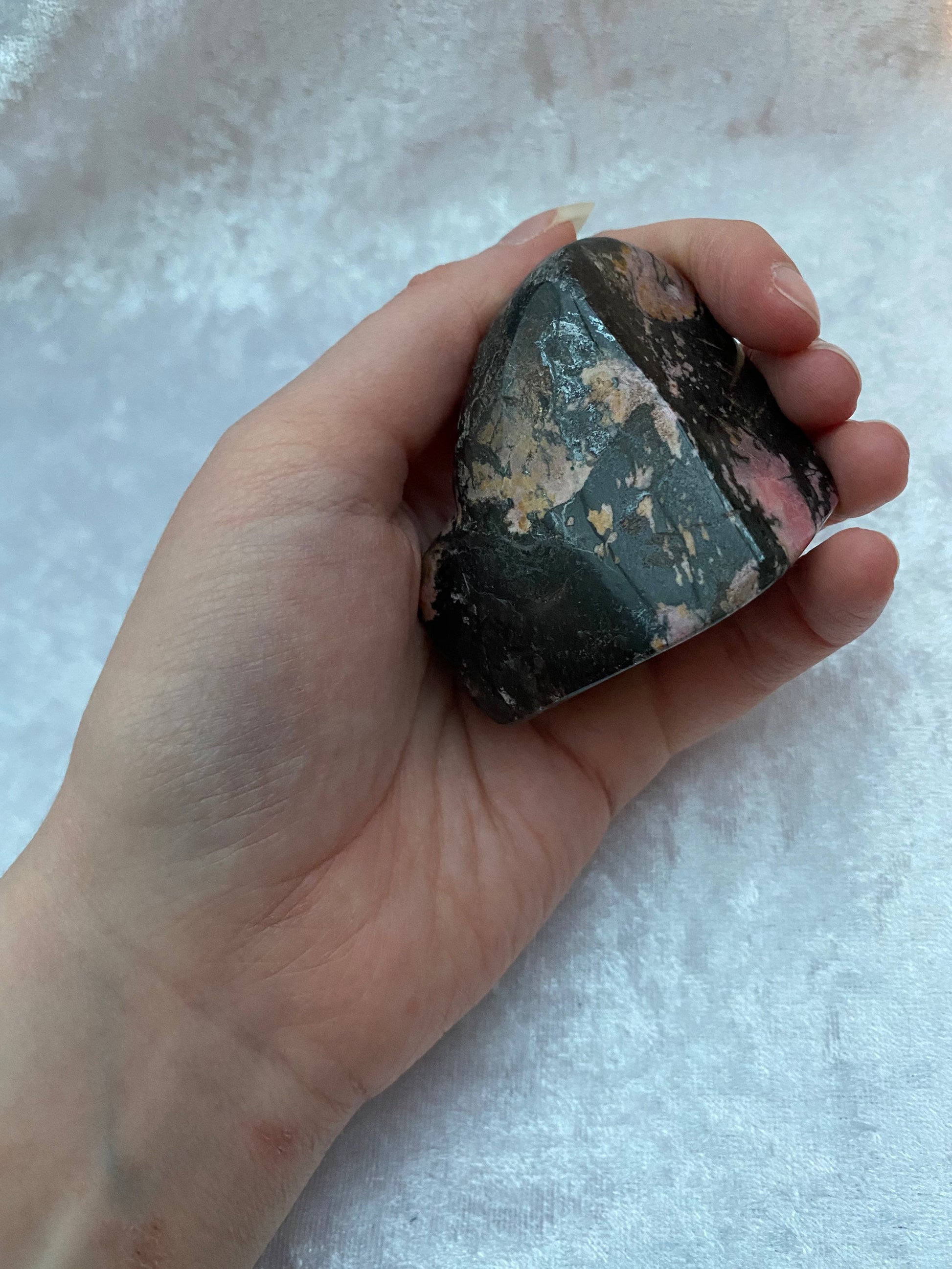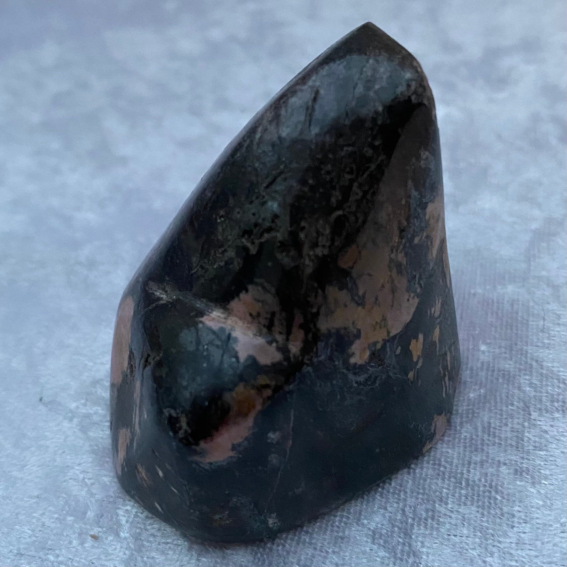 The Rhodonite crystal meaning comes from the word rhodon, which means ‘rose’ in Greek. Rhodonite often has black manganese oxide veins running through a specimen, giving it the distinct appearance of pink with black crisscrossing lines and flower-like formations throughout.