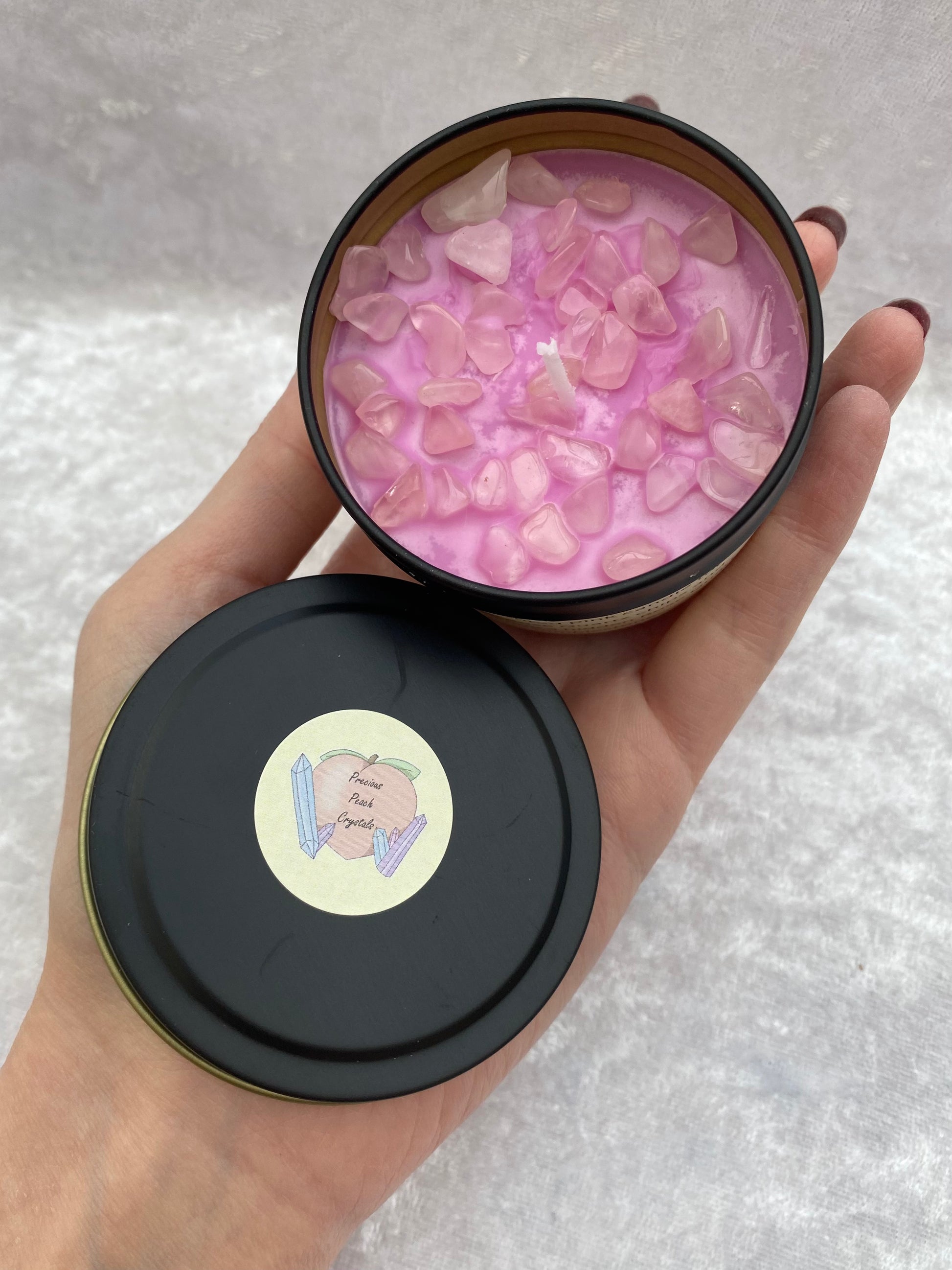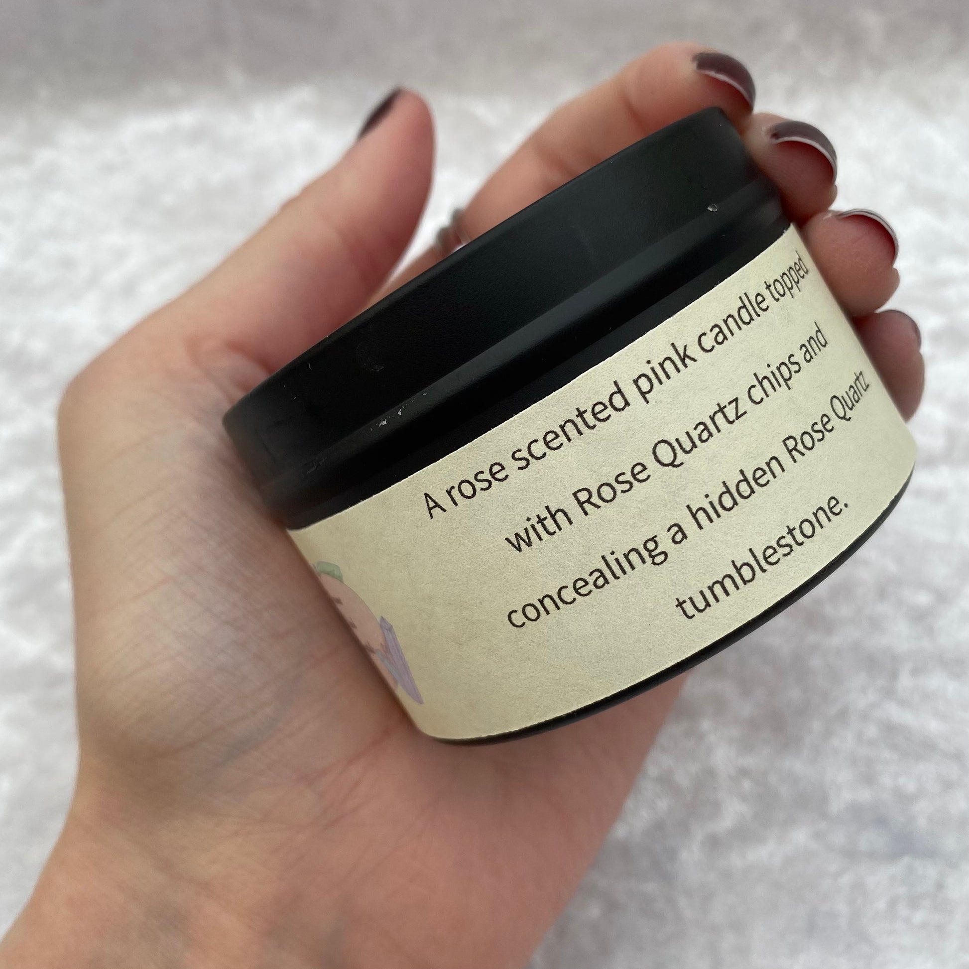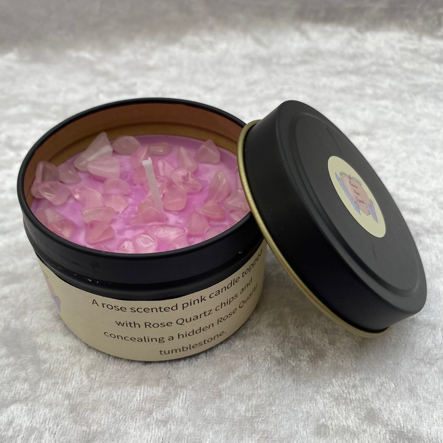 A rose scented pink candle topped with Rose Quartz chips and concealing a hidden Rose Quartz tumblestone to uncover as the candle burns.