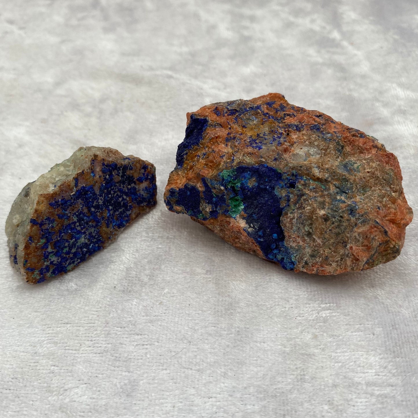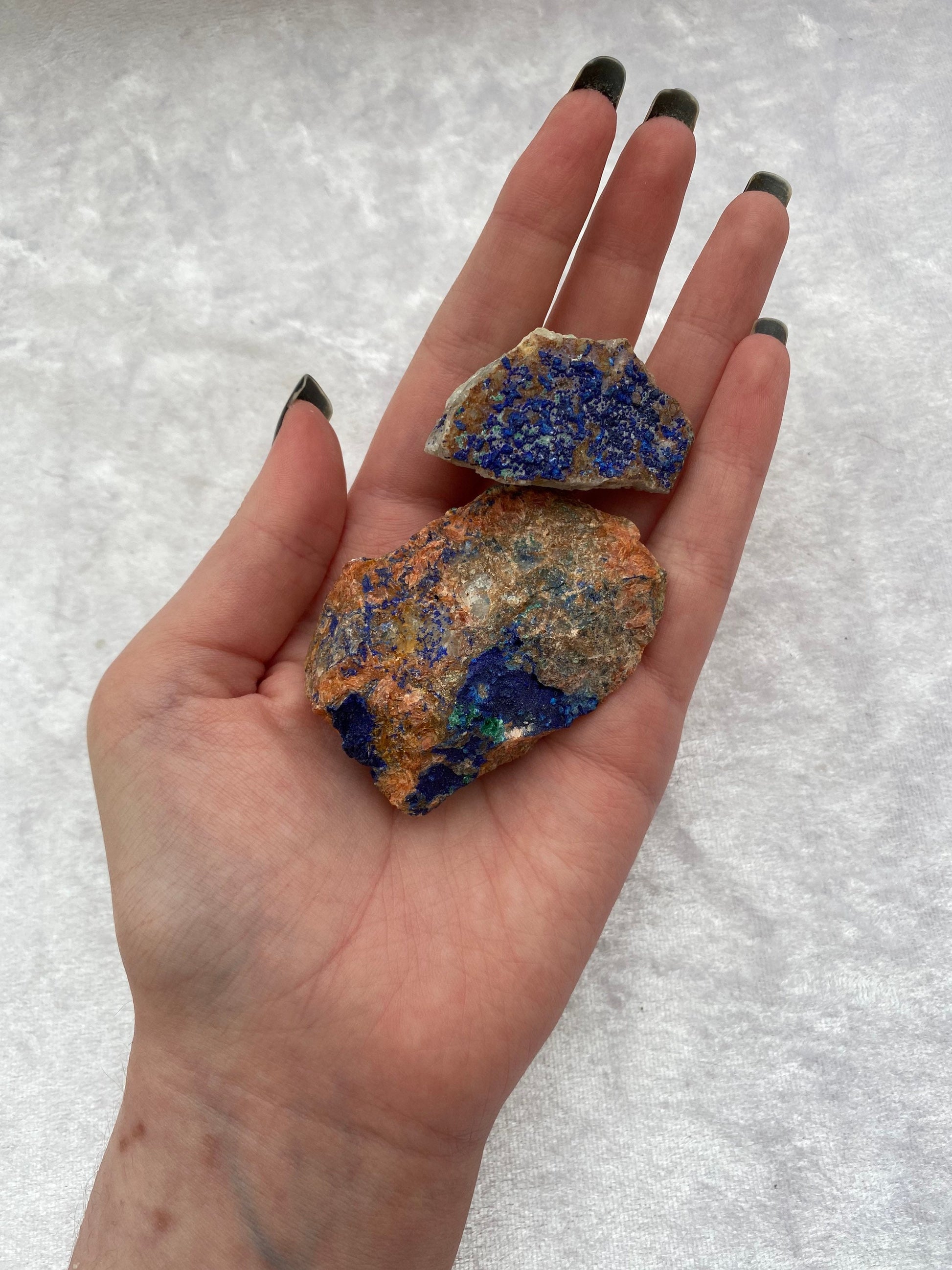 Azurite is a secondary mineral that usually forms when carbon-dioxide-laden waters descend into the Earth and react with subsurface copper ores. The carbonic acid of these waters dissolves small amounts of copper from the ore. Malachite is a secondary mineral of copper, which means it is formed when copper minerals are altered by other chemicals. It occurs when carbonated water interacts with copper minerals, or when a solution of copper interacts with limestone.