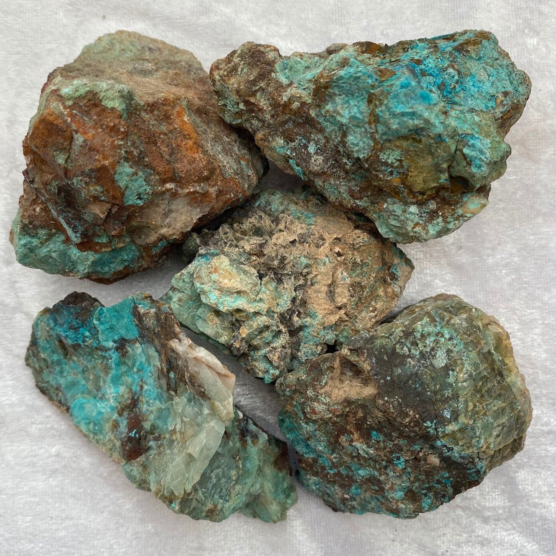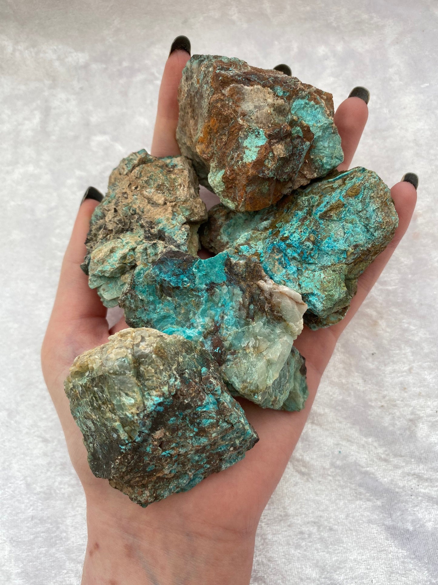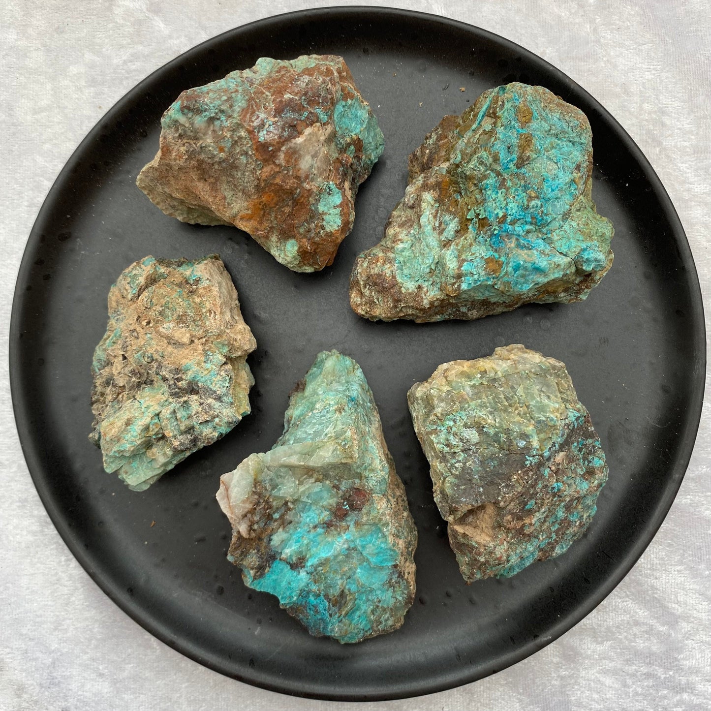 Chrysocolla is a sharply colored mineral which can be among the brightest shade of blue and green, and is caused by its copper content. Chrysocolla is often coated by a druzy layer of glossy clear Quartz, or intergrown together with the Quartz.