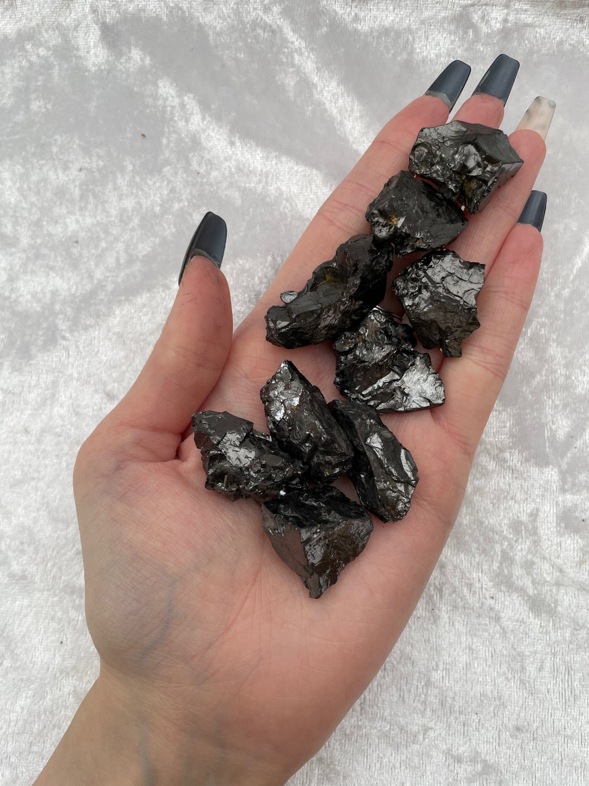 Shungite is a peculiar form of carbon produced by metamorphism of crude oil. Because it has no detectable molecular structure, shungite belongs among the mineraloids. It represents one of Earth's very first oil deposits, from deep in Precambrian time.