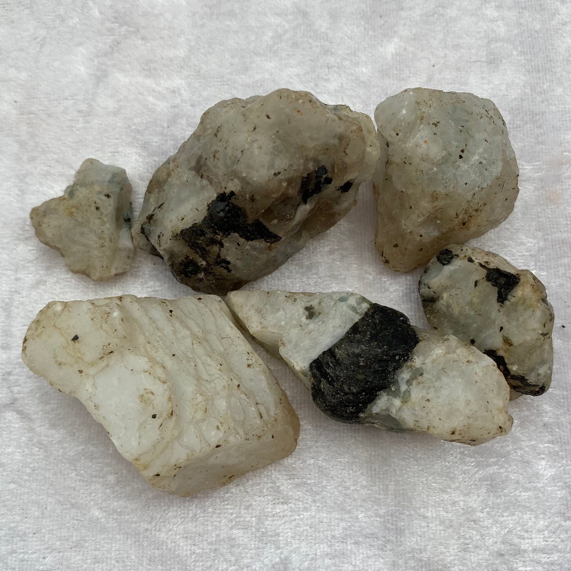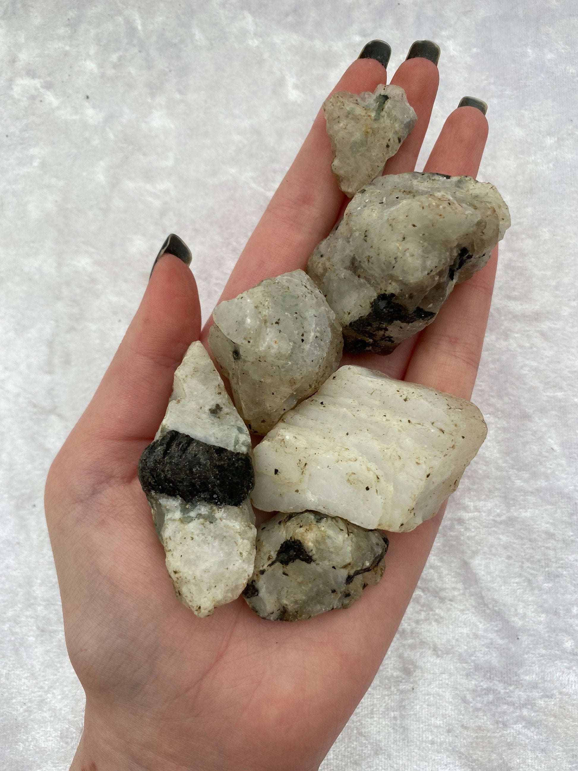 Moonstone is a variety of the feldspar-group mineral orthoclase. It’s composed of two feldspar minerals, orthoclase and albite. At first, the two minerals are intermingled. Then, as the newly formed mineral cools, the intergrown orthoclase and albite separate into stacked, alternating layers.